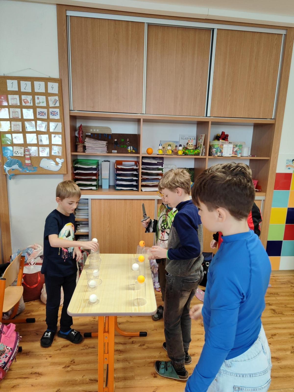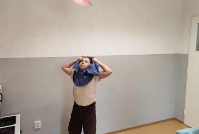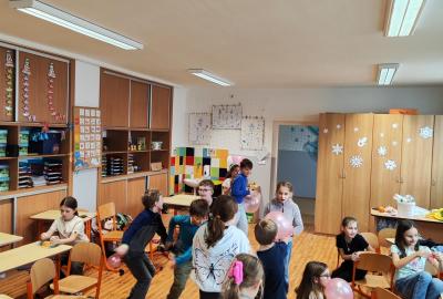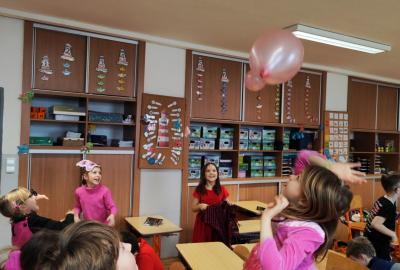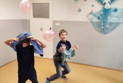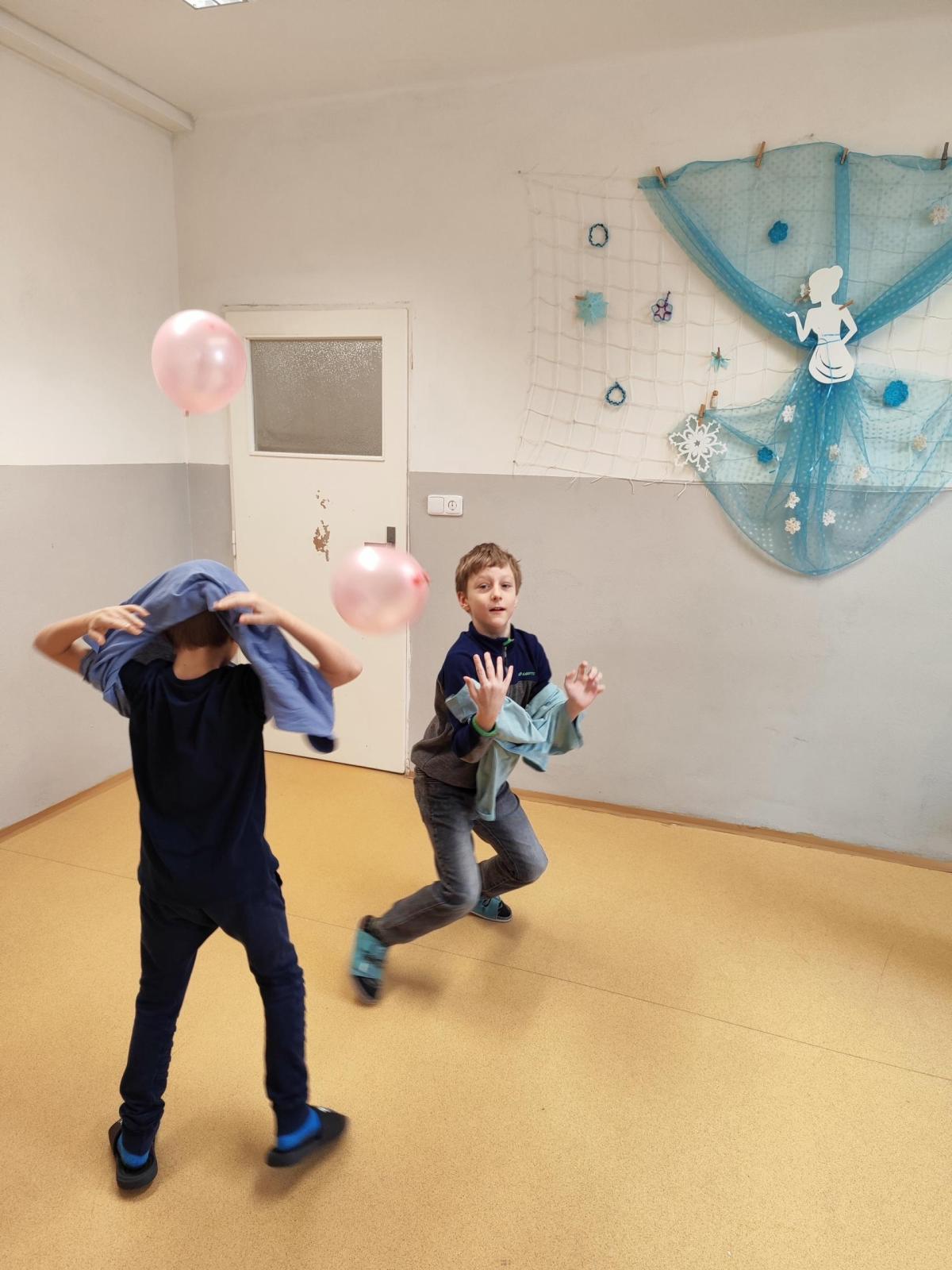 Nechyběl ani tanec s kamarády při oblíbené hře „nepusť míč“. Poté jsme si společně zatančili podle interaktivní tabule při programu Just Dance v rytmu disco hudby.