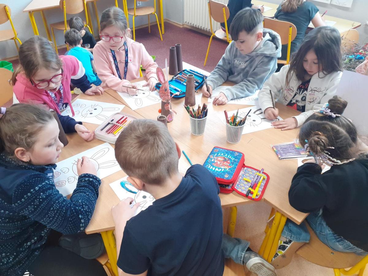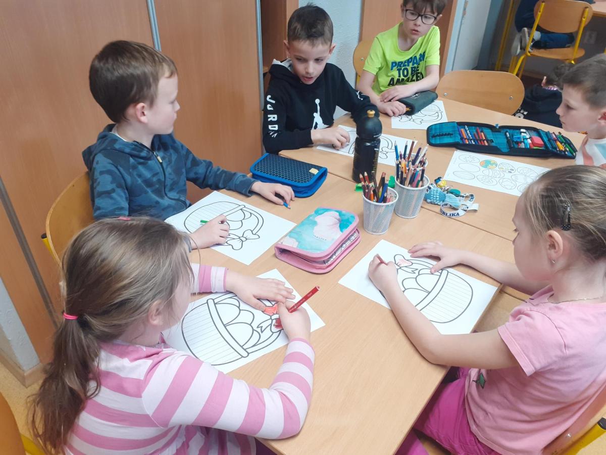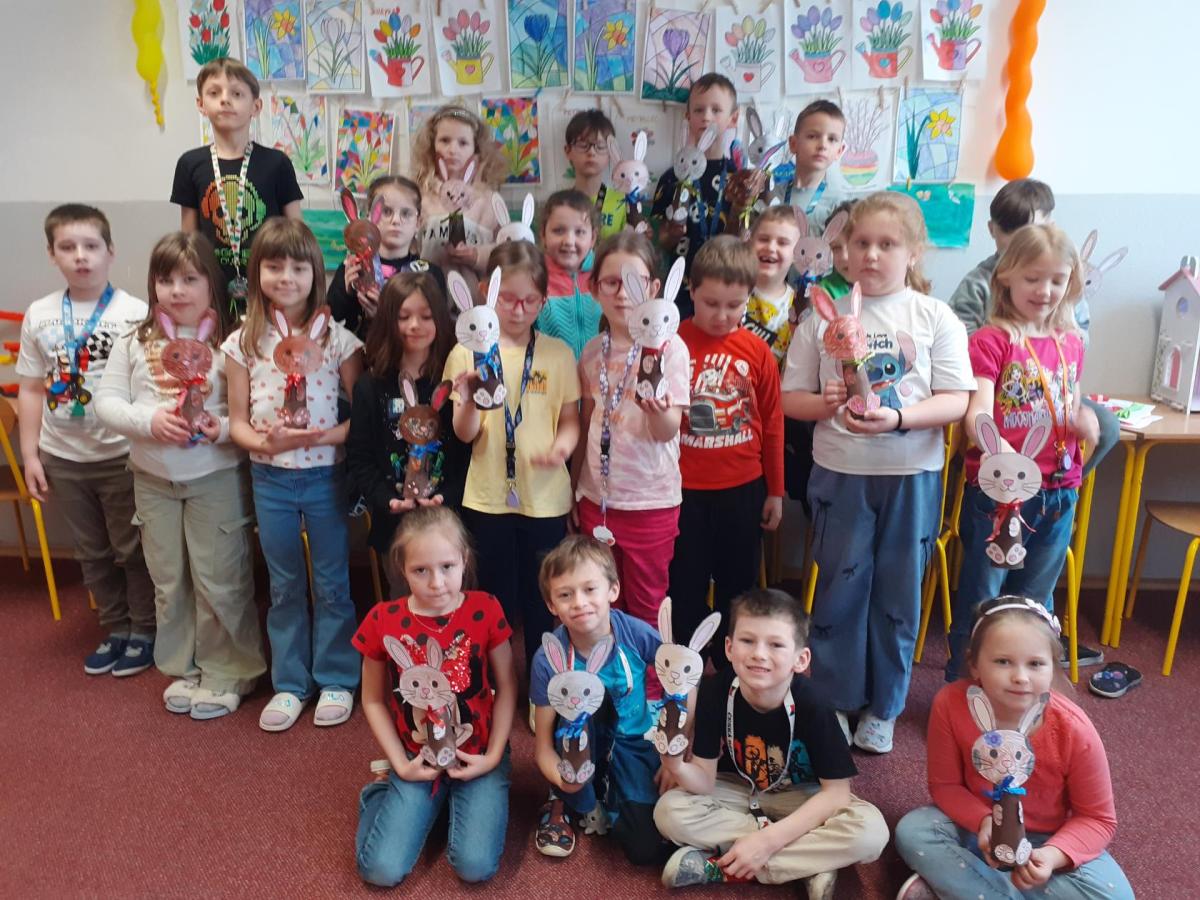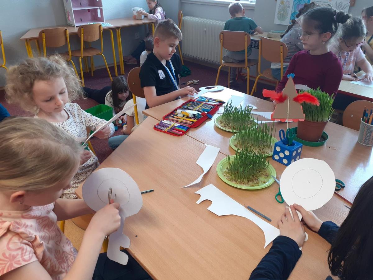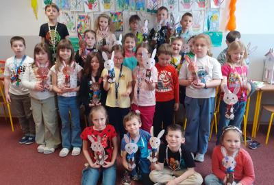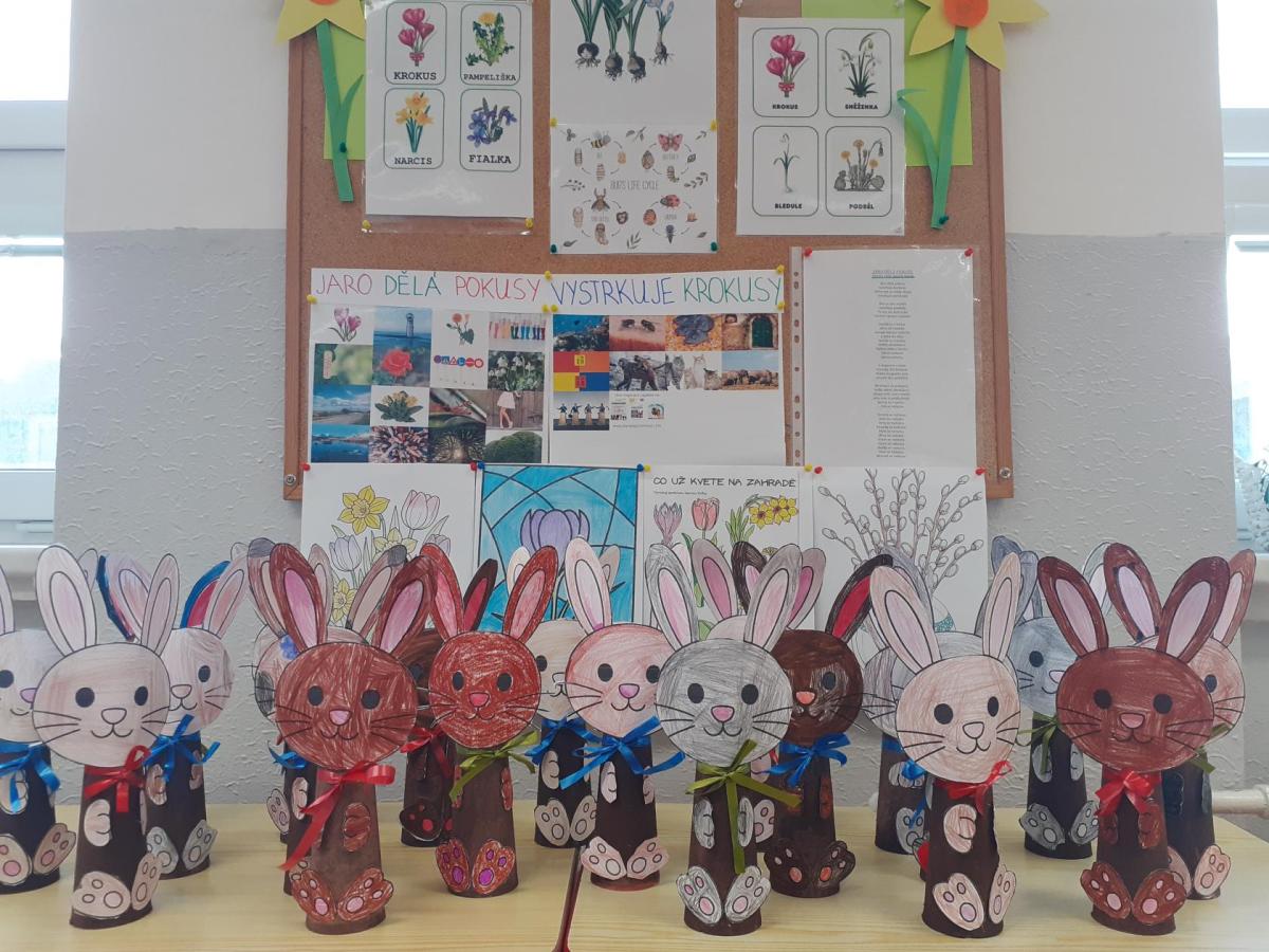 Děti svými výrobky přispěly do prodeje na Velikonočních trzích. Největší úspěch z velikonočního vyrábění měl zajíček, kterého si prvňáčci s radostí odnesli domů.