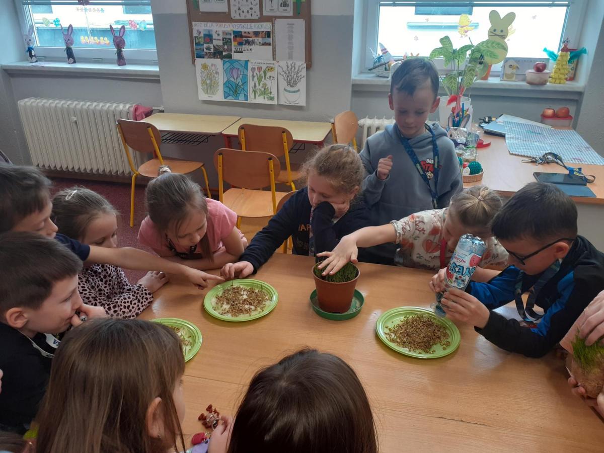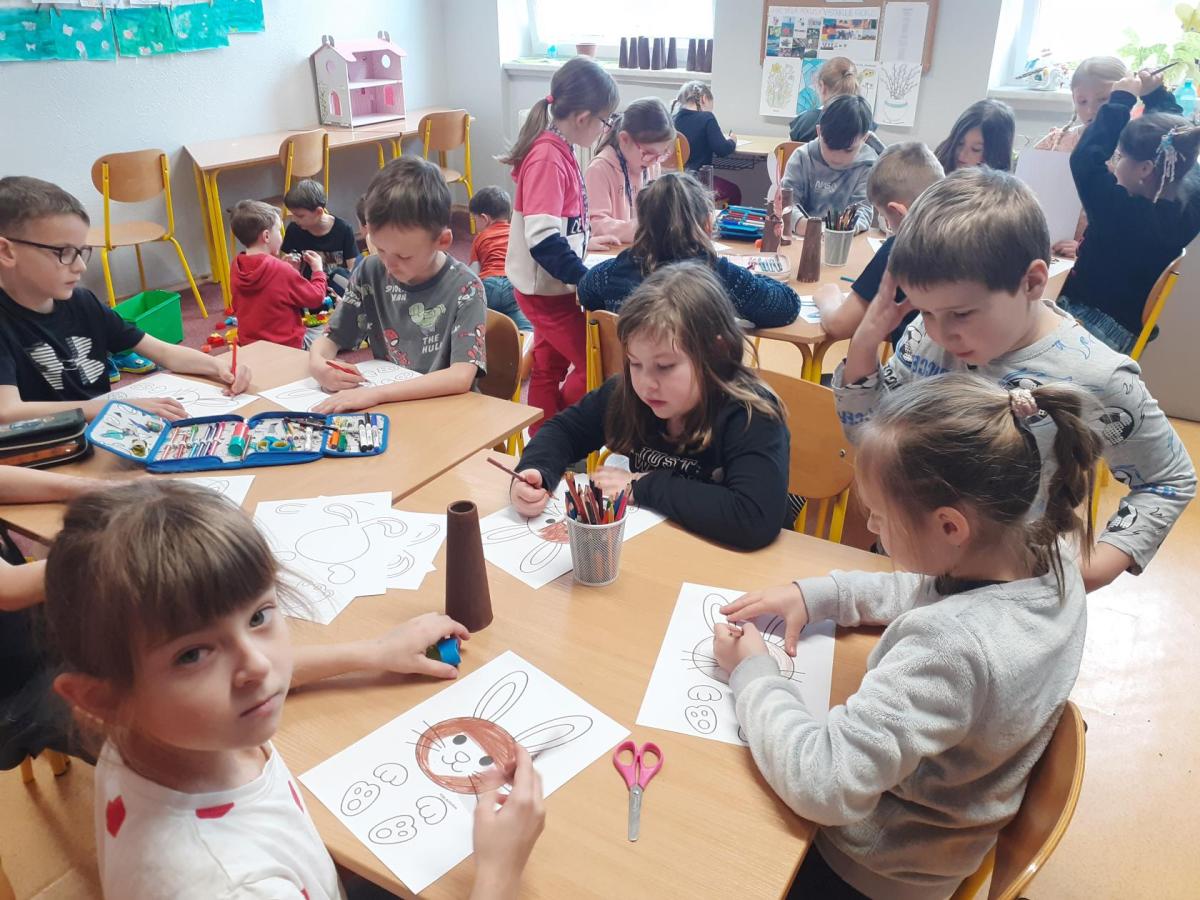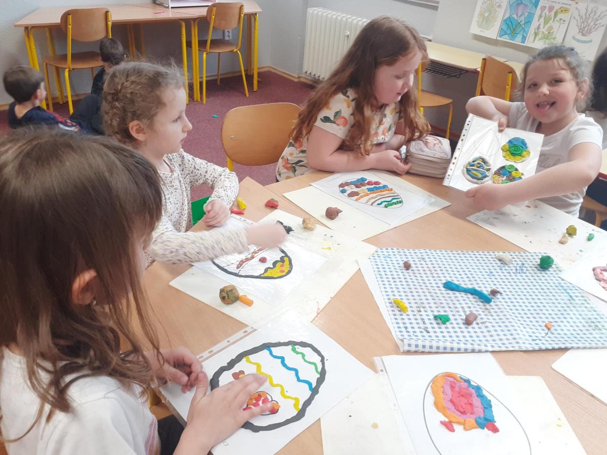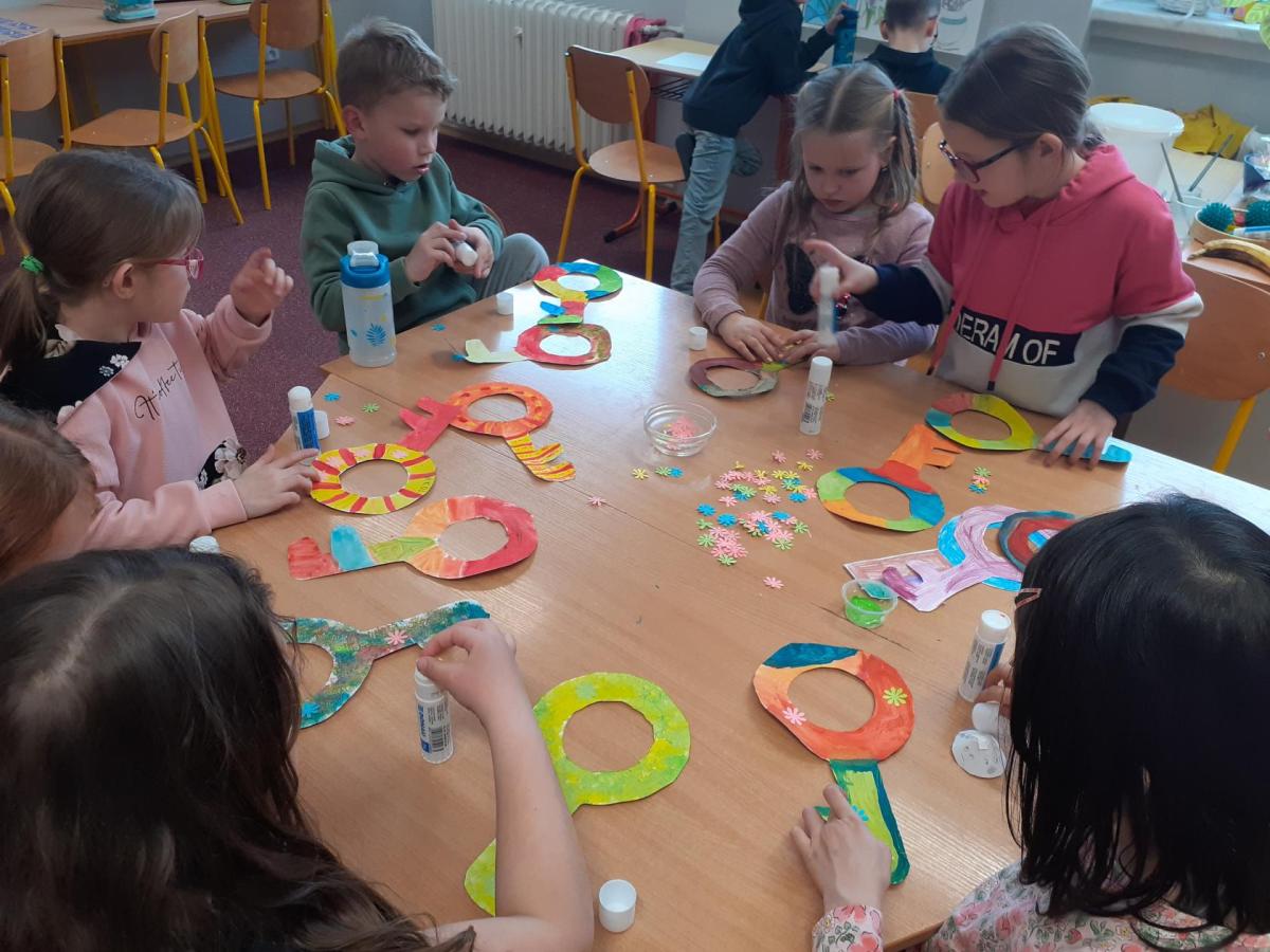 Děti svými výrobky přispěly do prodeje na Velikonočních trzích. Největší úspěch z velikonočního vyrábění měl zajíček, kterého si prvňáčci s radostí odnesli domů.