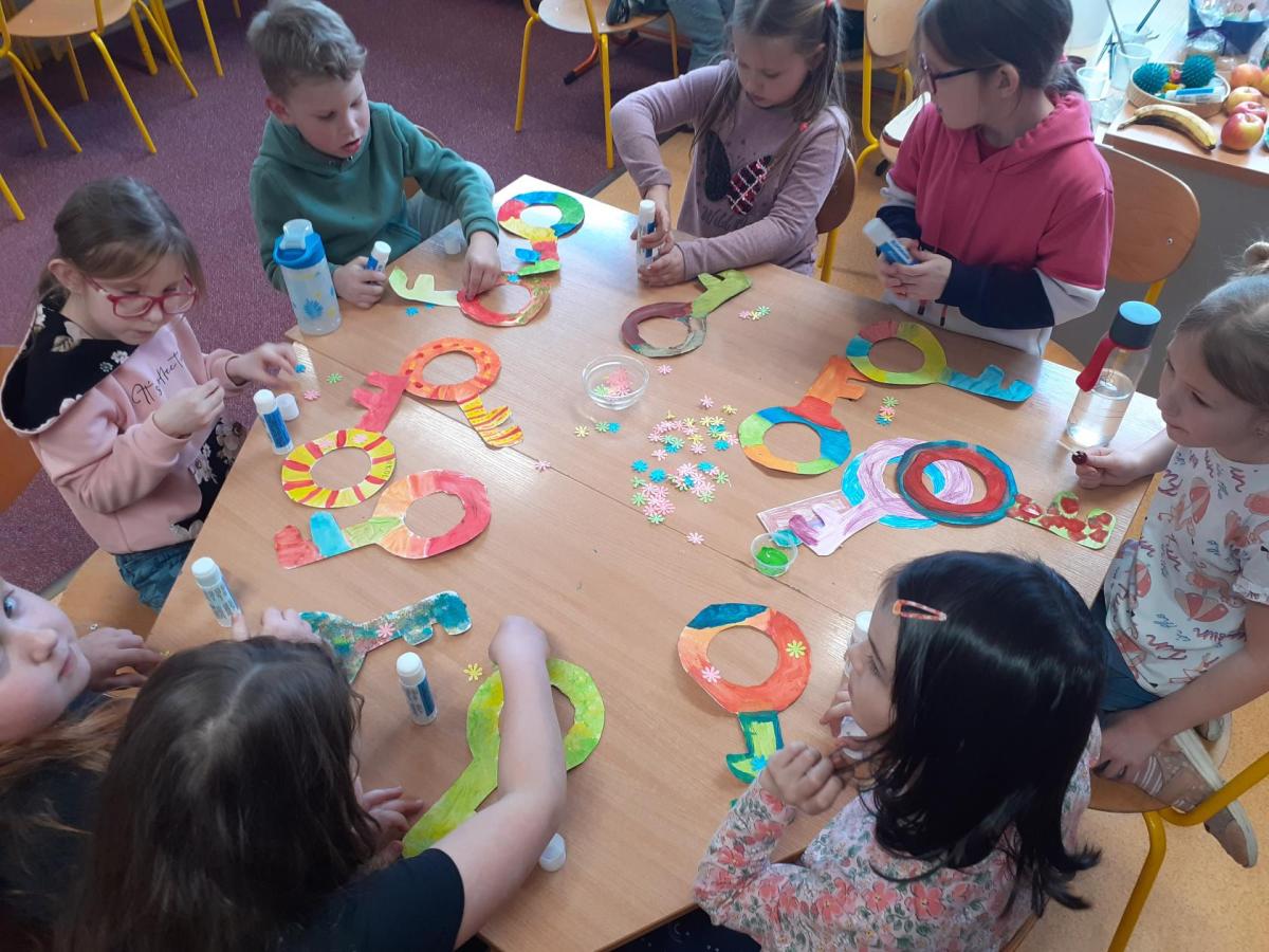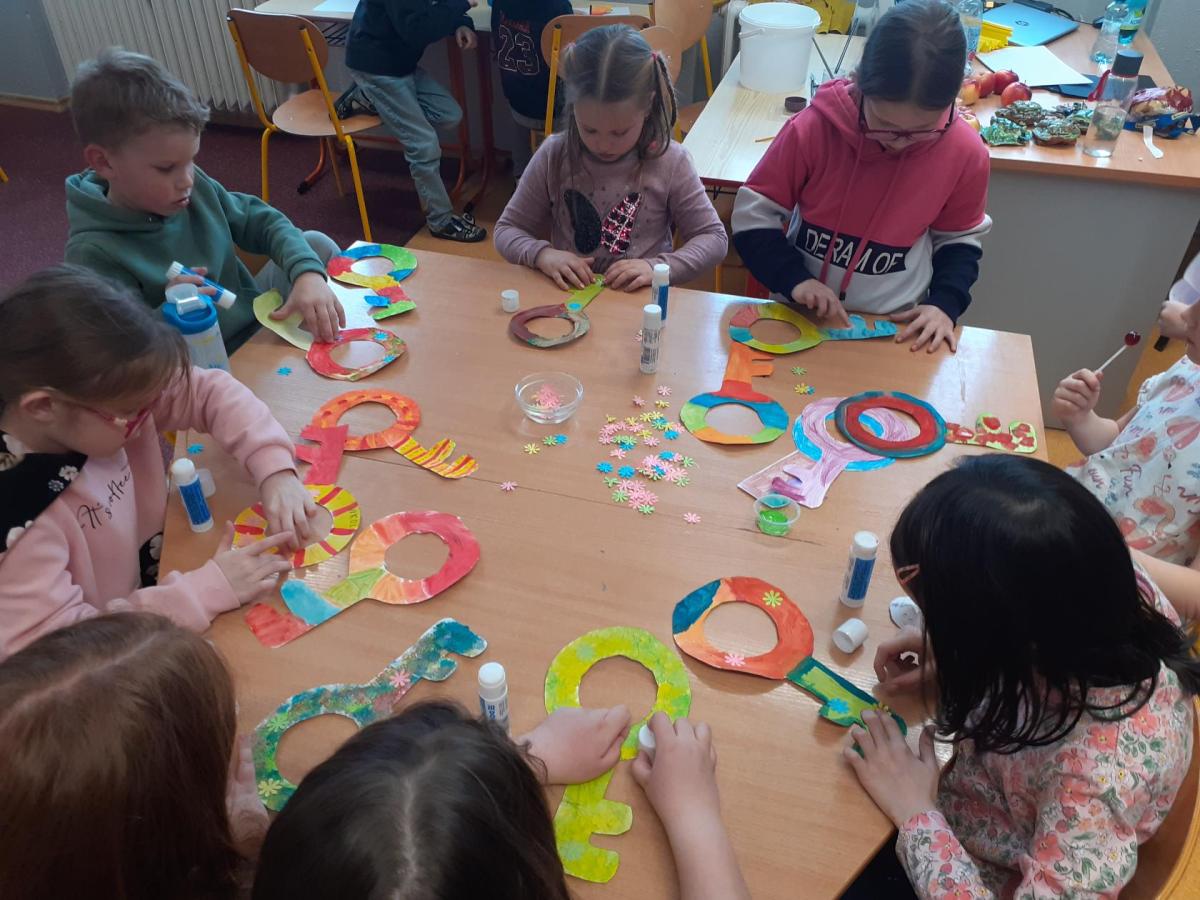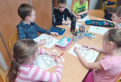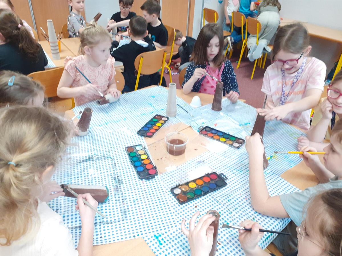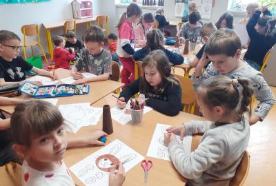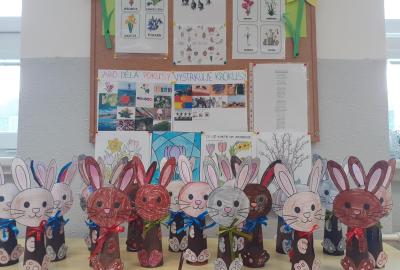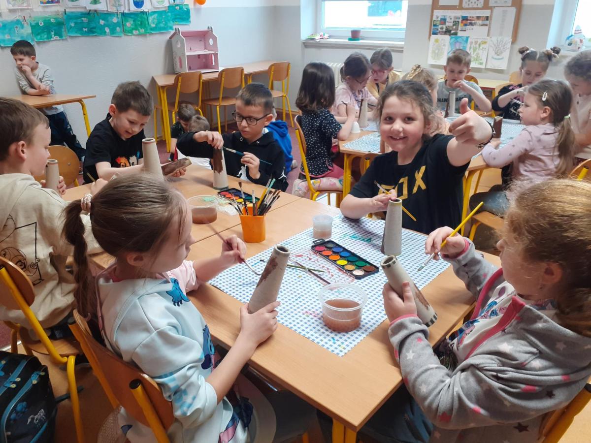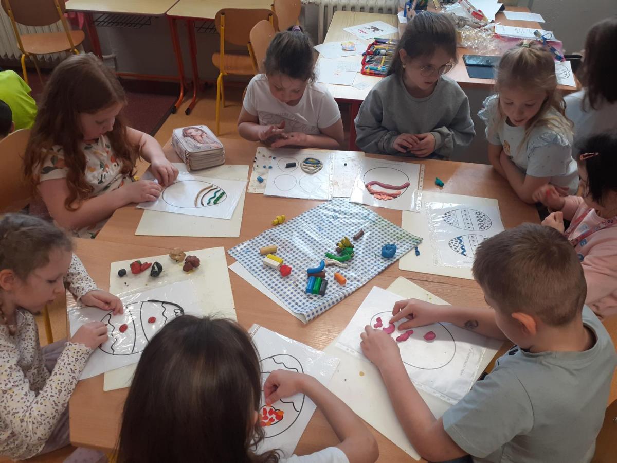 Děti svými výrobky přispěly do prodeje na Velikonočních trzích. Největší úspěch z velikonočního vyrábění měl zajíček, kterého si prvňáčci s radostí odnesli domů.