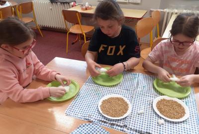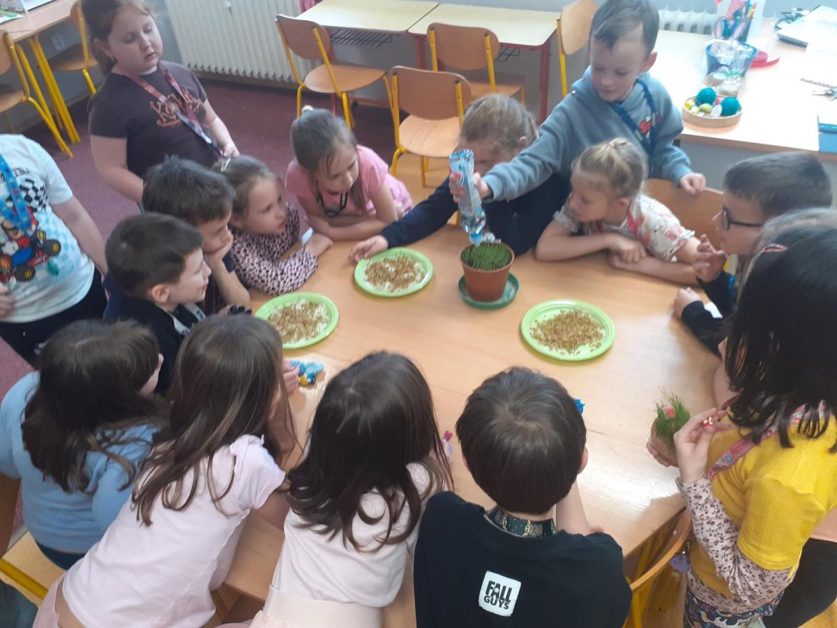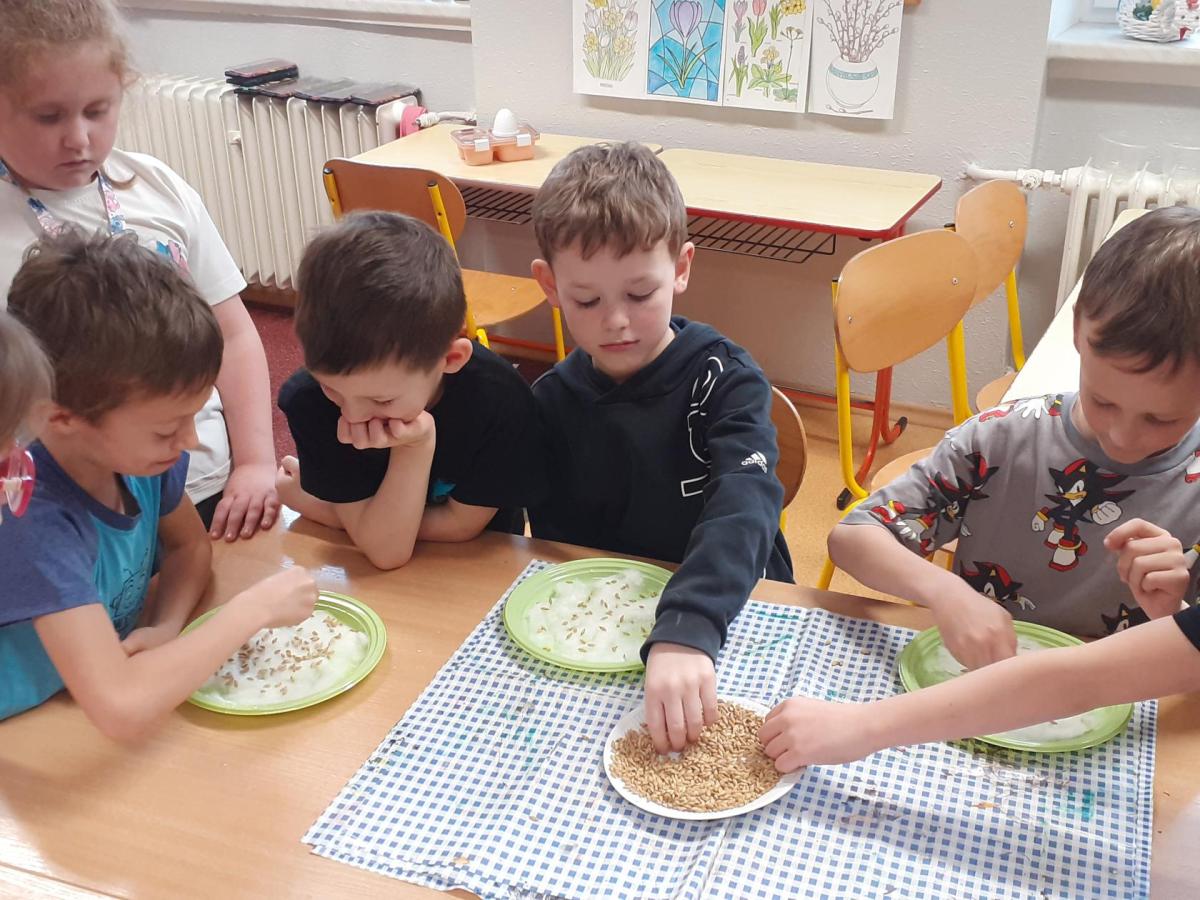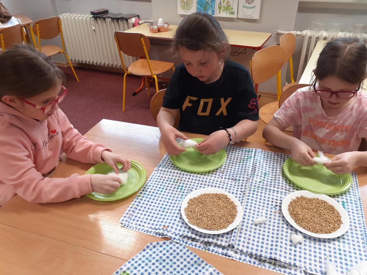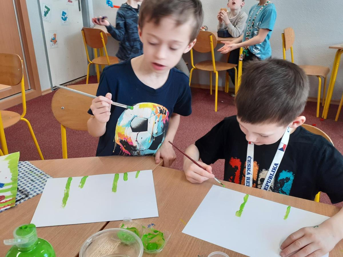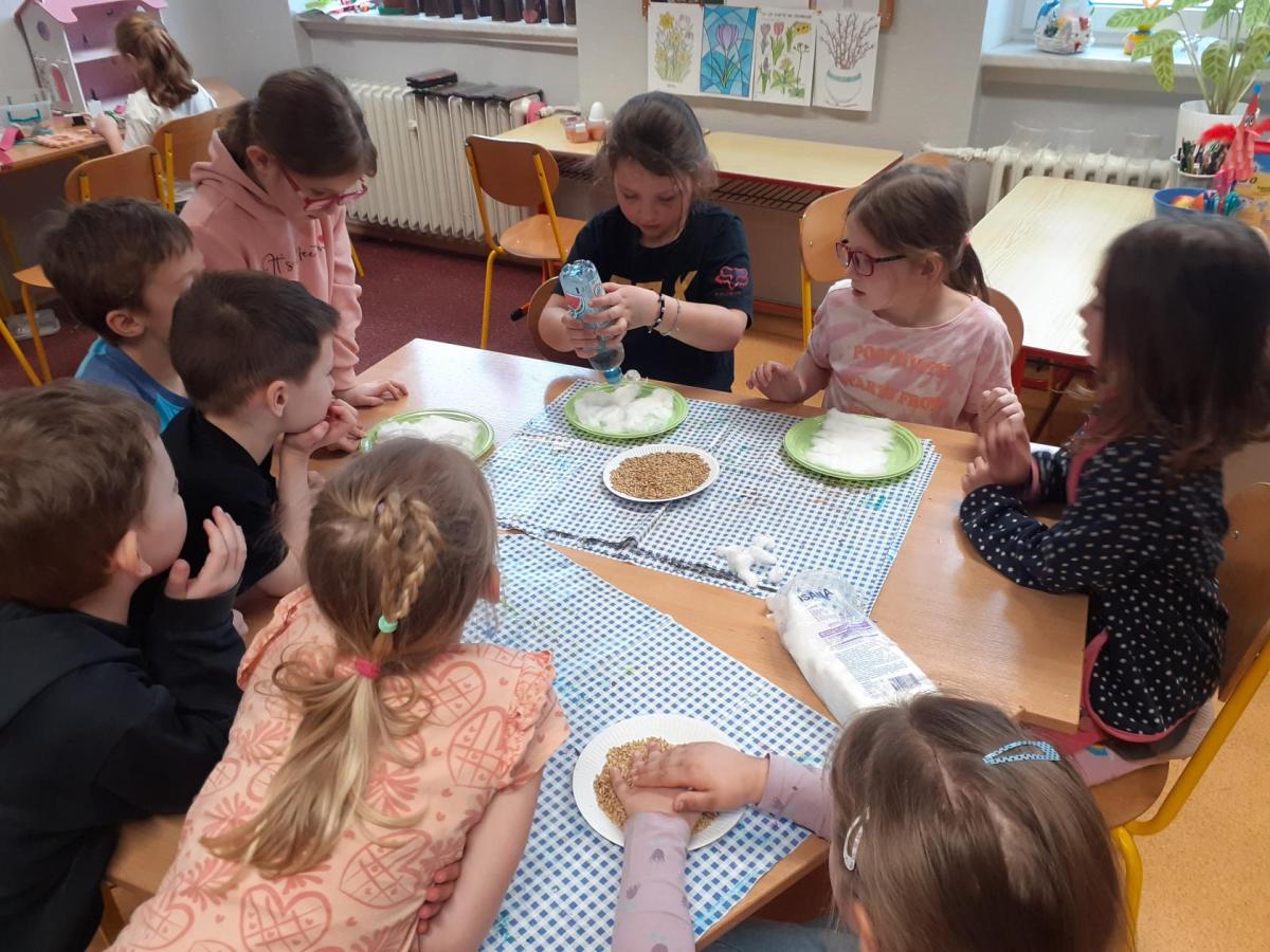 Přicházející jaro se promítlo i do našeho tvoření. Celá družina rozkvetla všemi barvami a pomocí vodovek a temper jsme si vytvořili jarní louku s nejznámějšími květinami, kam si každý umístil svého hmyzáka. Také jsme zaseli osení a pozorovali, jak semínko ožívá a vyvíjí se v novou rostlinu.
