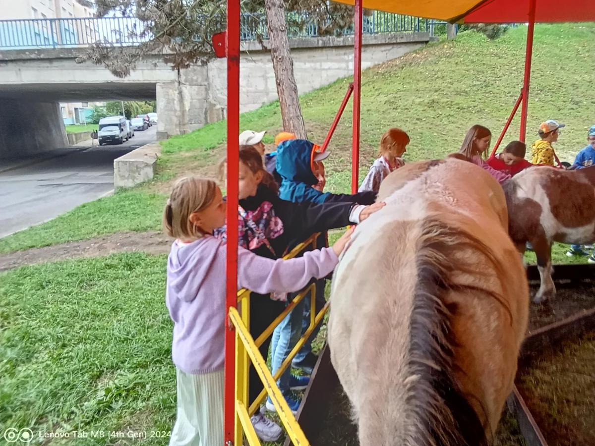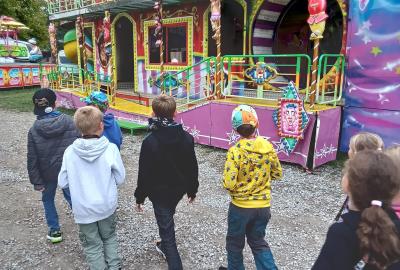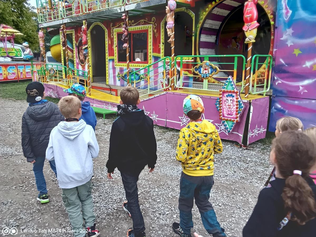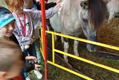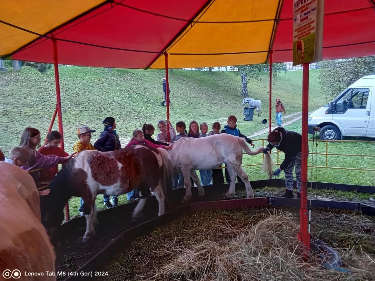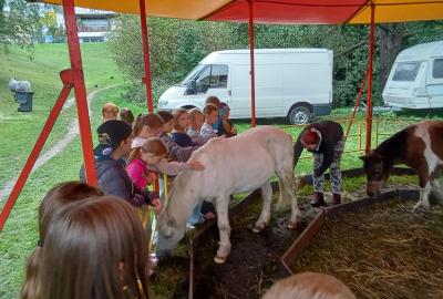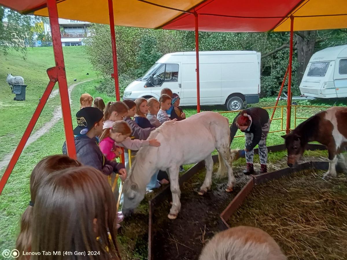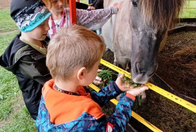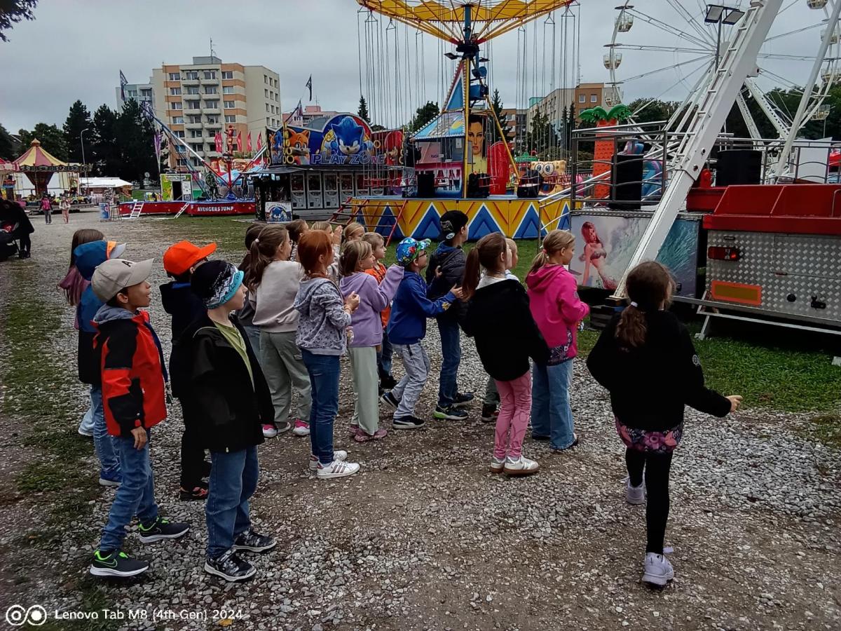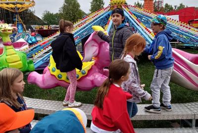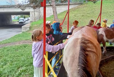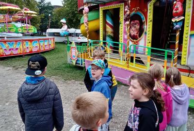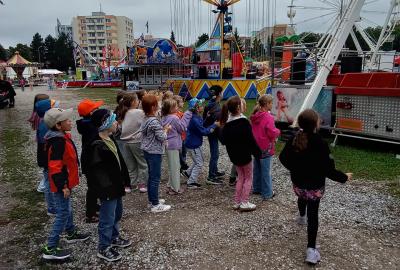 Děti si ve školní družině nejen vyrobily kolotoč, ale také se šly podívat na pouťové atrakce. I když nebylo moc hezké počasí, tak si alespoň pohladily koníčky.