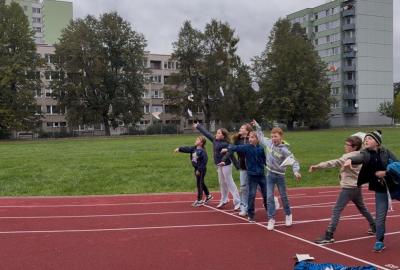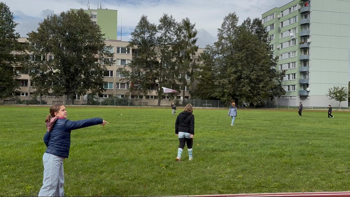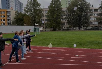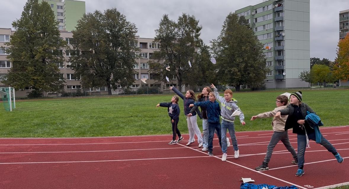 Využili jsme také podzimního větru. Na hřišti jsme skládali papírové vlaštovky a zkoušeli, která doletí nejdál. Vítr nám přál, a tak byla obloha chvíli plná létajících papírových „letadel“. Děti měly radost z pohybu i z toho, že se jejich vlaštovky skutečně vznesly vysoko.