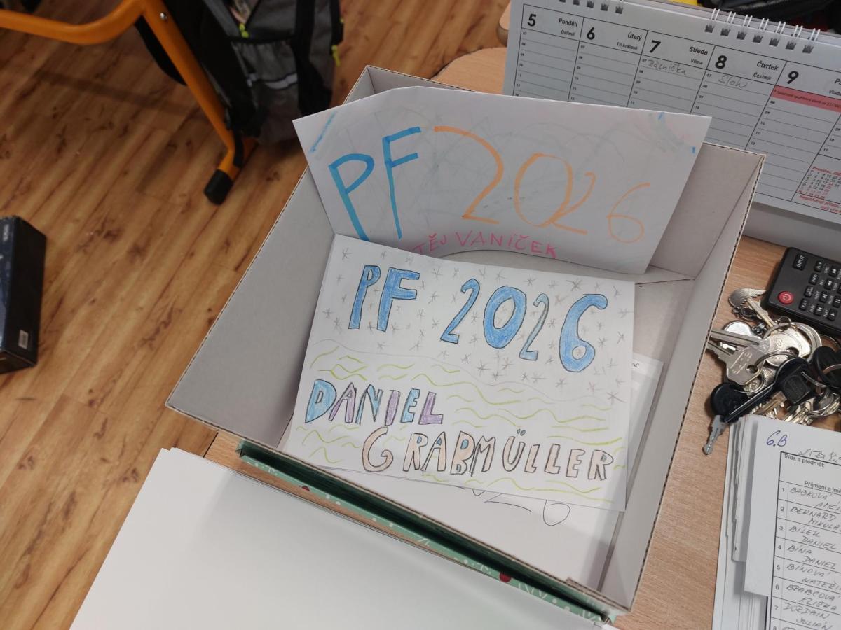 V úterý ráno jsme využili první společnou lednovou hodinu výchovy ke zdraví k novoročnímu přípitku, sešli jsme se ve škole v ten den v plném počtu, sdíleli jsme zážitky z prázdnin a vytvořili si PF 2026. Každý žák napsal sám sobě, co by si přál, aby se mu v letošním roce povedlo, co by chtěl zlepšit, jaká má očekávání ve škole, doma nebo mezi kamarády. Dopisy sobě jsme uložili do vánoční krabice a příští Vánoce v prosinci si je rozdáme, každý si pak sám vyhodnotí, co mu celý rok přinesl a zda se jeho očekávání a přání vyplnila.