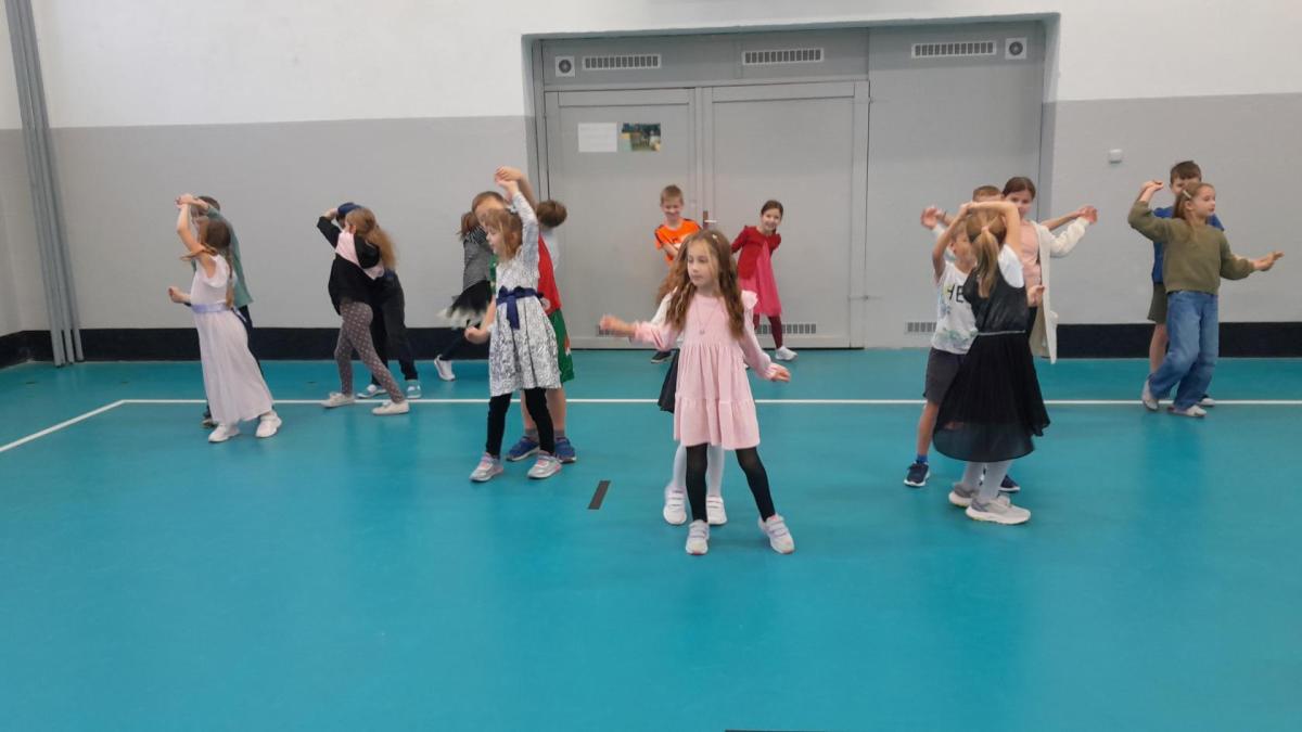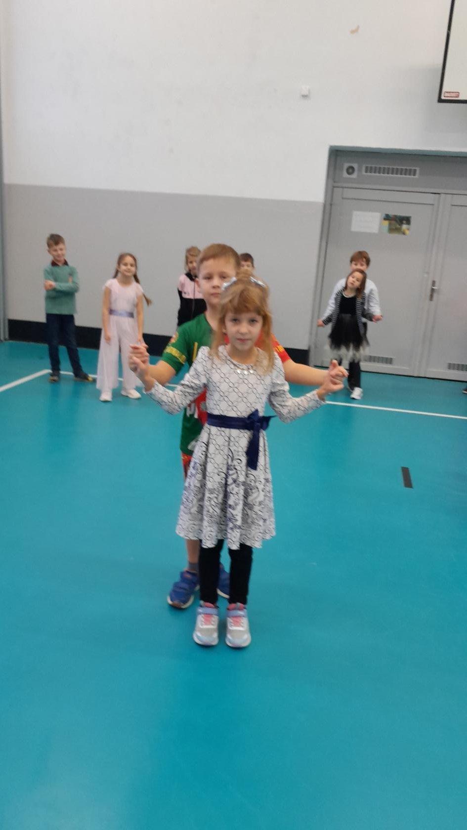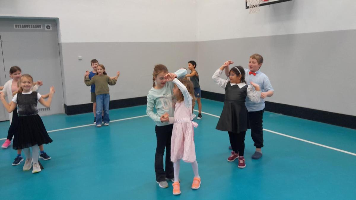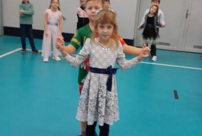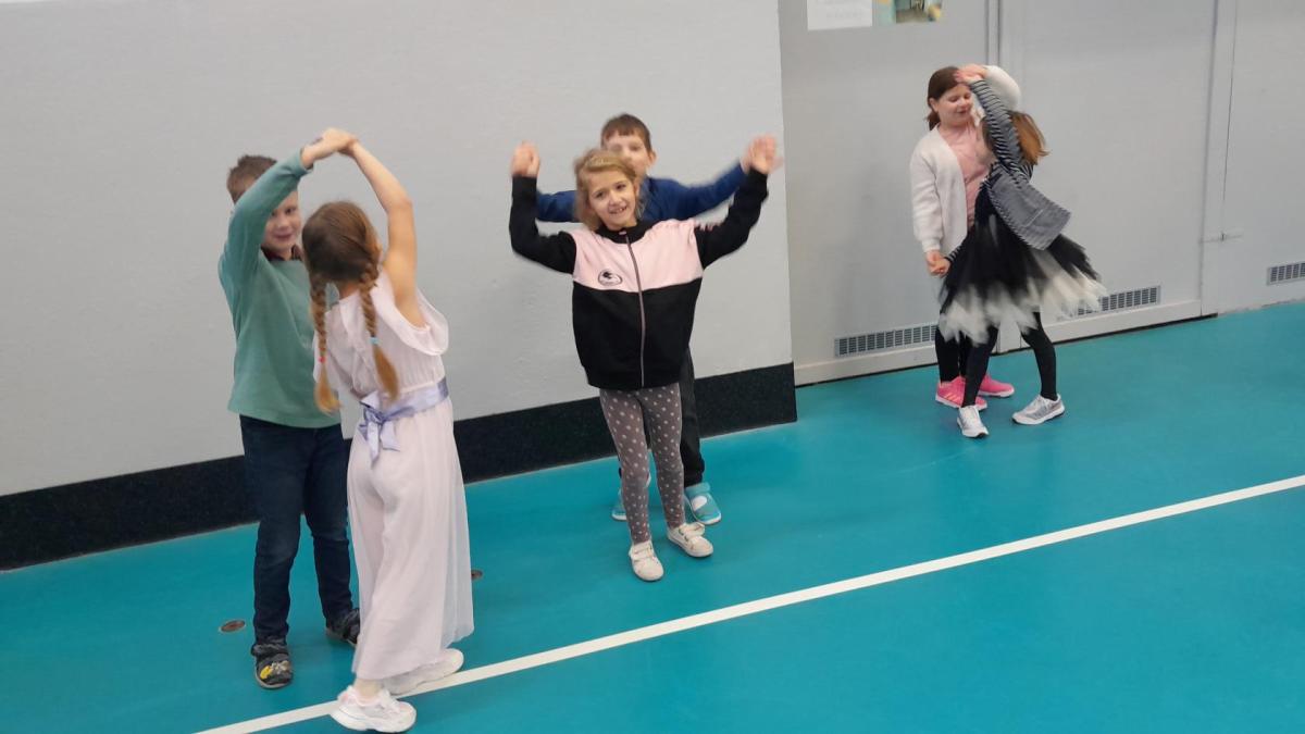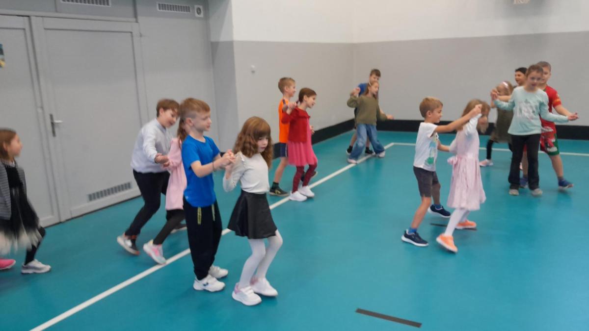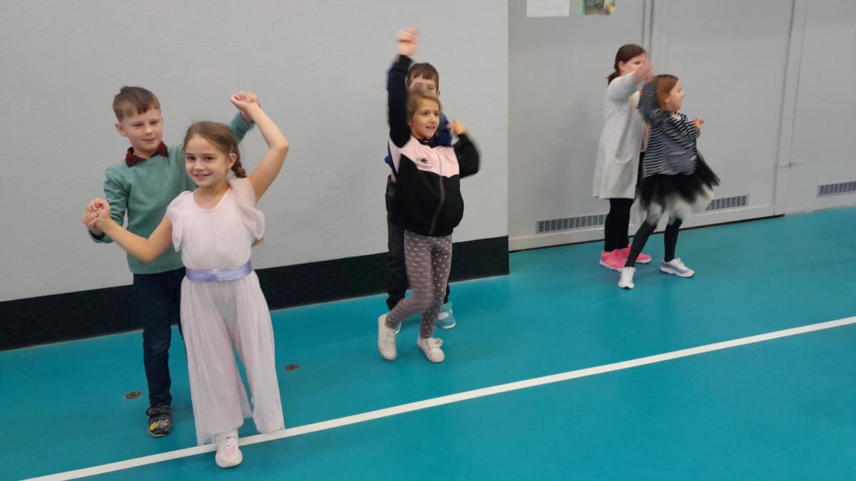 Naprostá většina dětí přišla ve slavnostním oblečení a protože jsme měli první hodinu tělocvik, zkusili jsme si, jaké to bude jednou v tanečních. Naučili jsme se mazurku a předvedli si některé jednoduché taneční kroky.