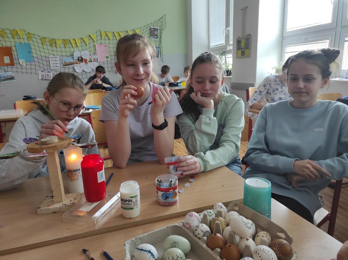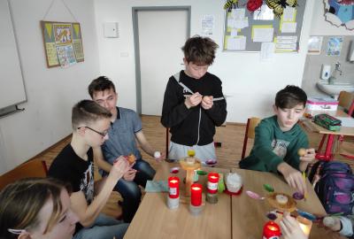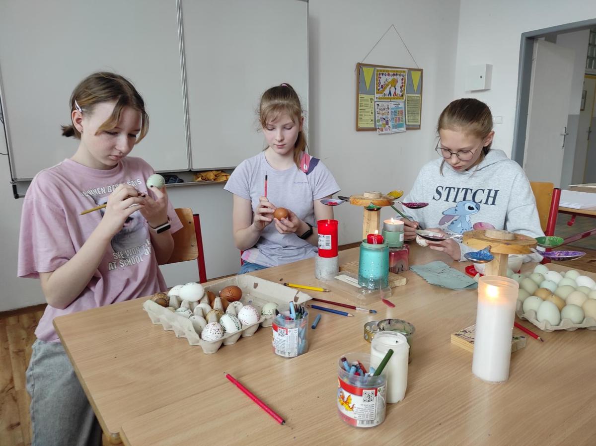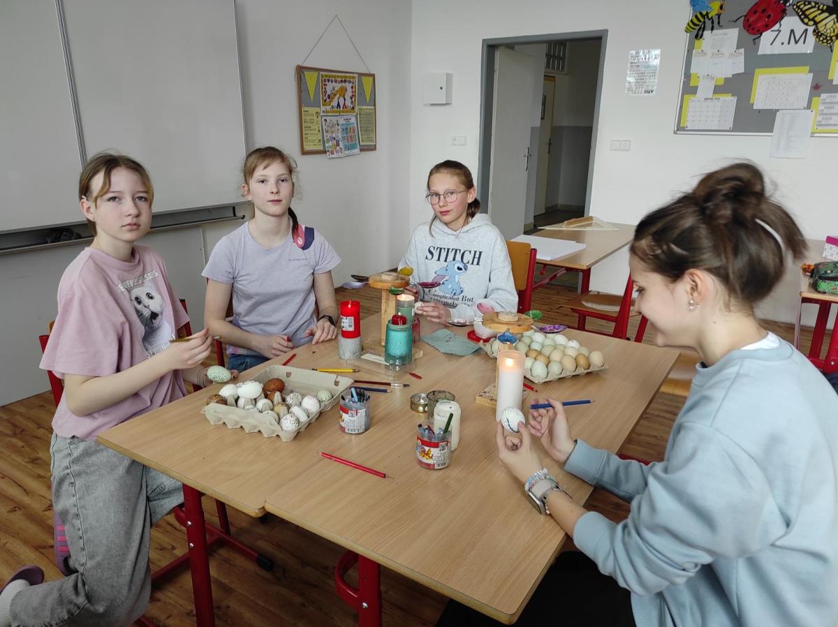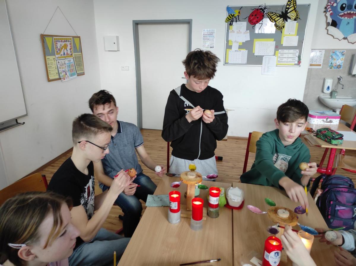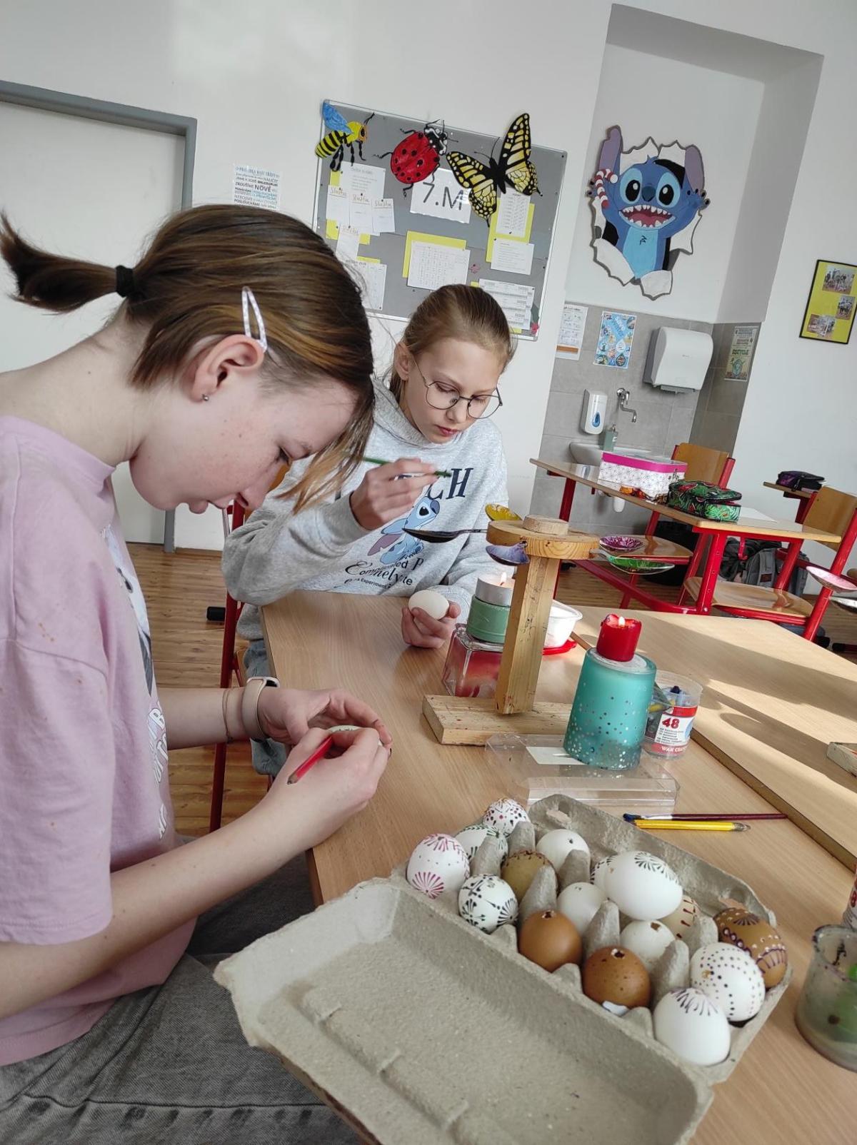 I 7.M si tento týden vyzkoušela tradiční techniku zdobení velikonočních kraslic. Barvení vajíček barevnými vosky se dětem zalíbilo a se svými výrobky se zúčastnily Velikonoční soutěže ve školní jídelně.