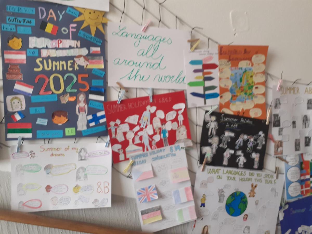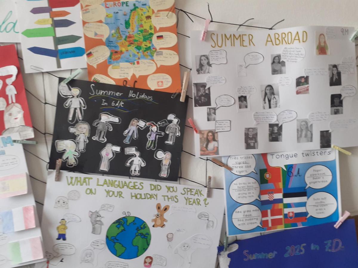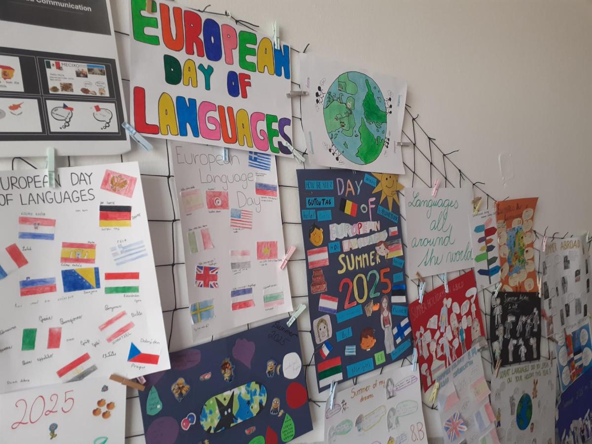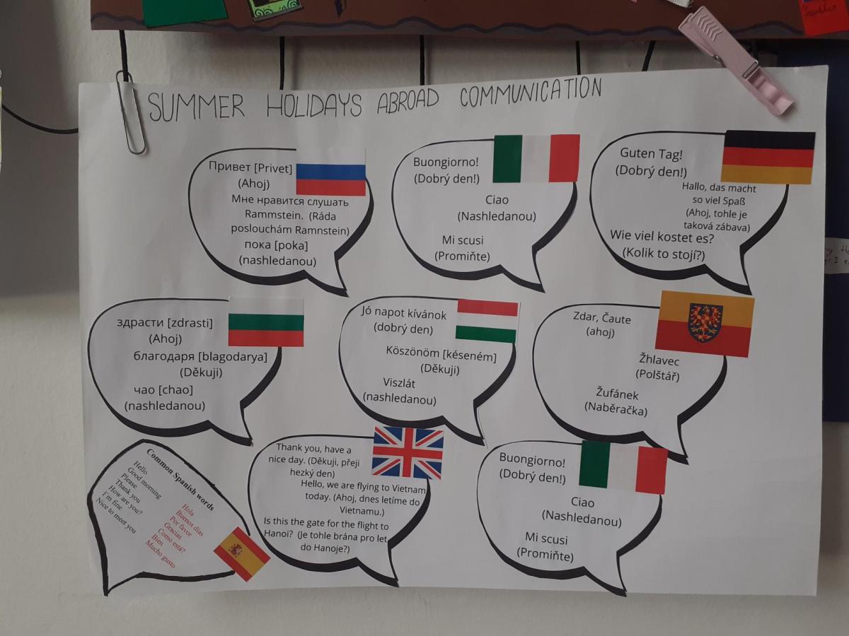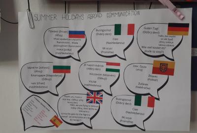 Propagace studia jazyků je nedílnou součástí našeho vzdělávání. I letos jsme 26. září na Evropský den jazyků odstartovali v rámci hodin anglického jazyka různé aktivity napříč ročníky 2. stupně. Ohlédnutím se za uplynulými prázdninami jsme zvolili společné komunikované téma: Komunikace v zahraničí během letních prázdnin. Žáci pod vedením svých učitelů anglického jazyka pracovali na různých aktivitách ve skupinách, ve dvojicích nebo individuálně. Náplní byly nejen dialogy, ale např. prezentace destinací, které žáci během léta navštívili. Někteří zavzpomínali na fráze a věty, které v různých zemích slyšeli či sami použili. Jako výstup žáci zpracovali nápadité projekty ve formátu A4 i více, které nyní zdobí boční stěnu schodiště vedoucí do vrchních pater 2. stupně. Tato cesta vzhůru, možná právě symbolicky, naznačuje, že díky komunikačním dovednostem a schopnostem se domluvit v jiném kulturním prostředí, máme šanci se lépe uplatnit a uspět v dnešním světě. Každý jazyk rozšiřuje naše obzory, umožňuje nám lépe porozumět jiným lidem a kulturám a obohacuje nás o nové dovednosti. Přísloví, které je připisováno J.A.Komenskému naznačuje, že znalost jazyků zvyšuje naši osobní hodnotu a rozšiřuje naše chápaní světa.