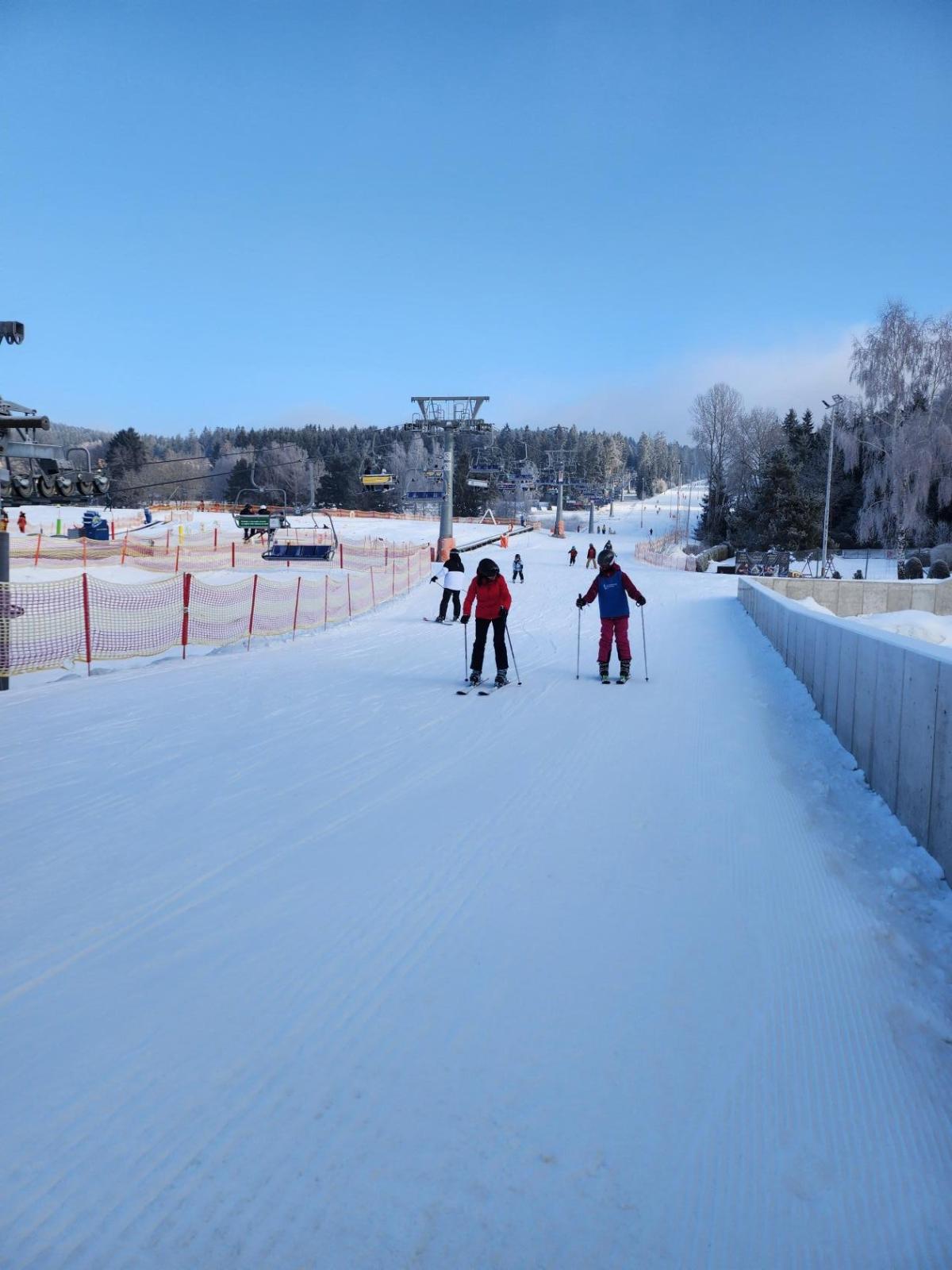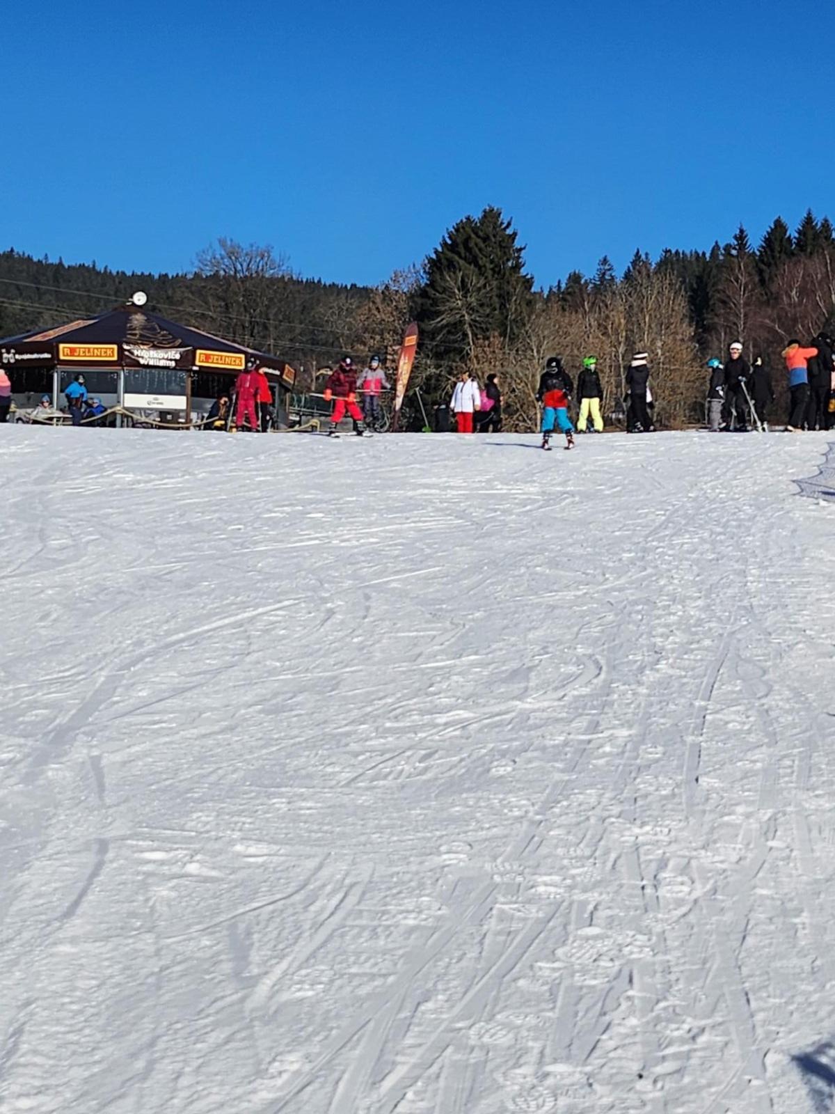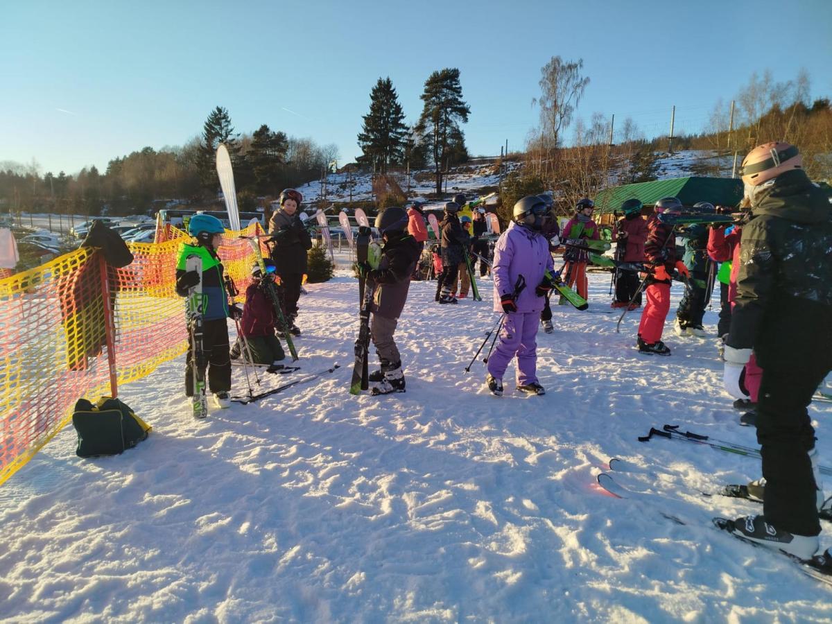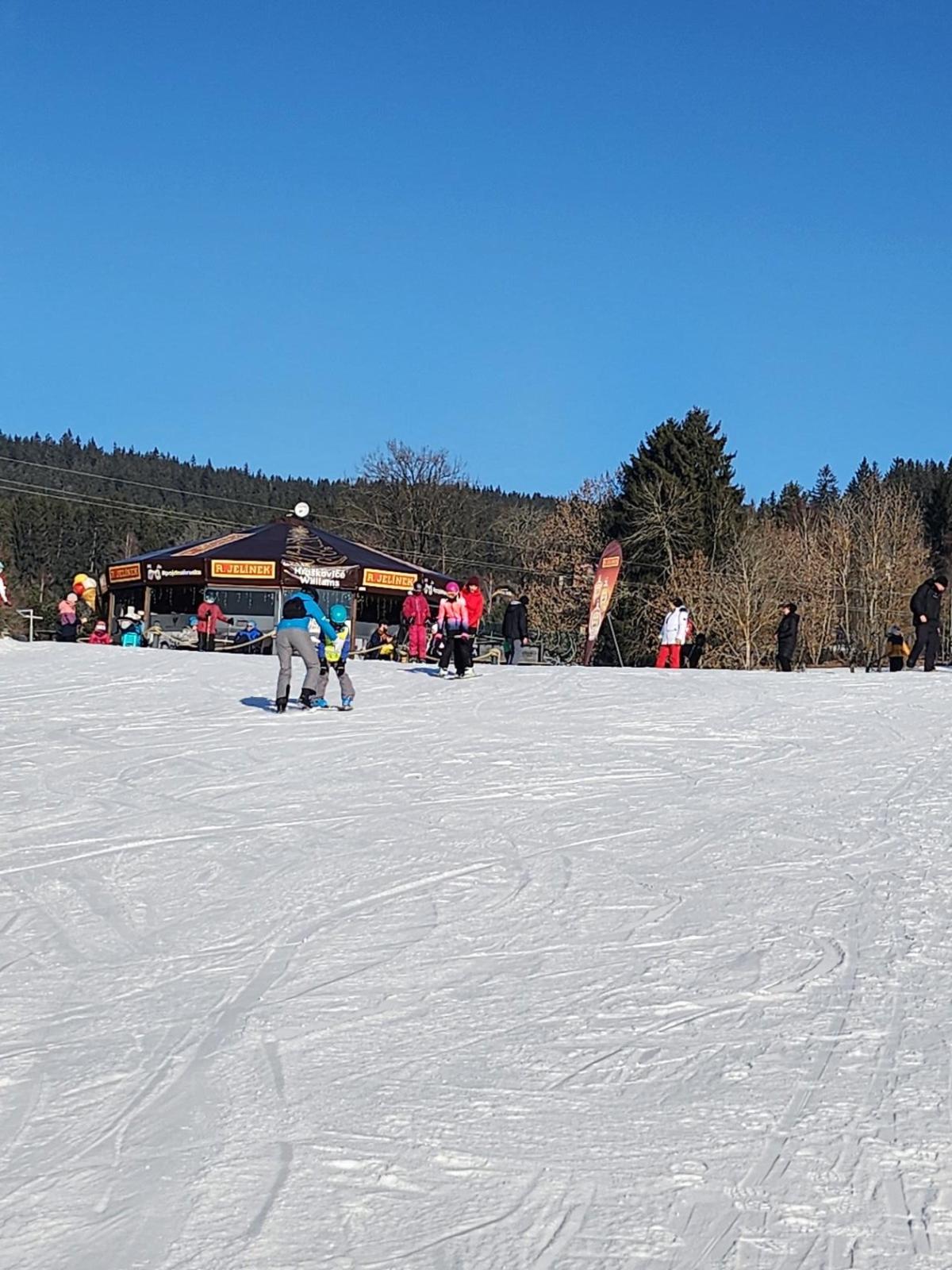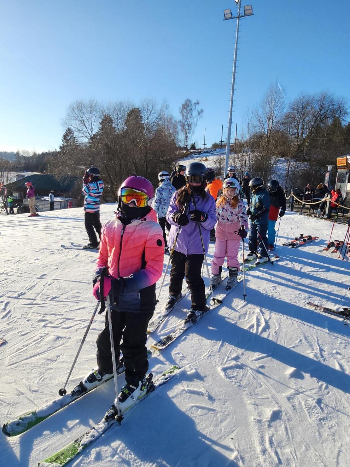 Přivítalo nás mrazivé, ale přesto slunečné ráno. Ani -13°C venku a dokonce ani -5°C v autobuse (před zatopením), nás nedokázalo odradit. A proto jsme vyrazili na lyžovačku. Mráz se nad námi smiloval a tak jsme se opravdu zapotili.