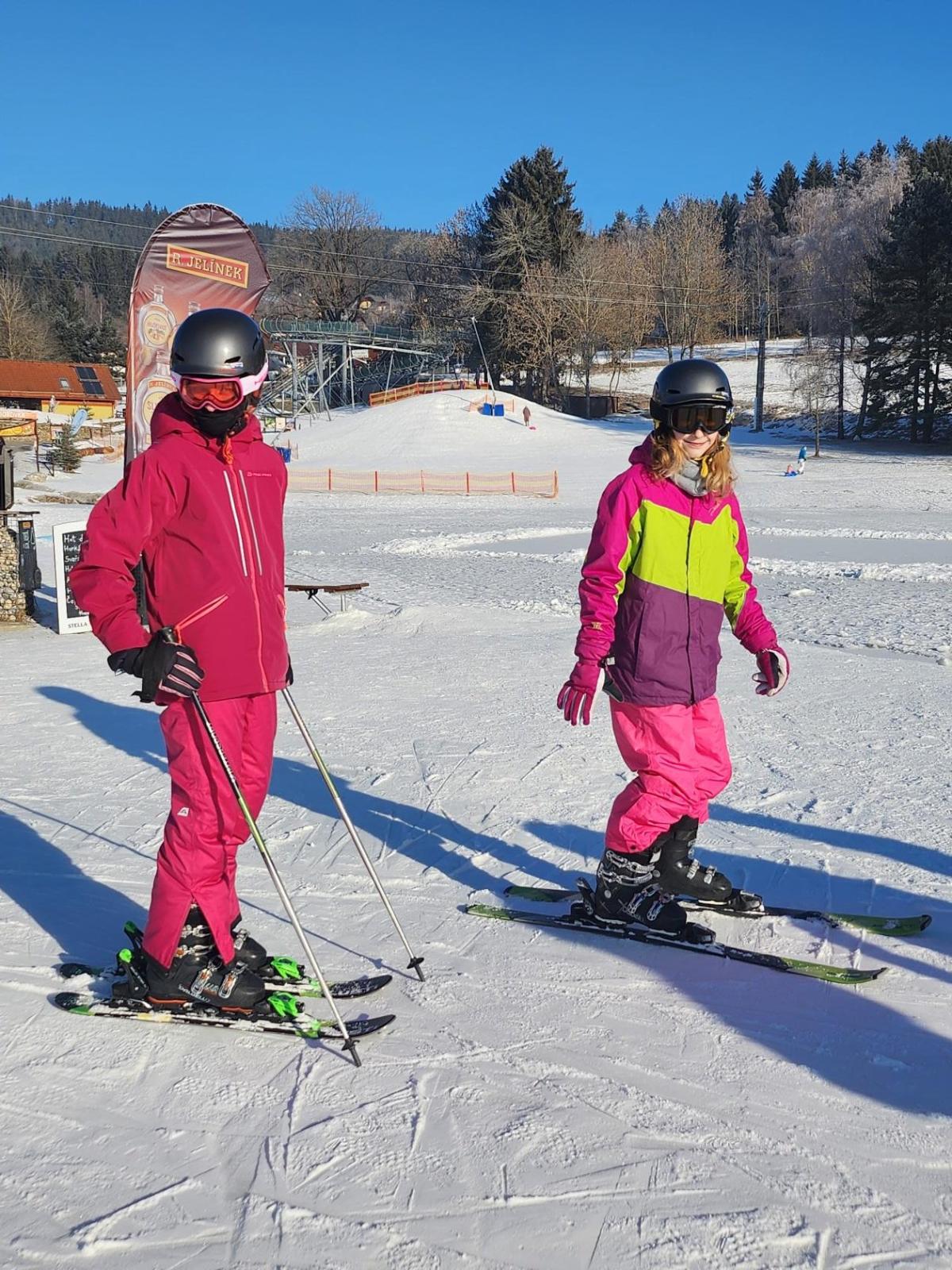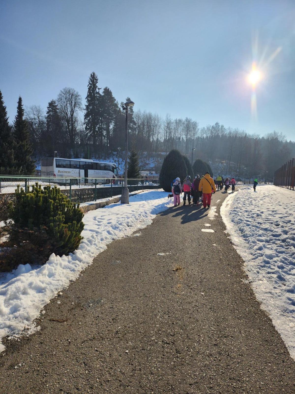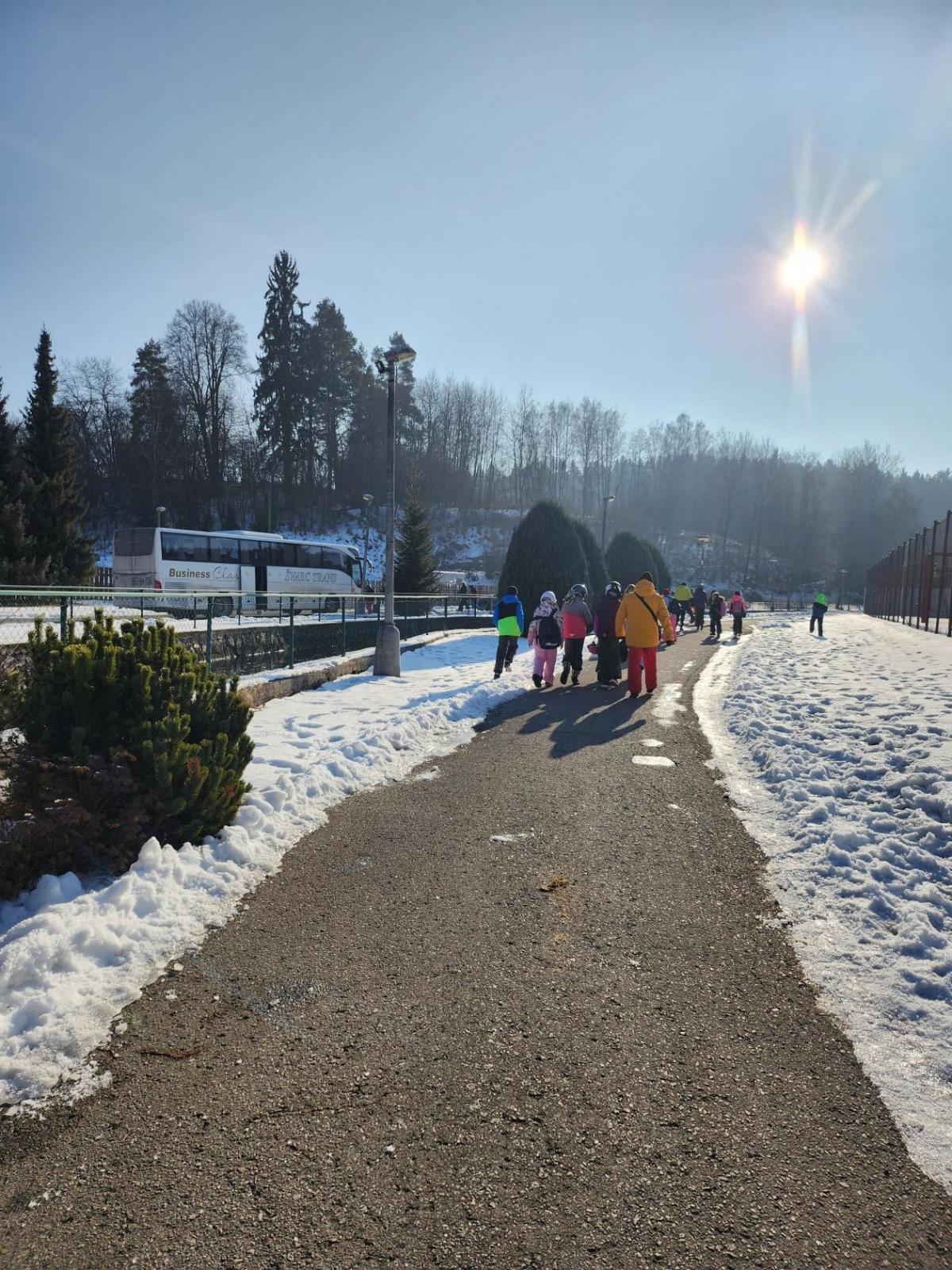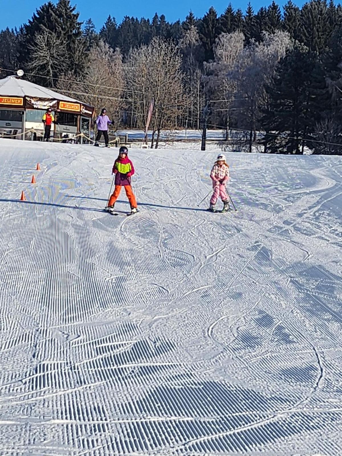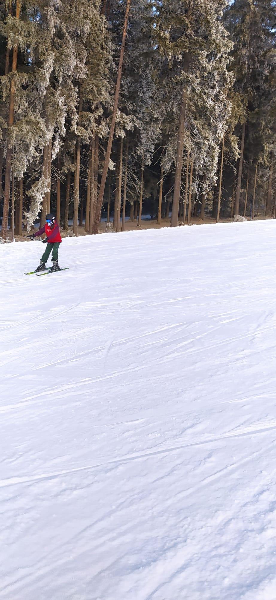 Přivítalo nás mrazivé, ale přesto slunečné ráno. Ani -13°C venku a dokonce ani -5°C v autobuse (před zatopením), nás nedokázalo odradit. A proto jsme vyrazili na lyžovačku. Mráz se nad námi smiloval a tak jsme se opravdu zapotili.