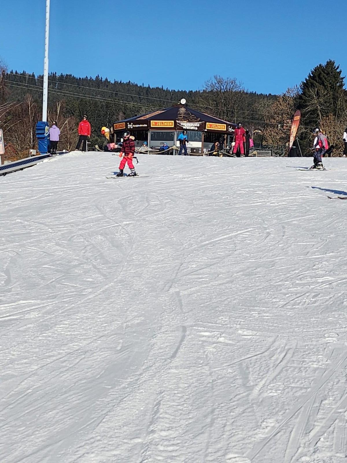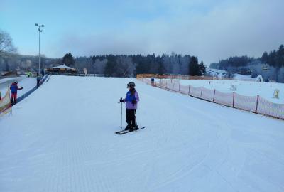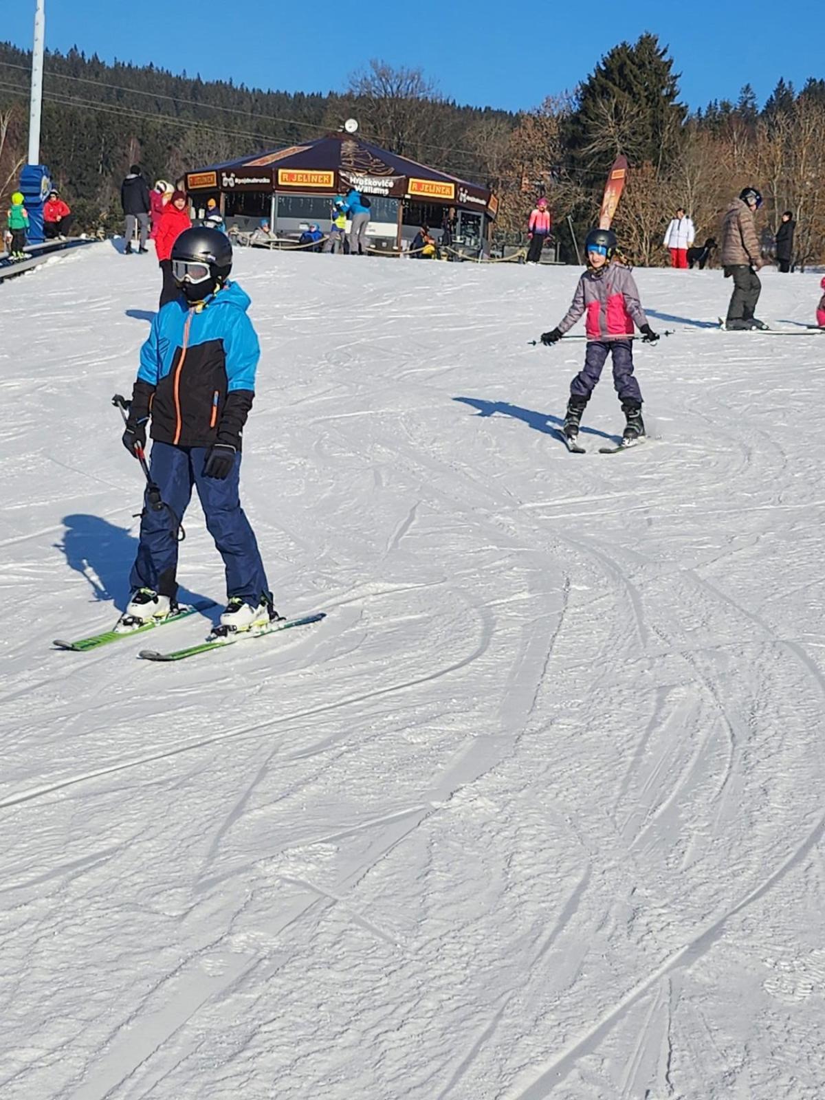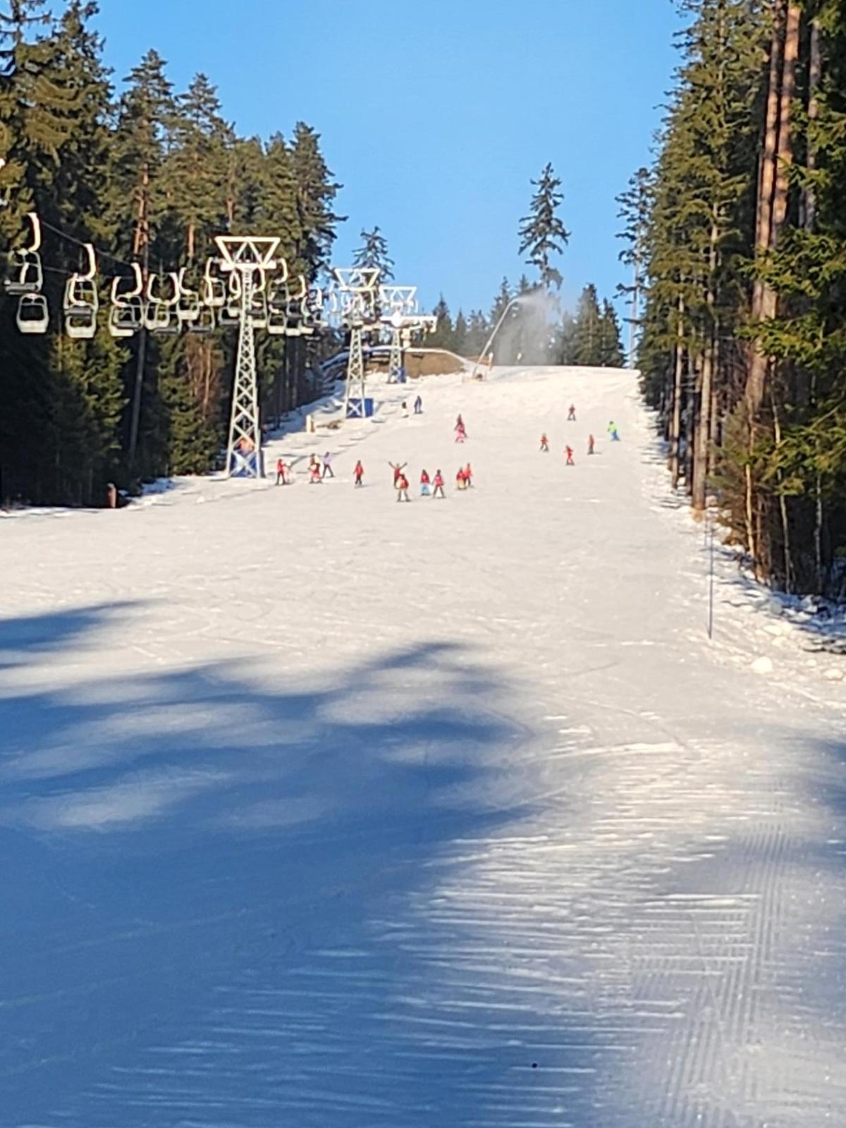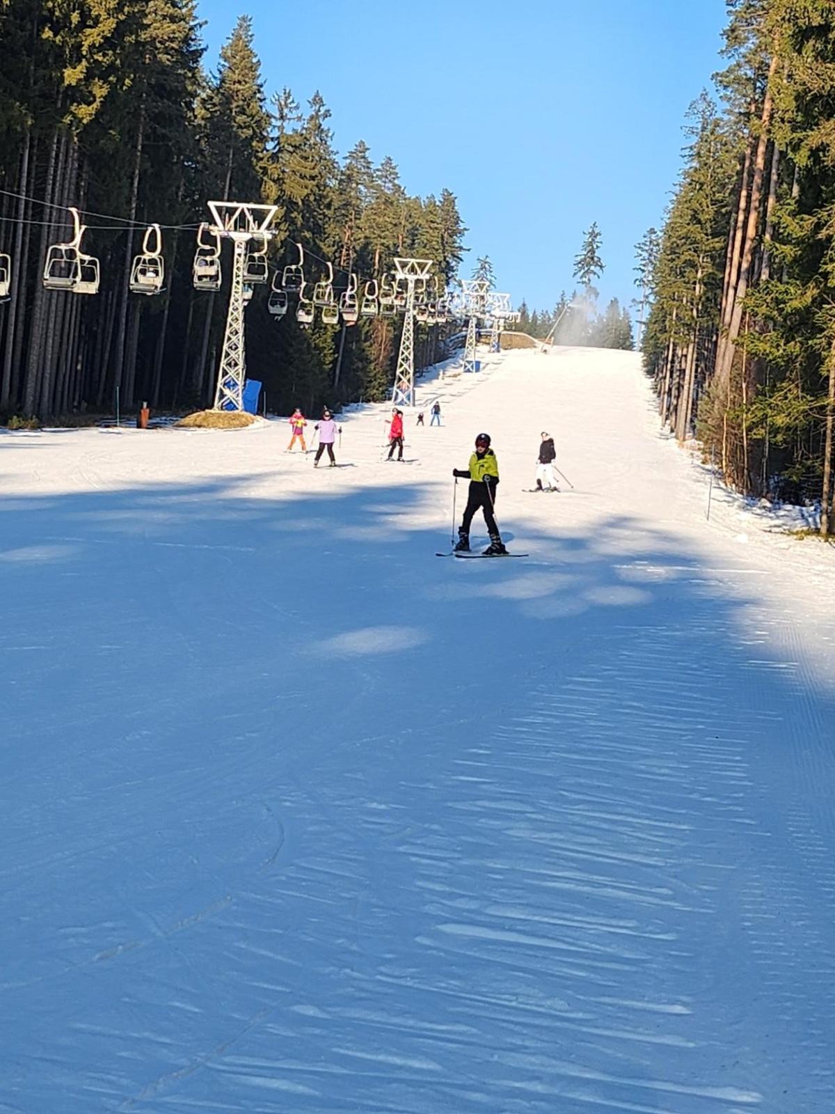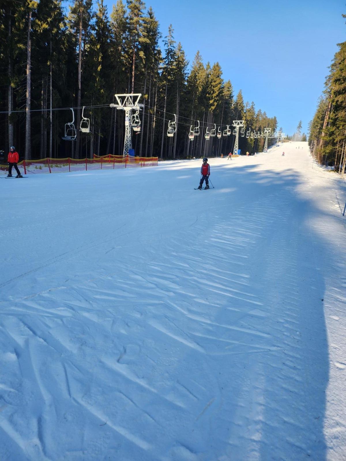 Přivítalo nás mrazivé, ale přesto slunečné ráno. Ani -13°C venku a dokonce ani -5°C v autobuse (před zatopením), nás nedokázalo odradit. A proto jsme vyrazili na lyžovačku. Mráz se nad námi smiloval a tak jsme se opravdu zapotili.