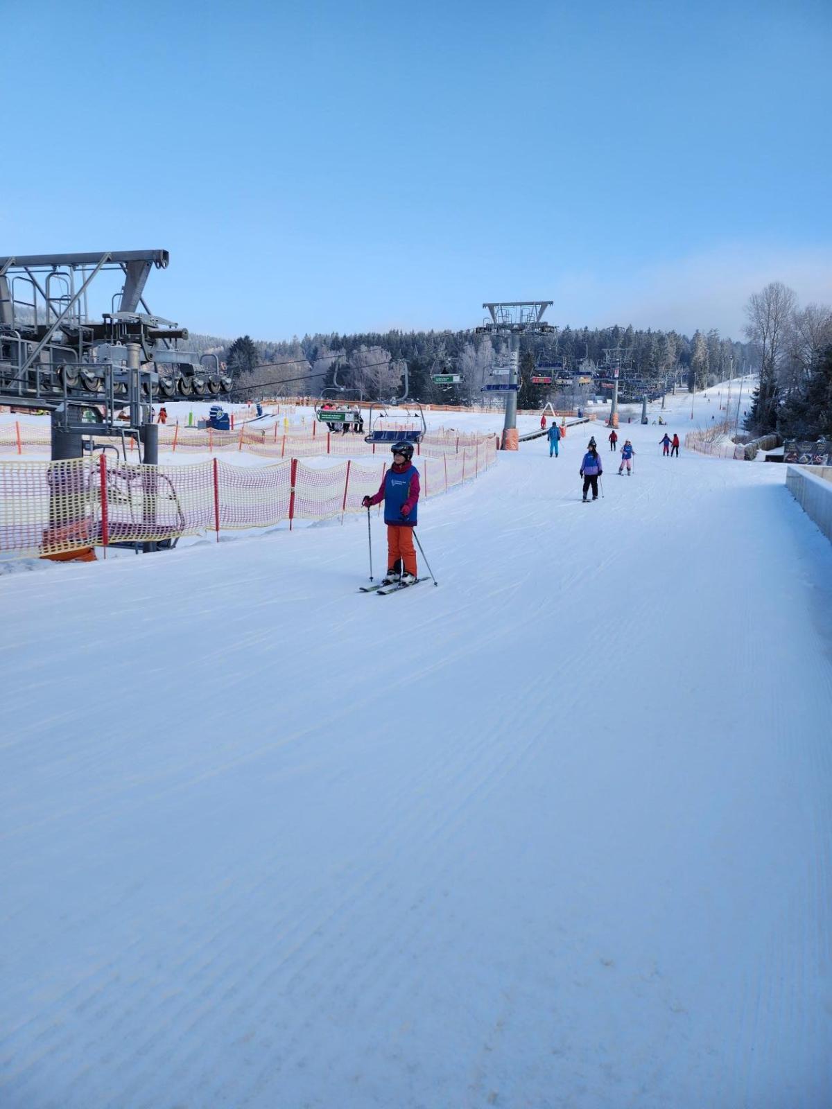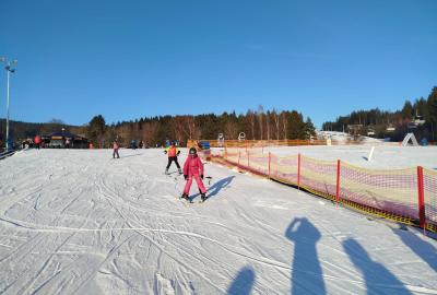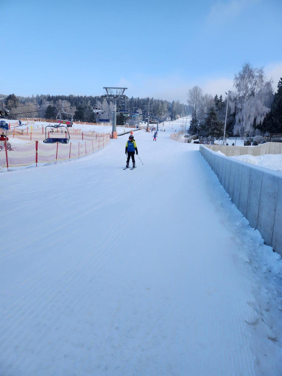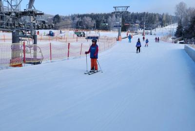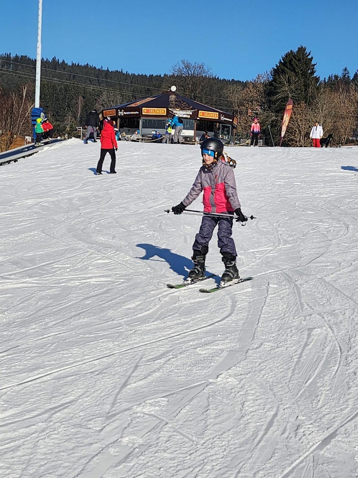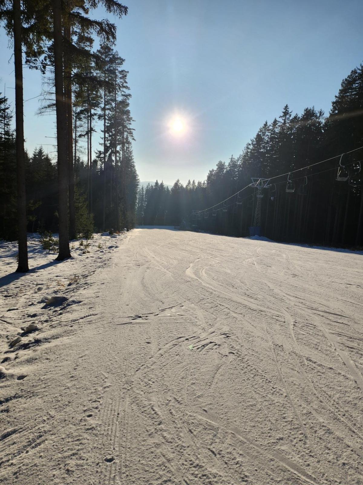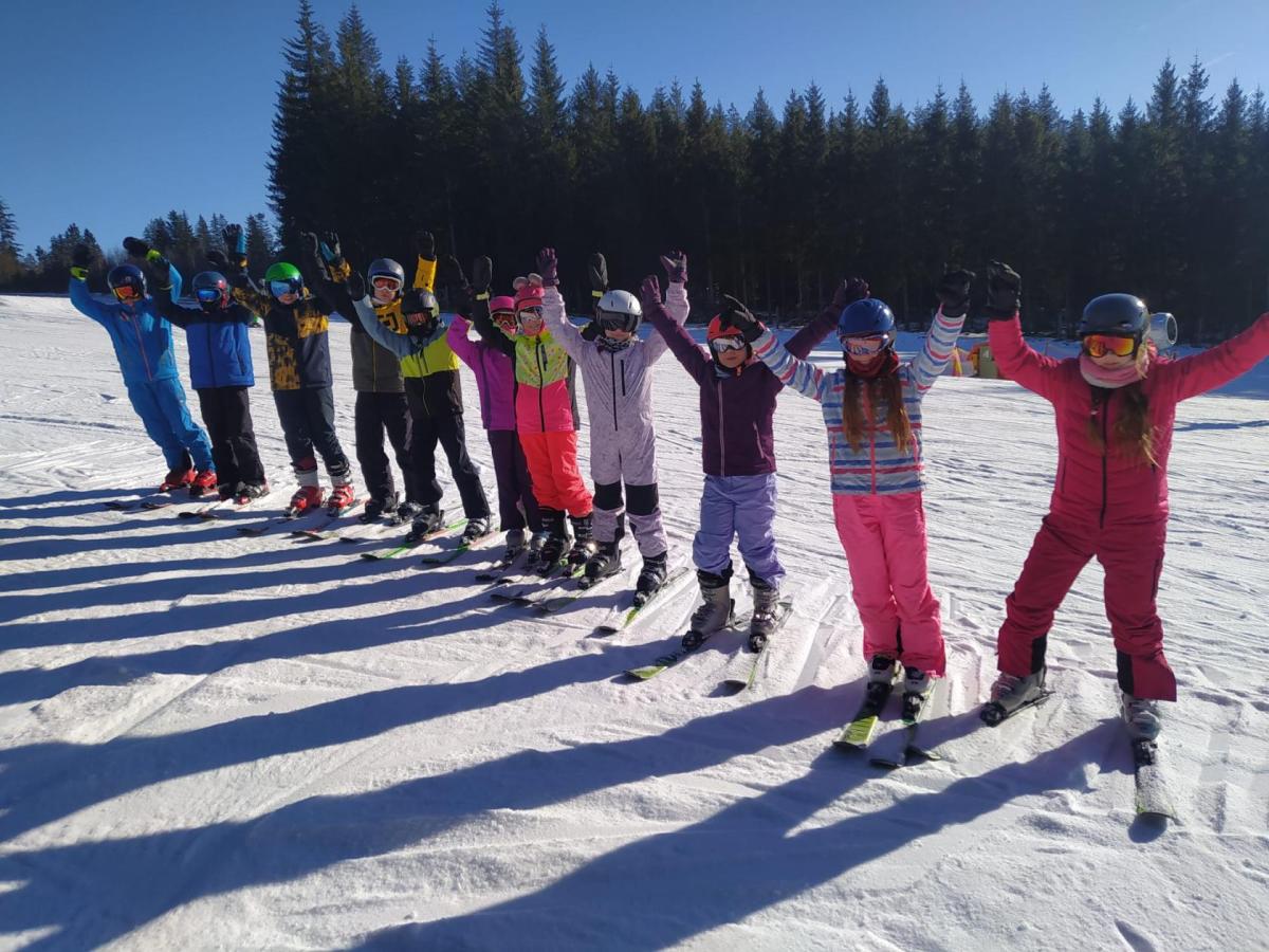 Přivítalo nás mrazivé, ale přesto slunečné ráno. Ani -13°C venku a dokonce ani -5°C v autobuse (před zatopením), nás nedokázalo odradit. A proto jsme vyrazili na lyžovačku. Mráz se nad námi smiloval a tak jsme se opravdu zapotili.