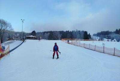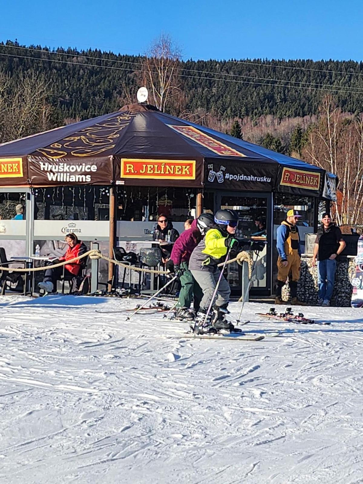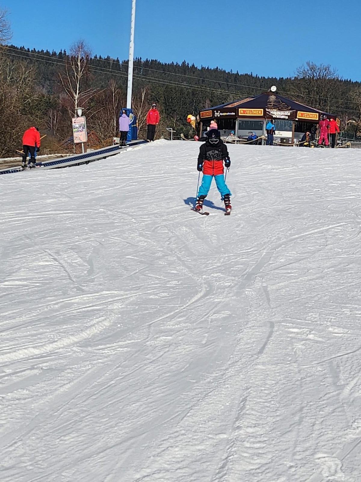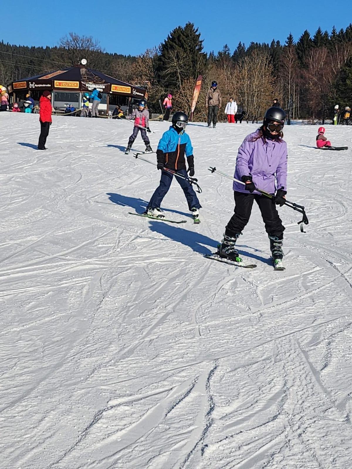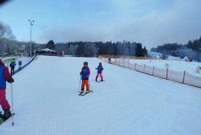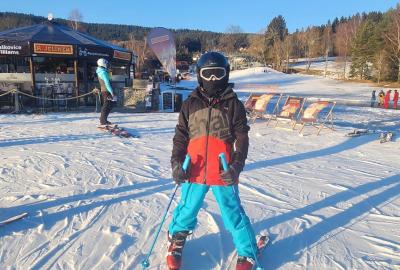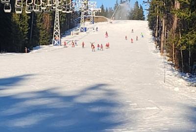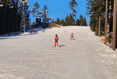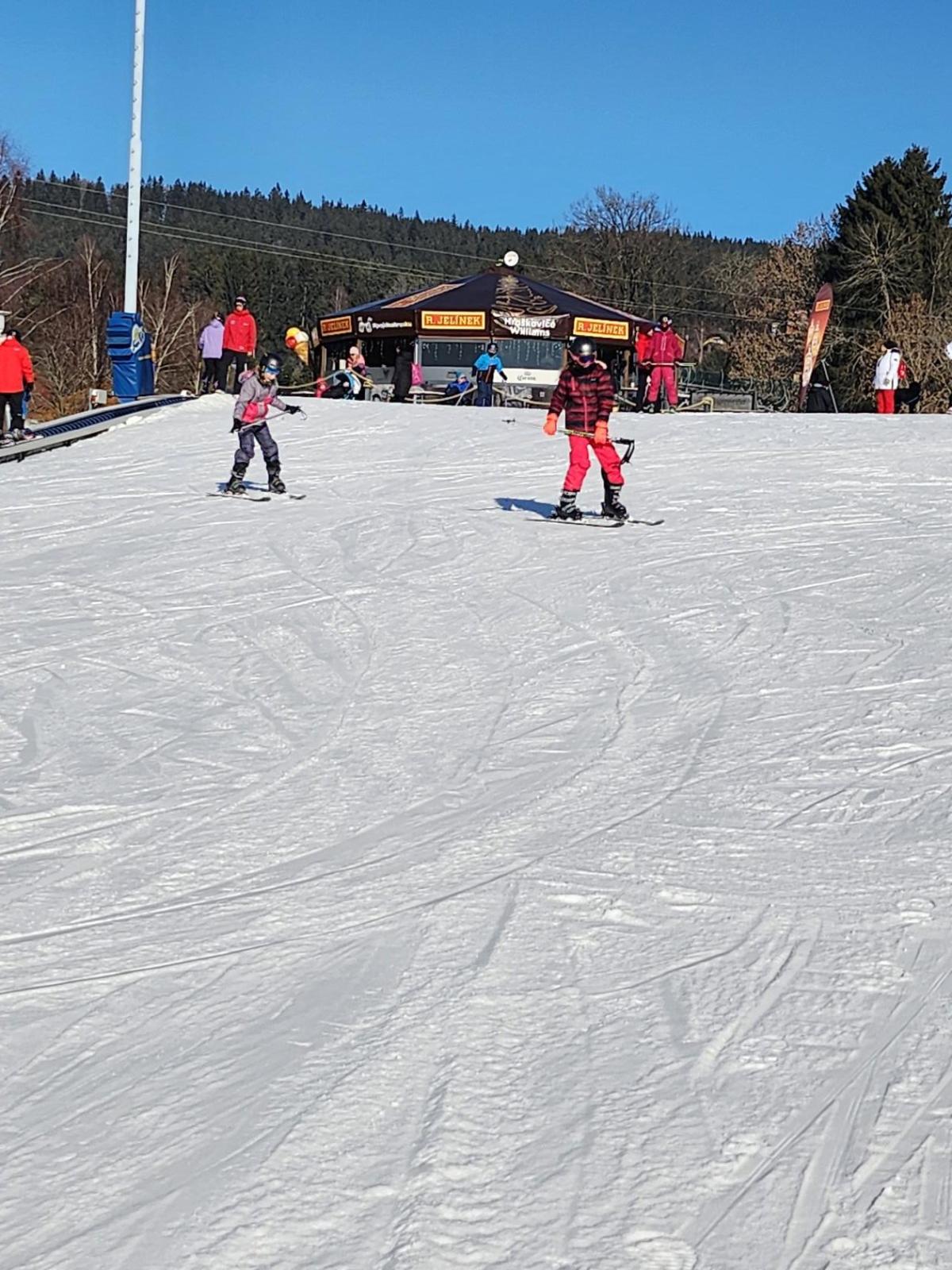 Přivítalo nás mrazivé, ale přesto slunečné ráno. Ani -13°C venku a dokonce ani -5°C v autobuse (před zatopením), nás nedokázalo odradit. A proto jsme vyrazili na lyžovačku. Mráz se nad námi smiloval a tak jsme se opravdu zapotili.