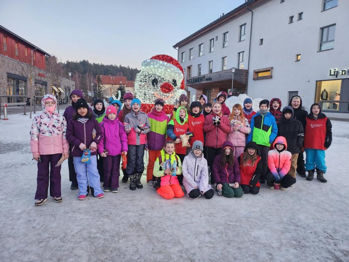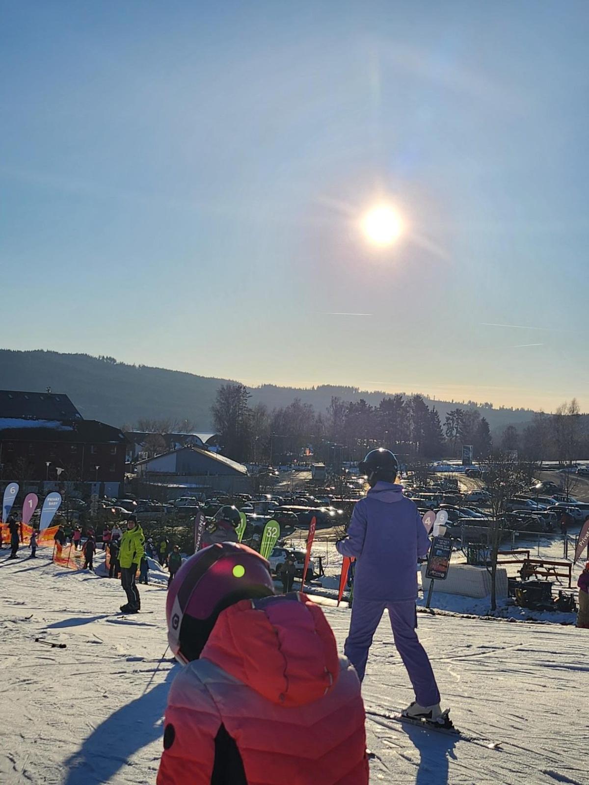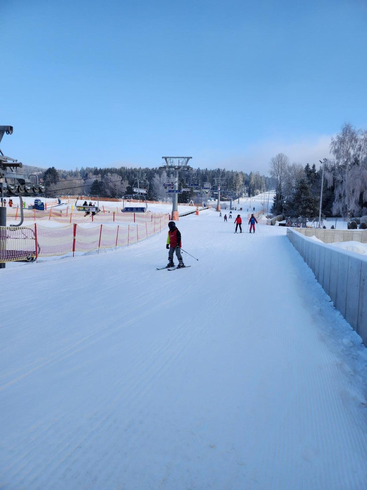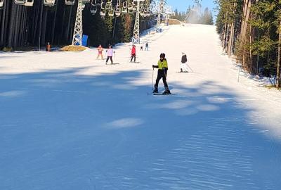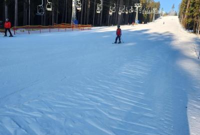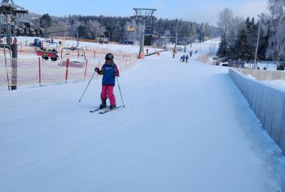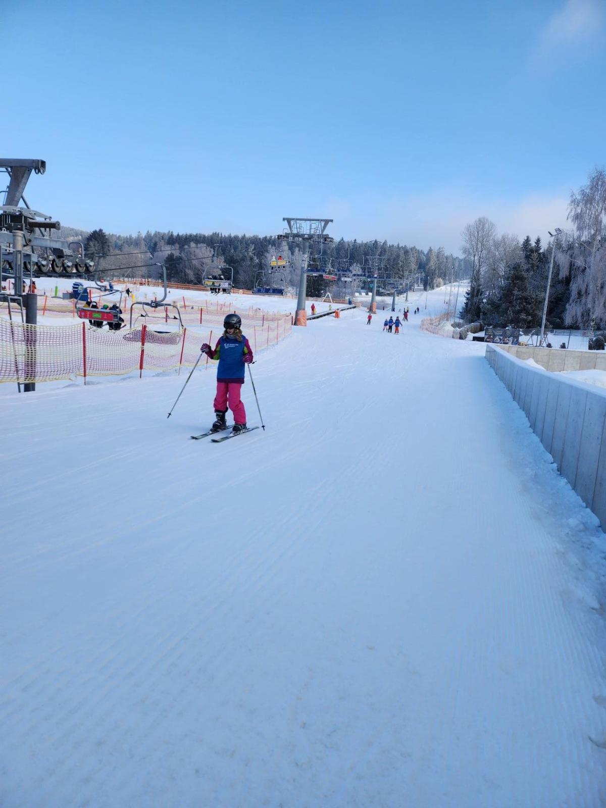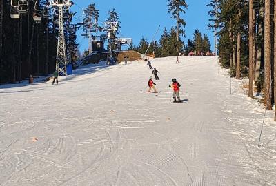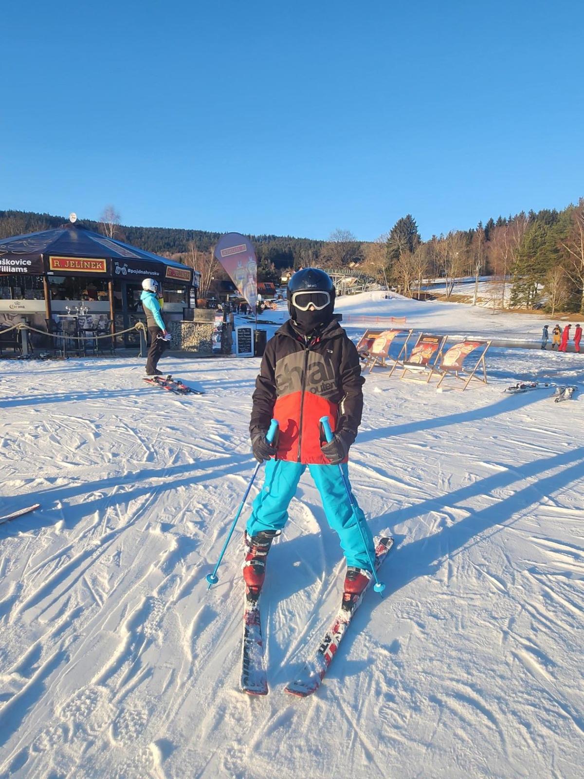 Přivítalo nás mrazivé, ale přesto slunečné ráno. Ani -13°C venku a dokonce ani -5°C v autobuse (před zatopením), nás nedokázalo odradit. A proto jsme vyrazili na lyžovačku. Mráz se nad námi smiloval a tak jsme se opravdu zapotili.