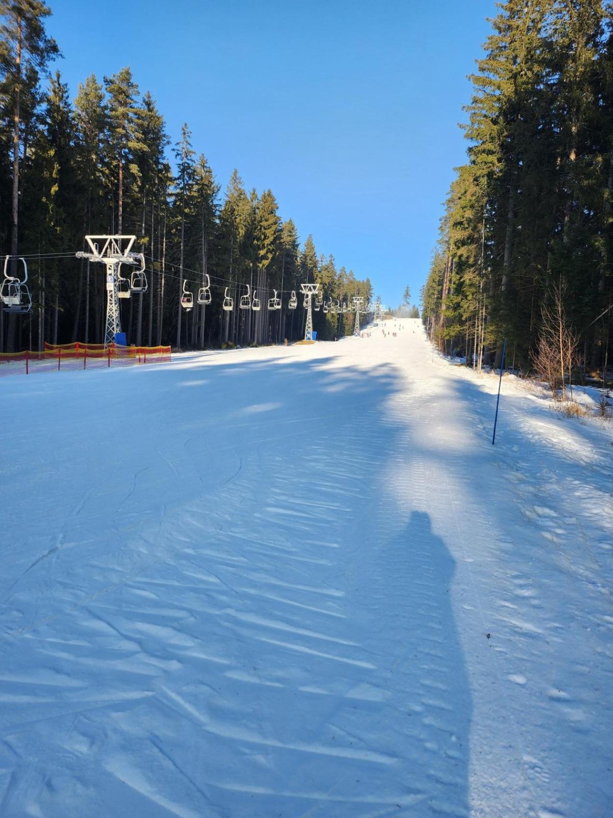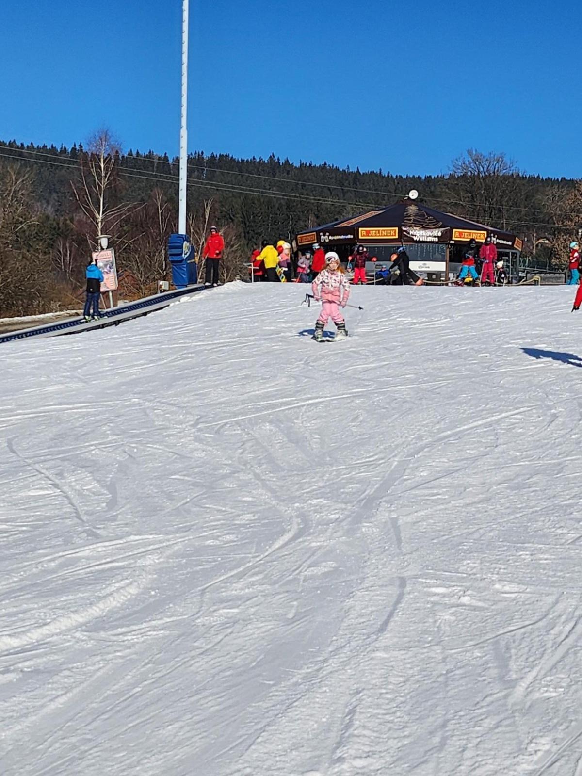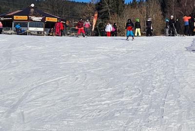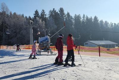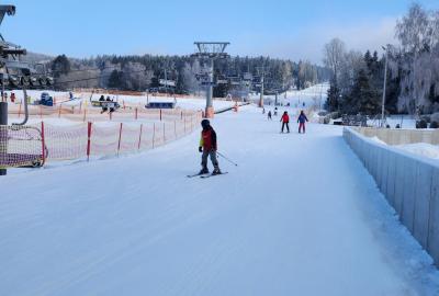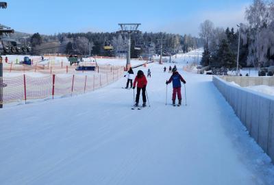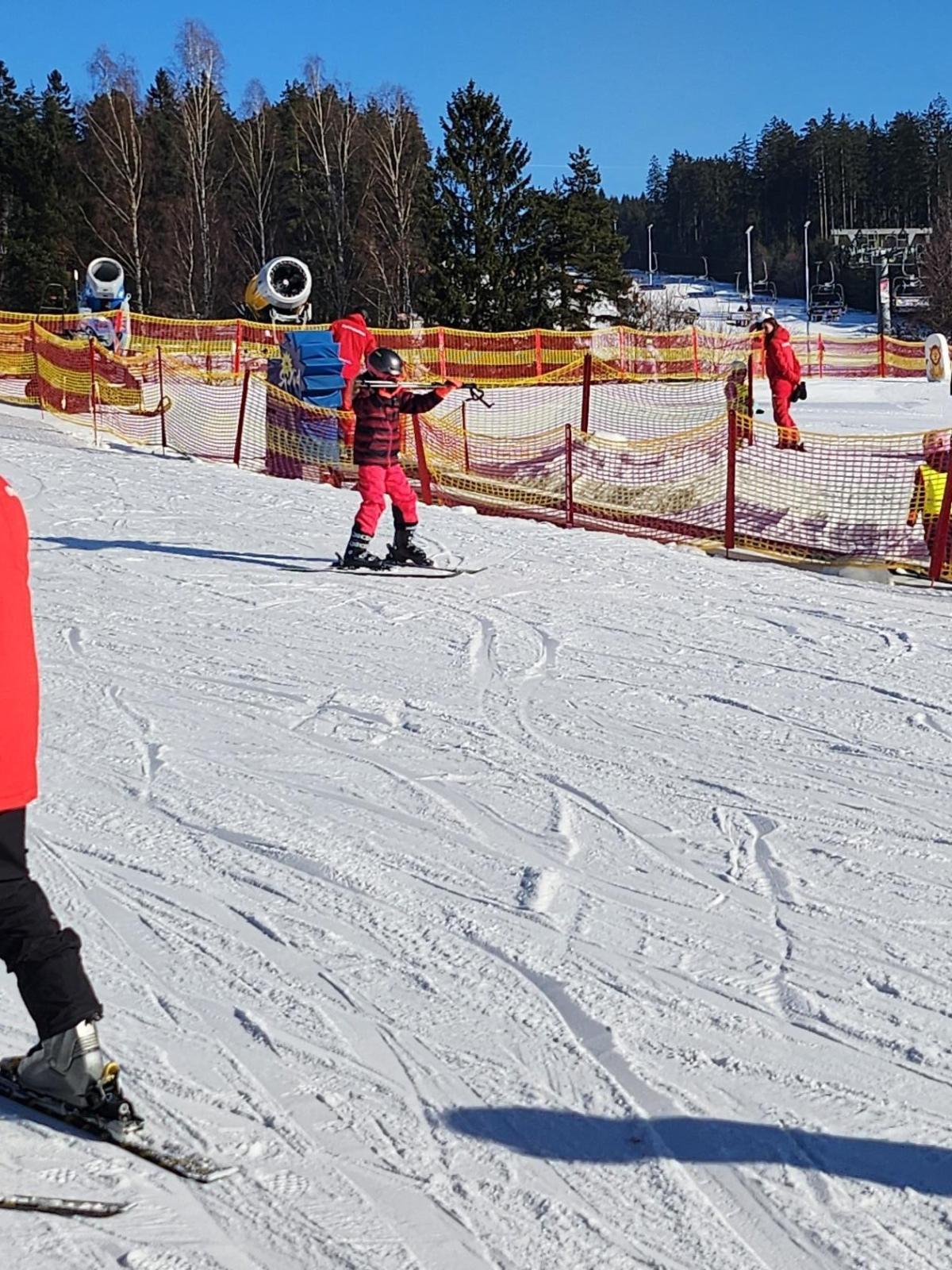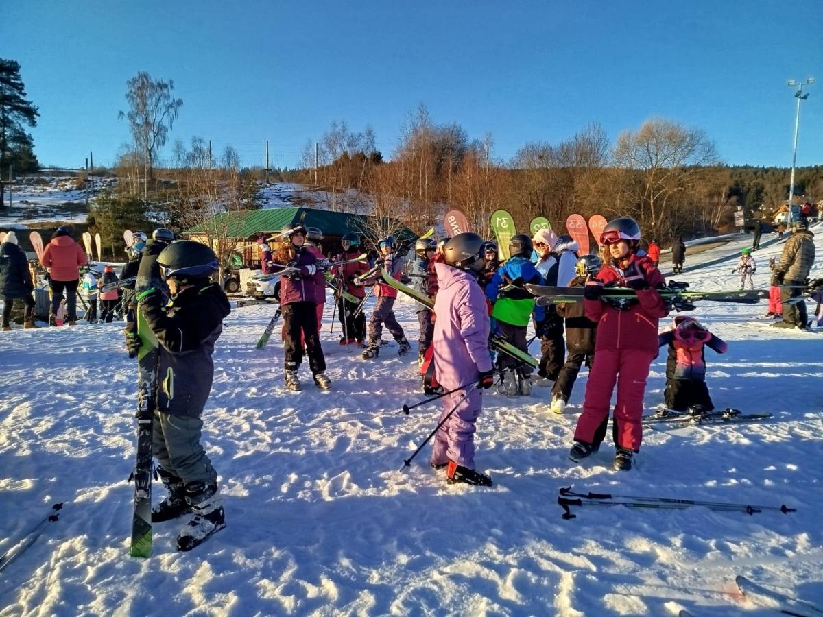Přivítalo nás mrazivé, ale přesto slunečné ráno. Ani -13°C venku a dokonce ani -5°C v autobuse (před zatopením), nás nedokázalo odradit. A proto jsme vyrazili na lyžovačku. Mráz se nad námi smiloval a tak jsme se opravdu zapotili.