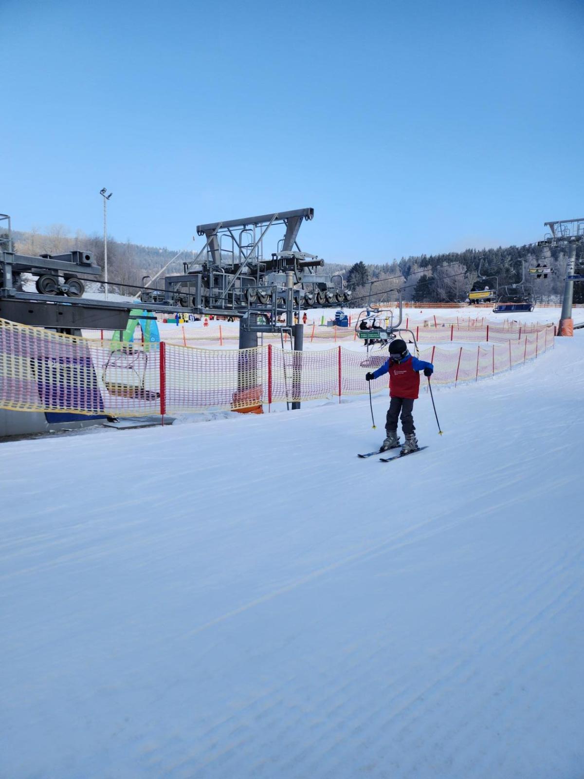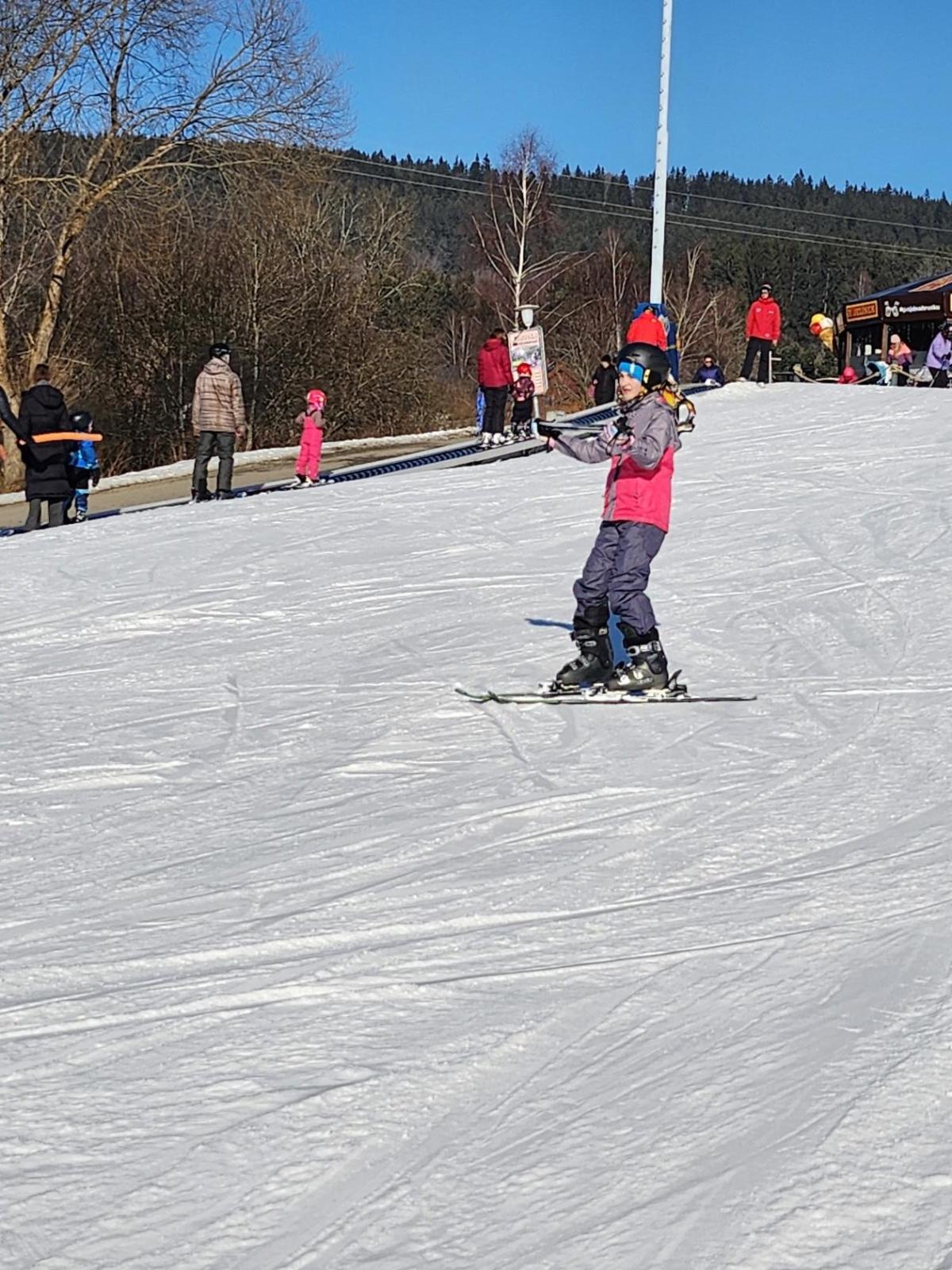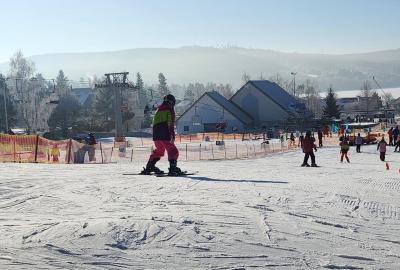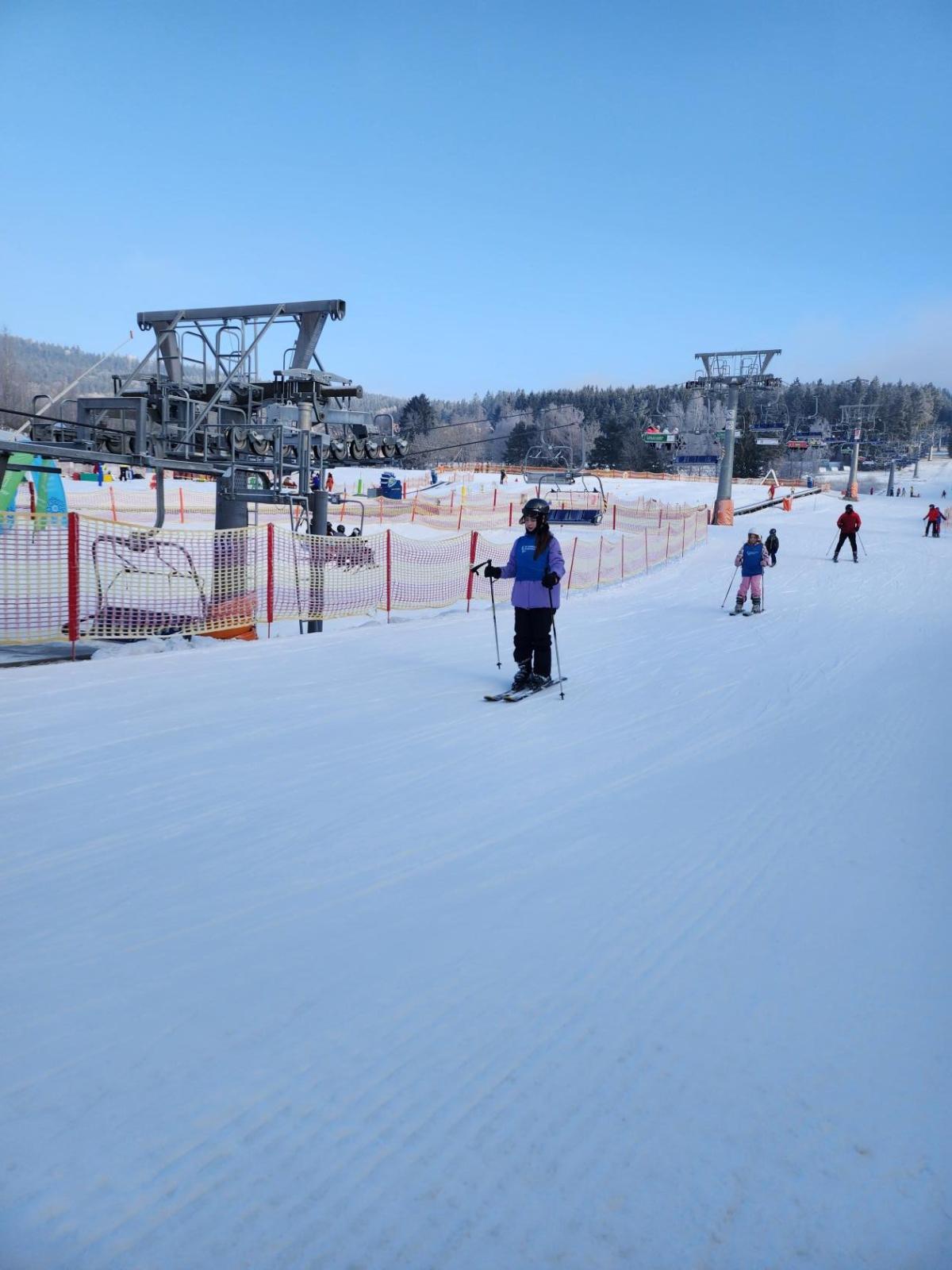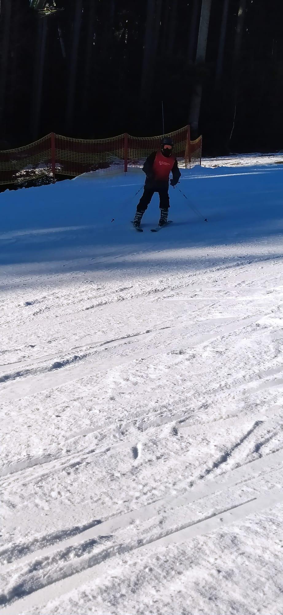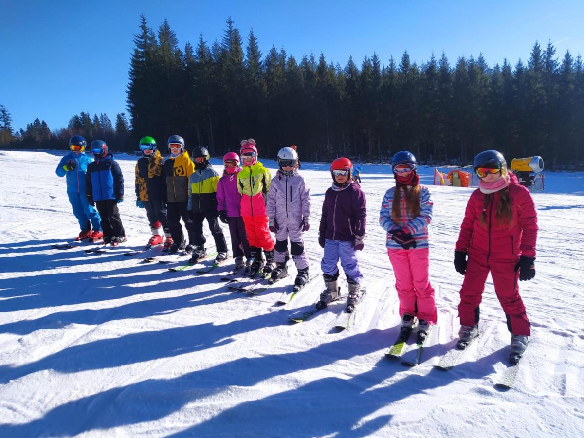 Přivítalo nás mrazivé, ale přesto slunečné ráno. Ani -13°C venku a dokonce ani -5°C v autobuse (před zatopením), nás nedokázalo odradit. A proto jsme vyrazili na lyžovačku. Mráz se nad námi smiloval a tak jsme se opravdu zapotili.