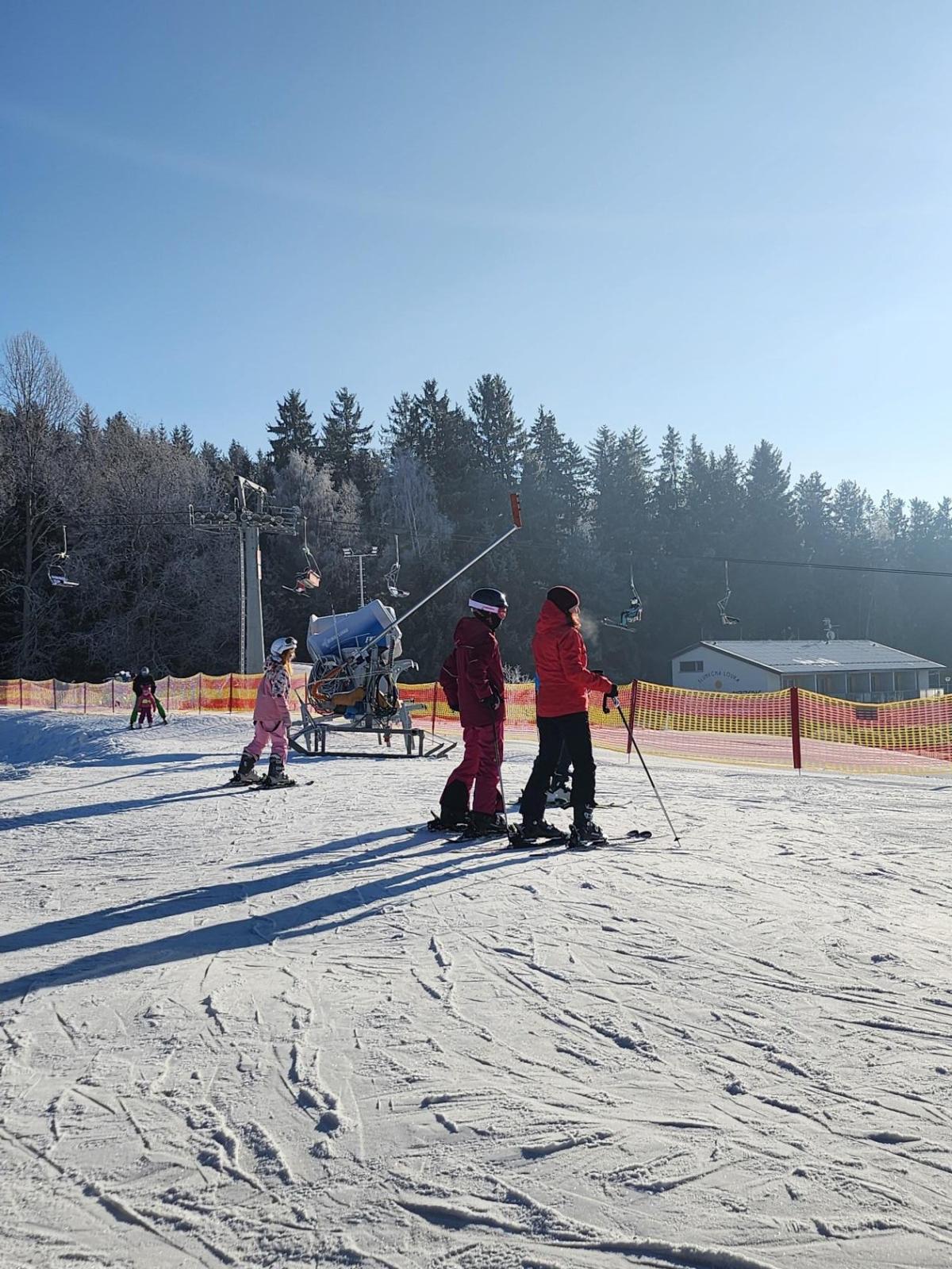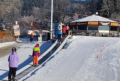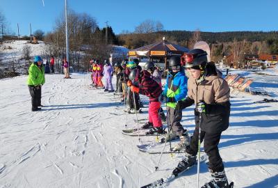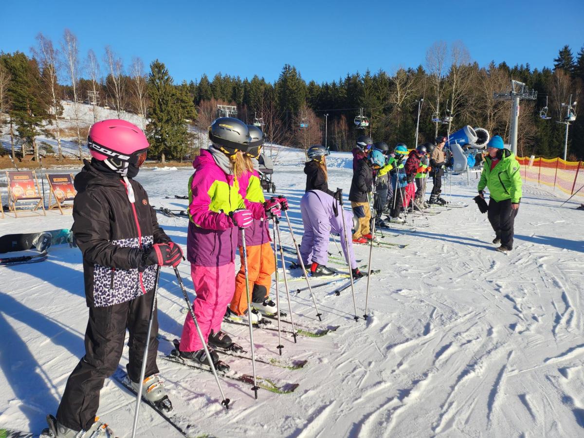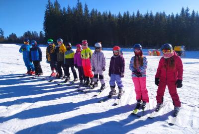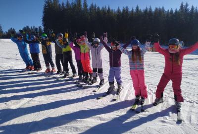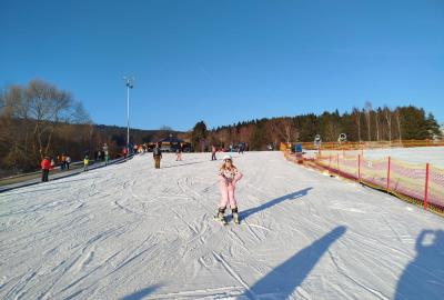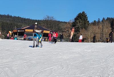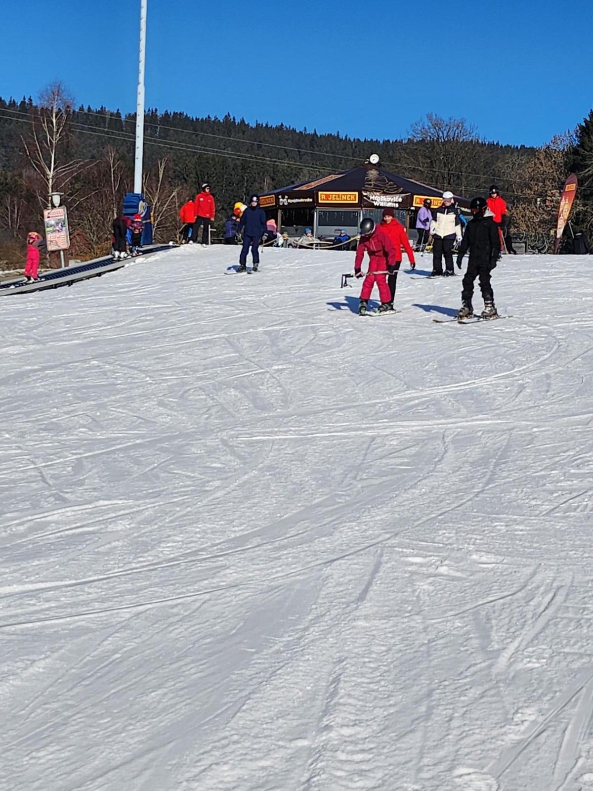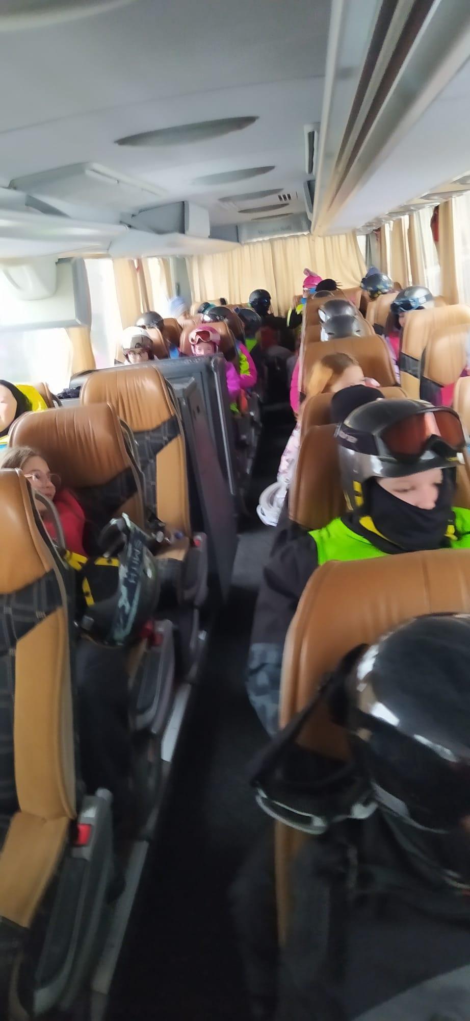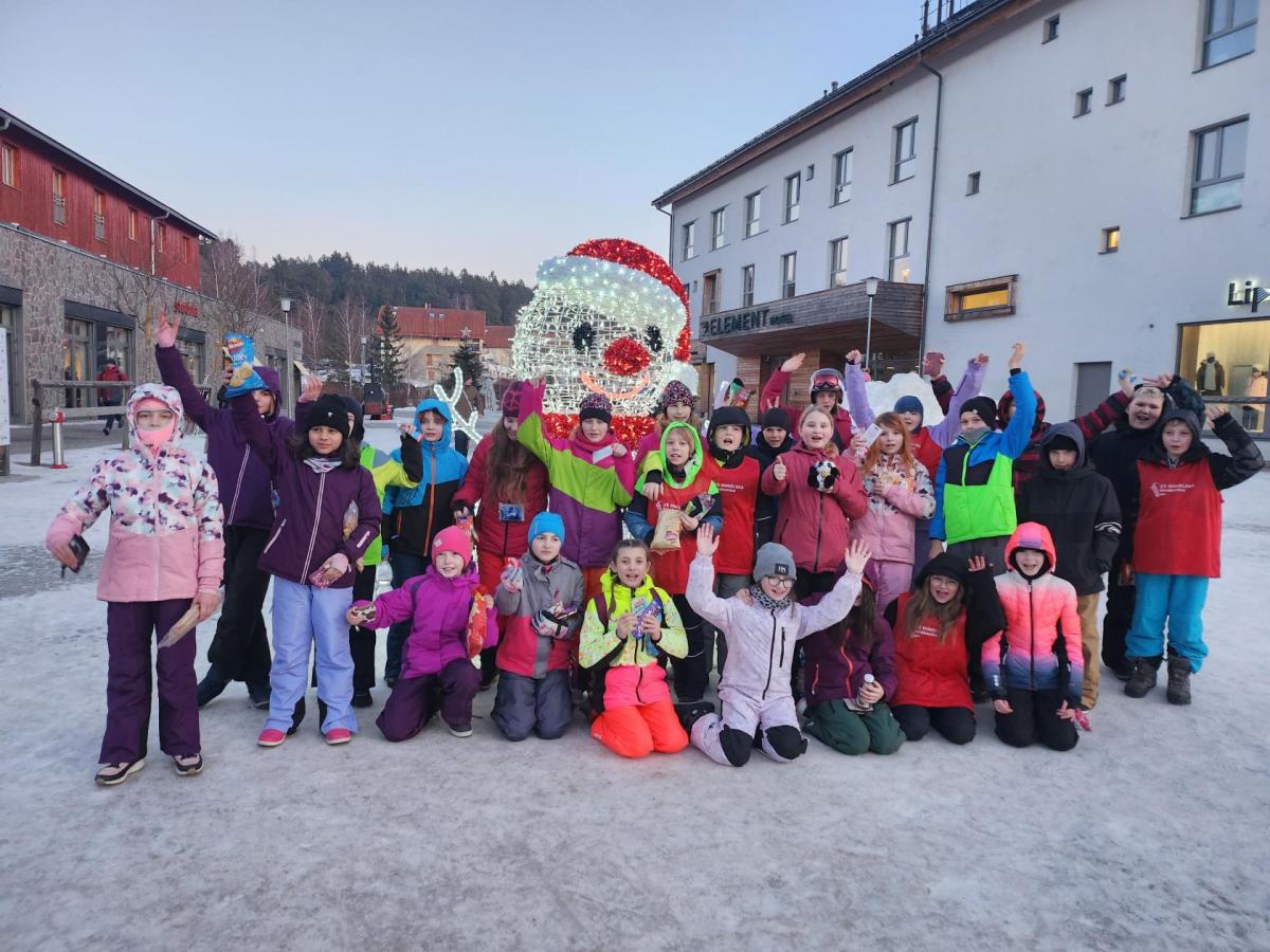 Přivítalo nás mrazivé, ale přesto slunečné ráno. Ani -13°C venku a dokonce ani -5°C v autobuse (před zatopením), nás nedokázalo odradit. A proto jsme vyrazili na lyžovačku. Mráz se nad námi smiloval a tak jsme se opravdu zapotili.