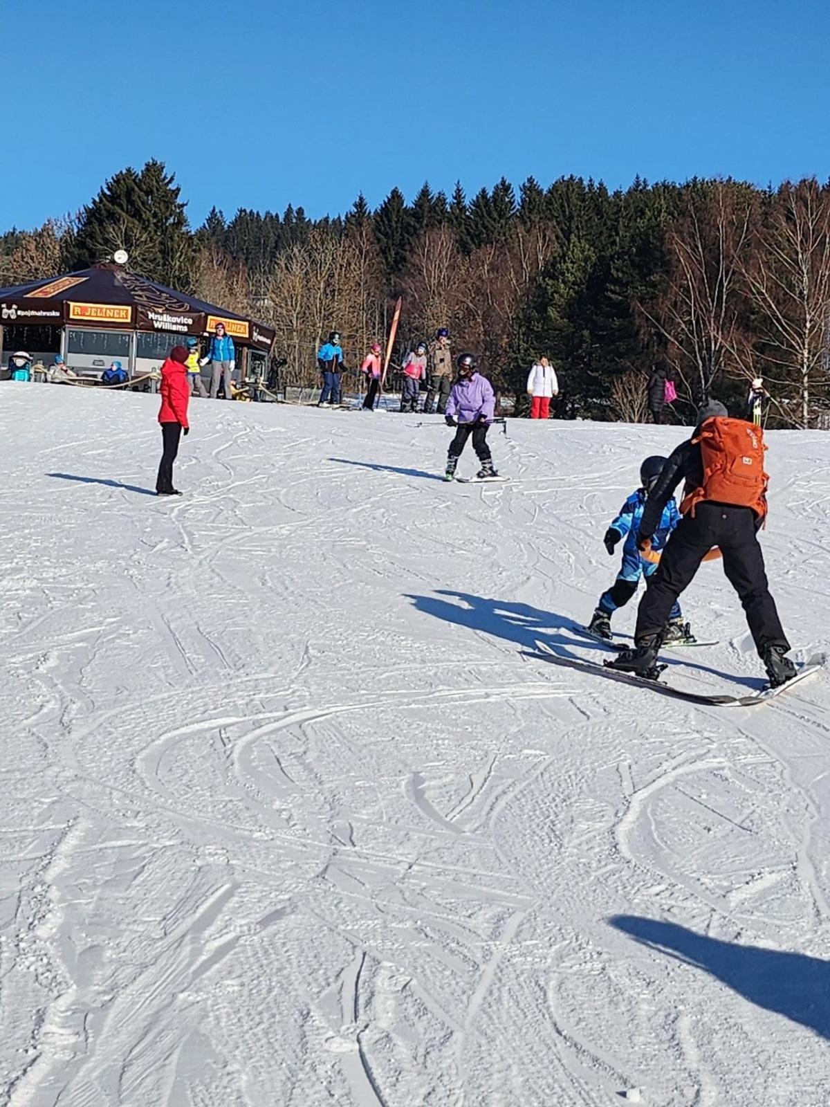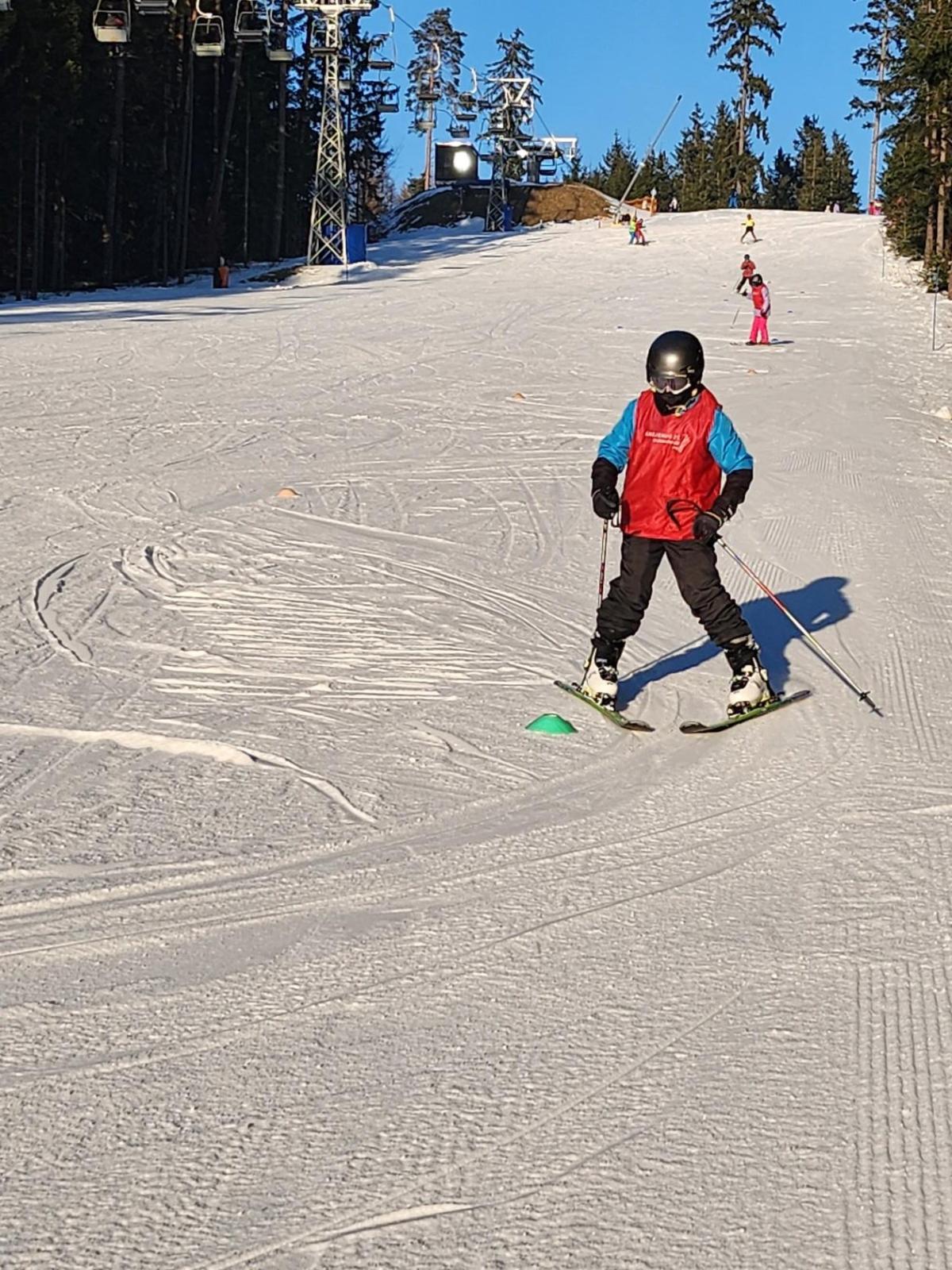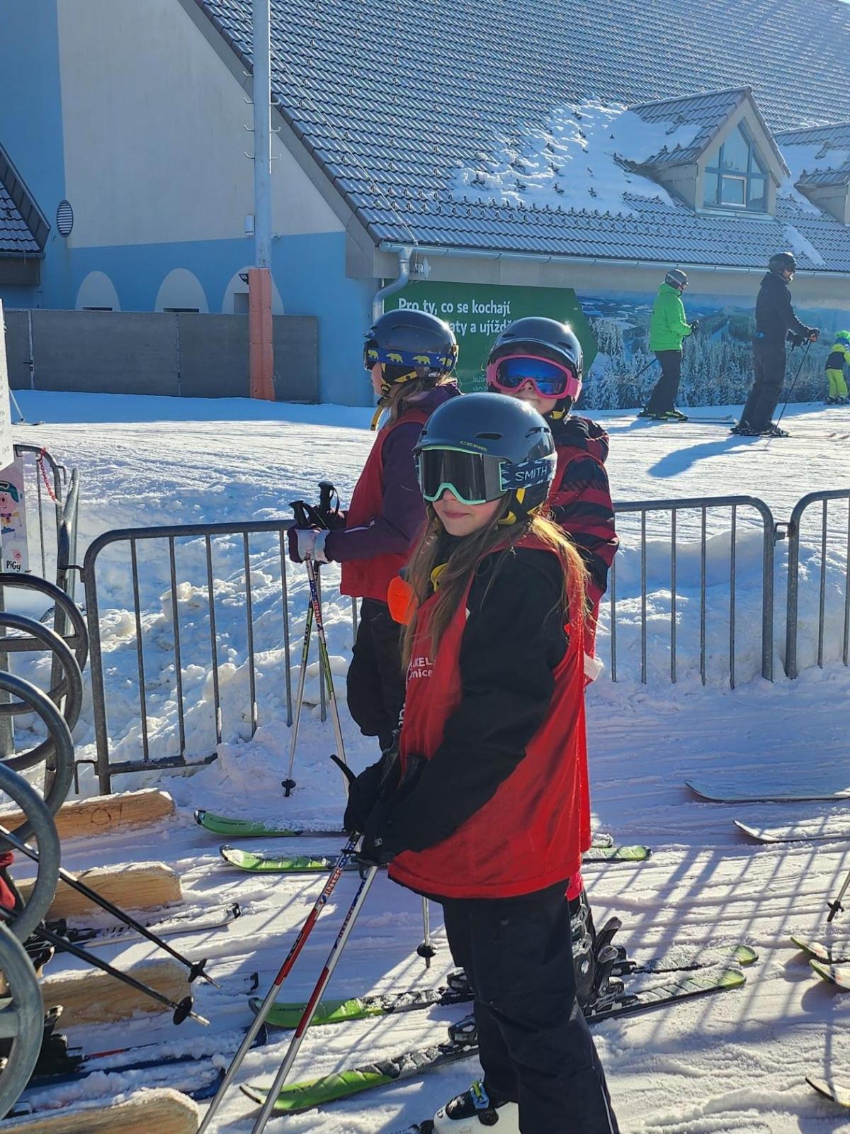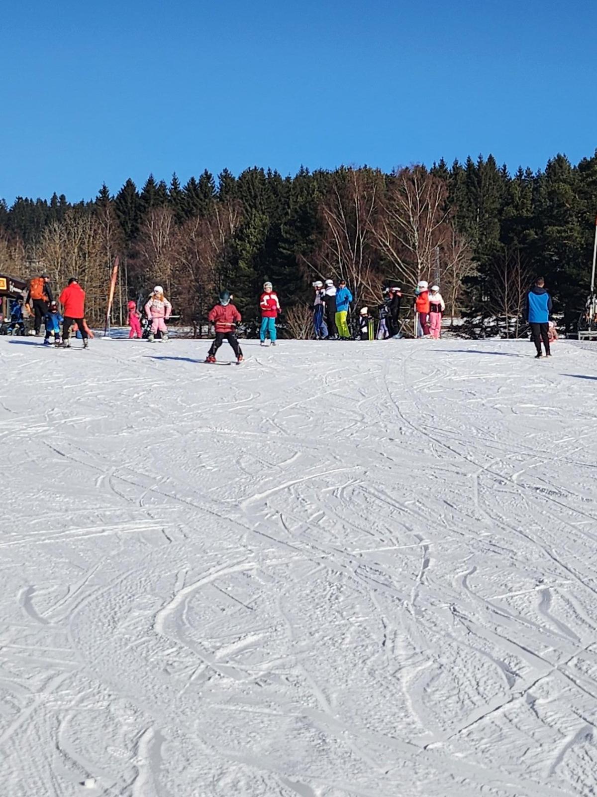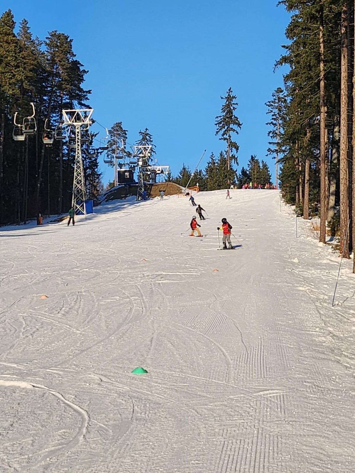 Po ubytování a vydatném obědě jsme se vydali na sjezdovku. Zkušení lyžaři se po seznámení s terénem vydali rovnou na lanovku. Méně zkušení se přesunuli na cvičnou sjezdovku, kde trénovali základy lyžování.