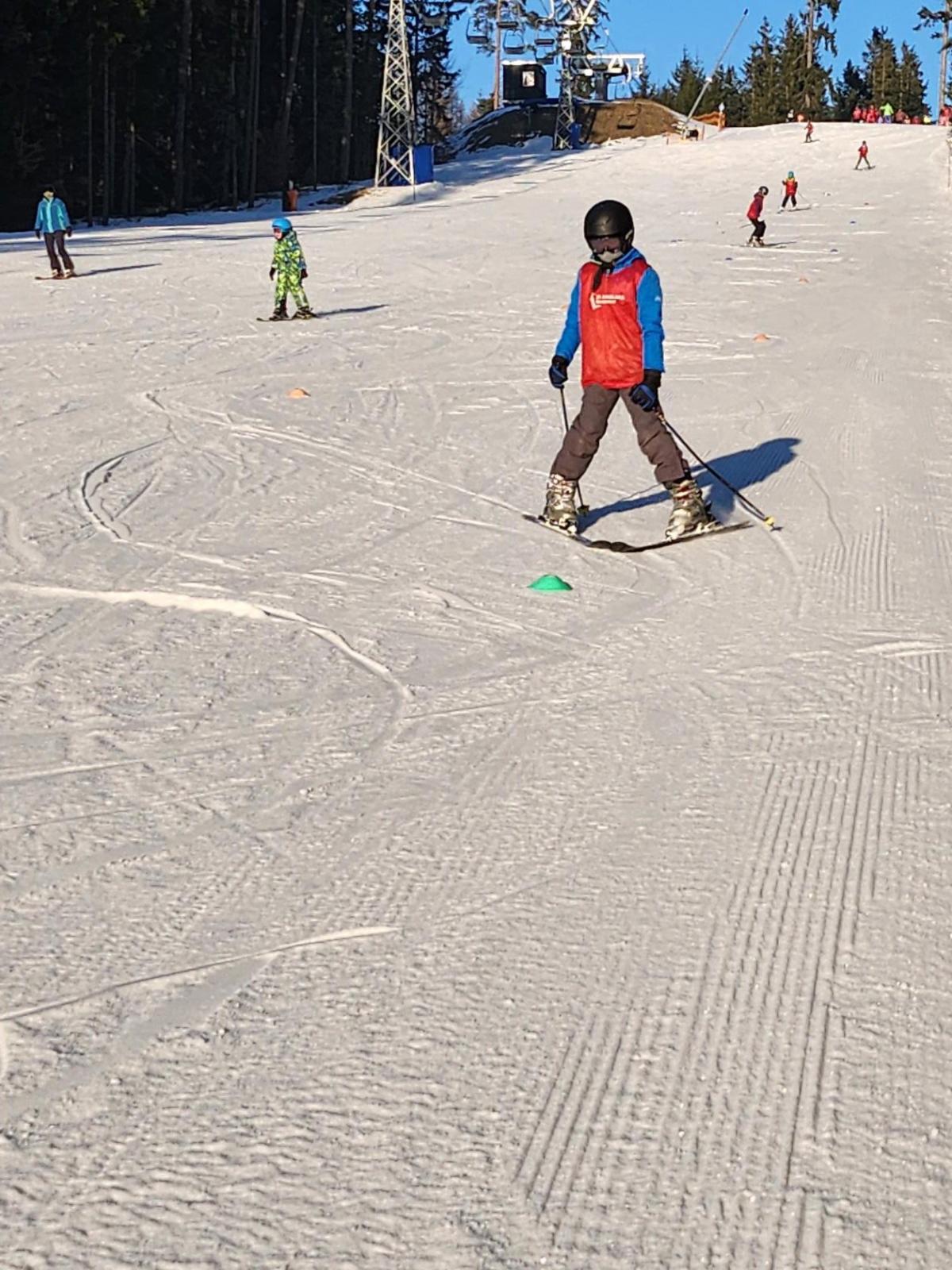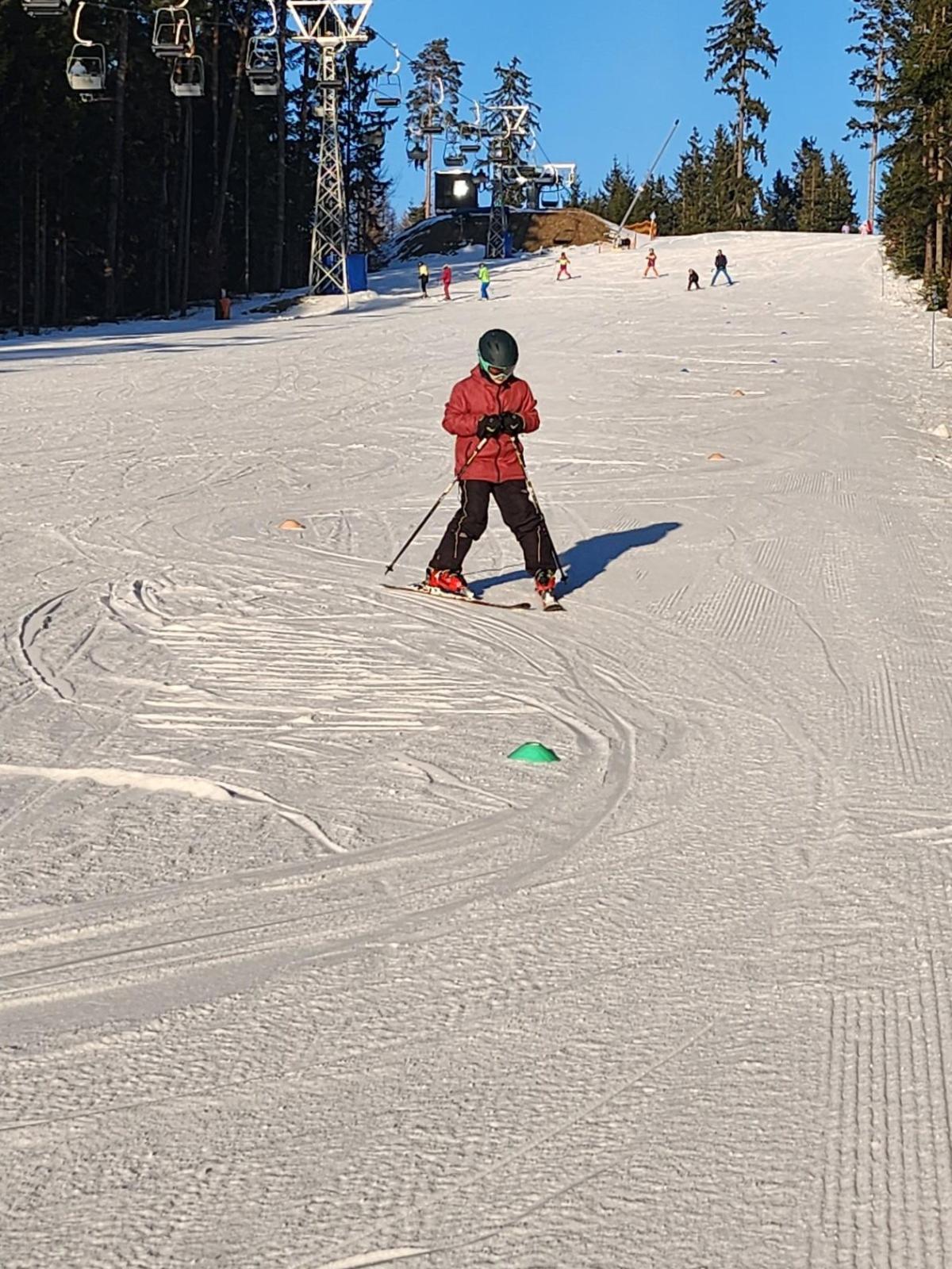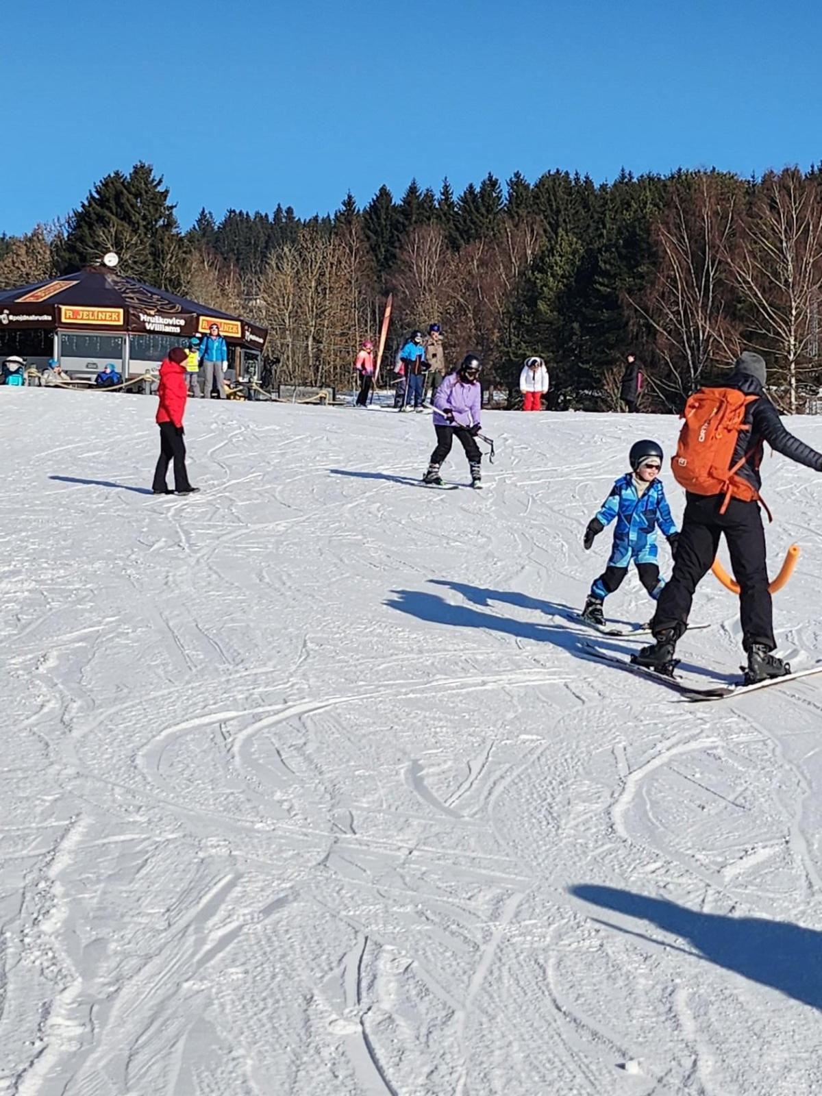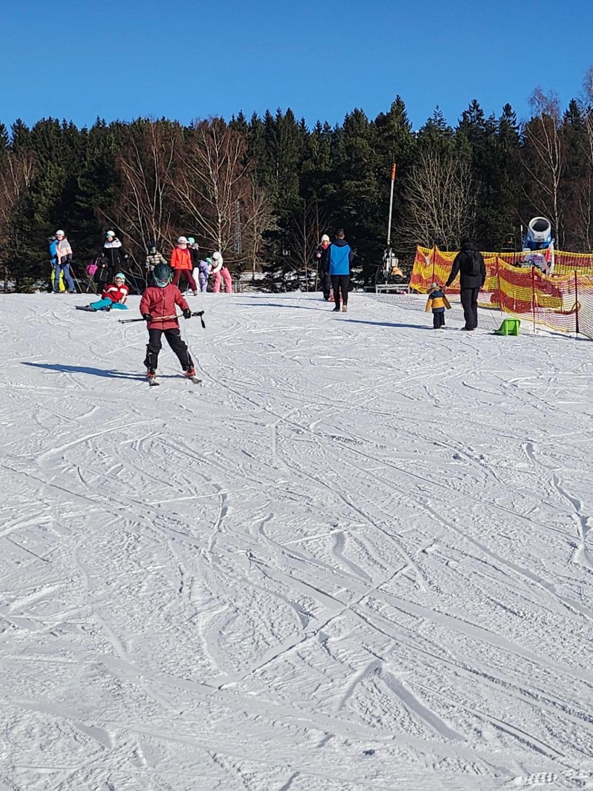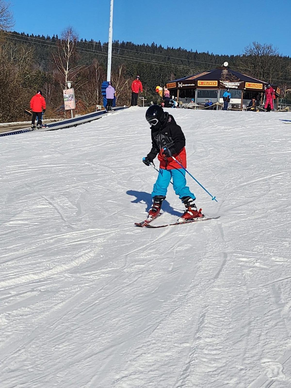Po ubytování a vydatném obědě jsme se vydali na sjezdovku. Zkušení lyžaři se po seznámení s terénem vydali rovnou na lanovku. Méně zkušení se přesunuli na cvičnou sjezdovku, kde trénovali základy lyžování.