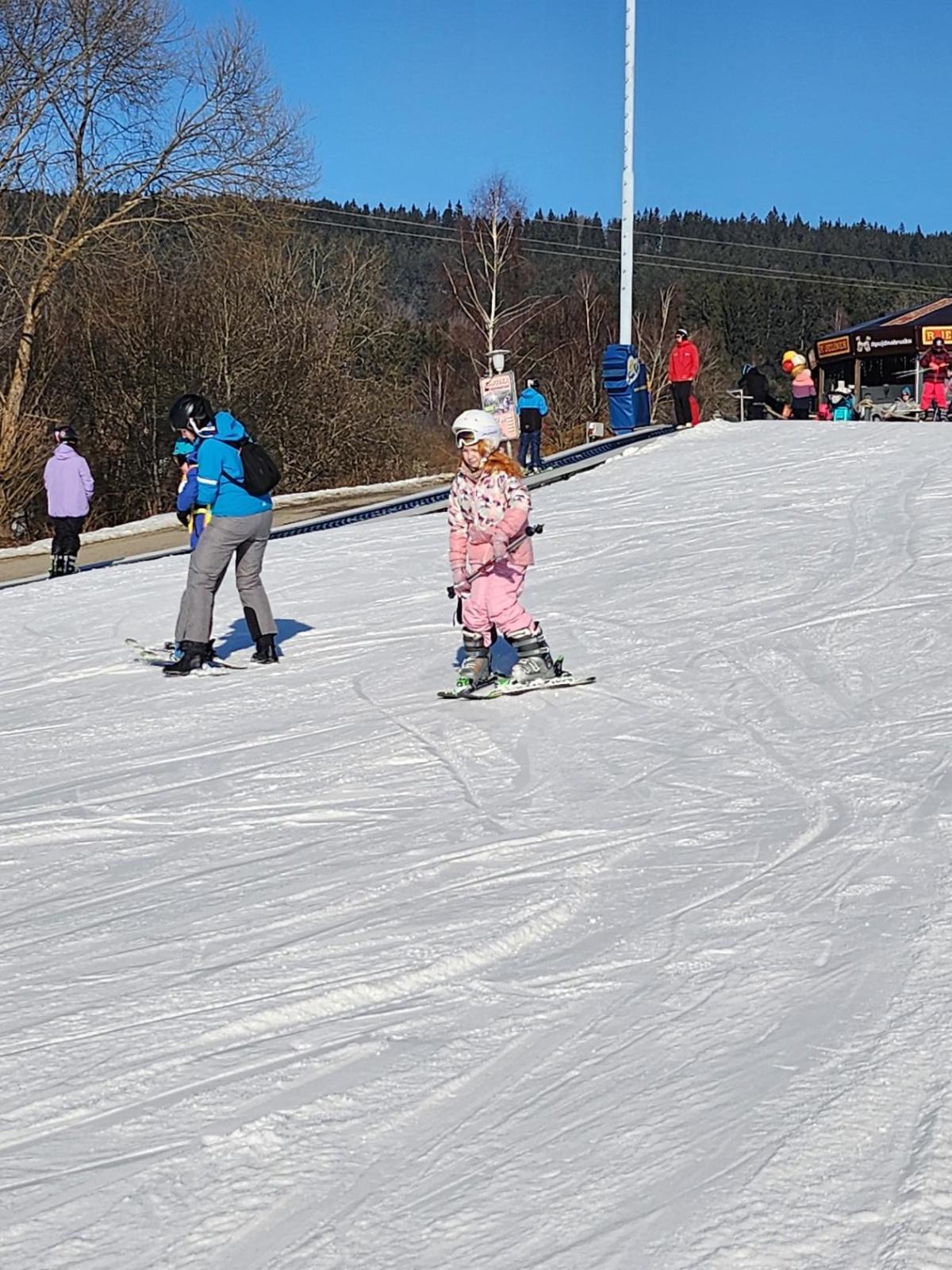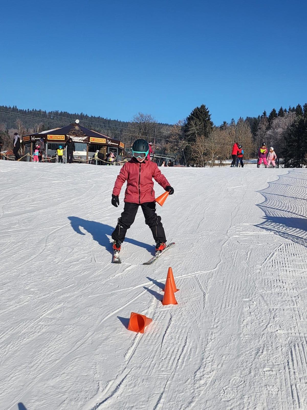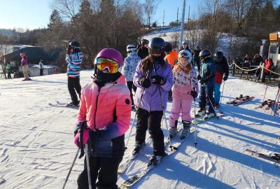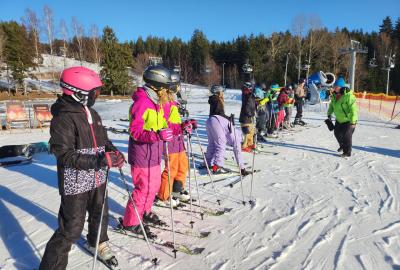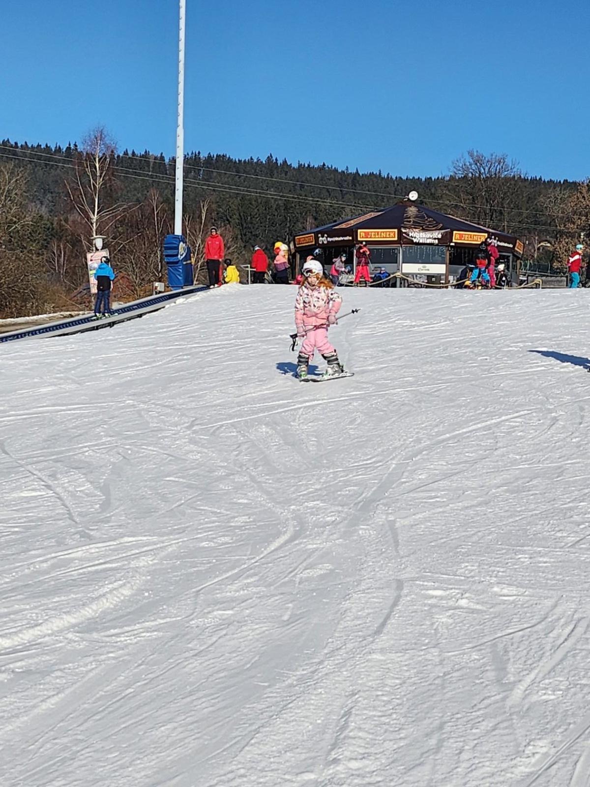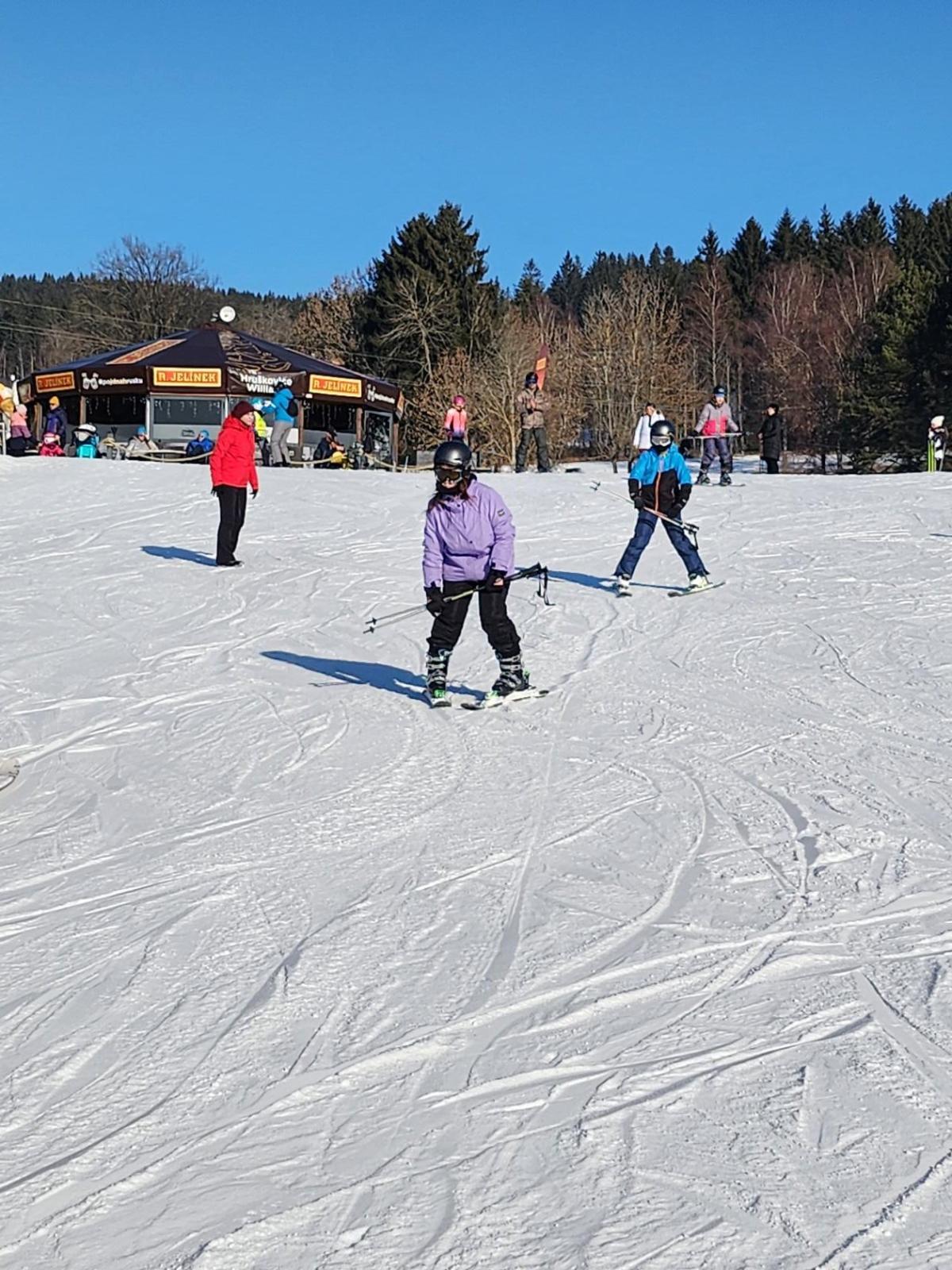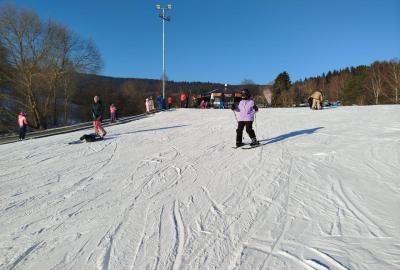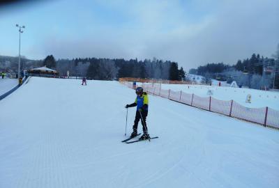 Po ubytování a vydatném obědě jsme se vydali na sjezdovku. Zkušení lyžaři se po seznámení s terénem vydali rovnou na lanovku. Méně zkušení se přesunuli na cvičnou sjezdovku, kde trénovali základy lyžování.