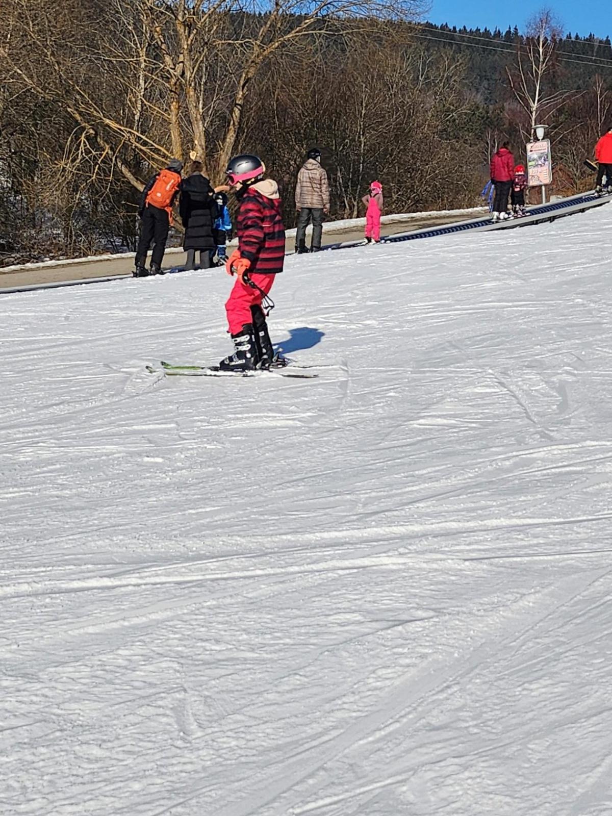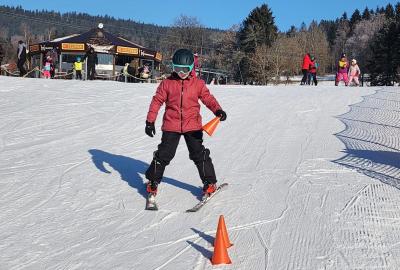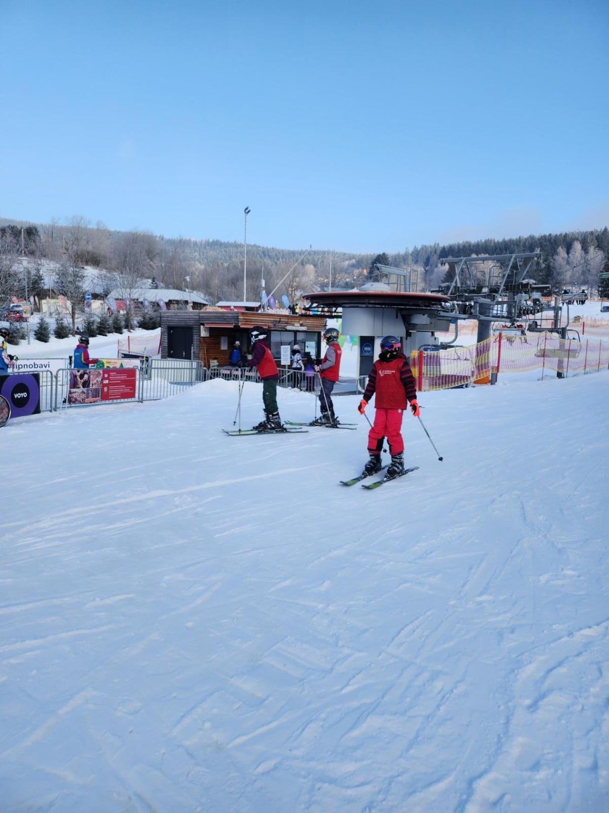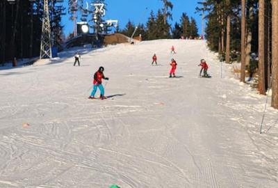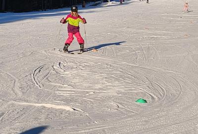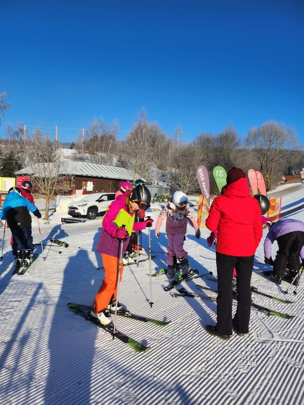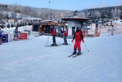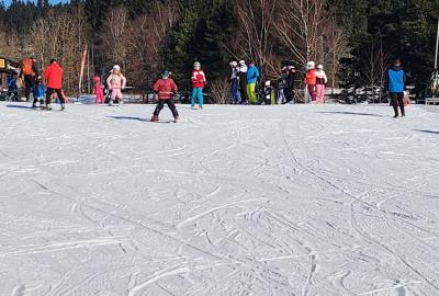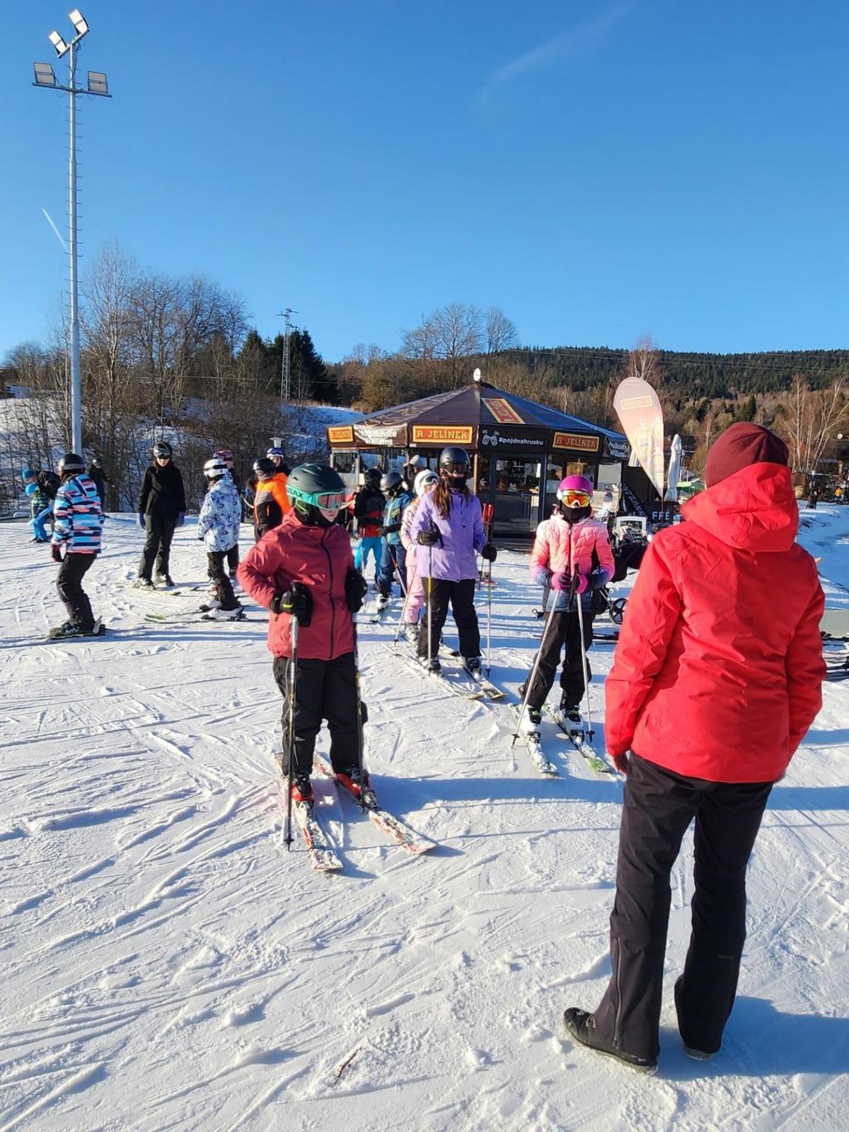 Po ubytování a vydatném obědě jsme se vydali na sjezdovku. Zkušení lyžaři se po seznámení s terénem vydali rovnou na lanovku. Méně zkušení se přesunuli na cvičnou sjezdovku, kde trénovali základy lyžování.