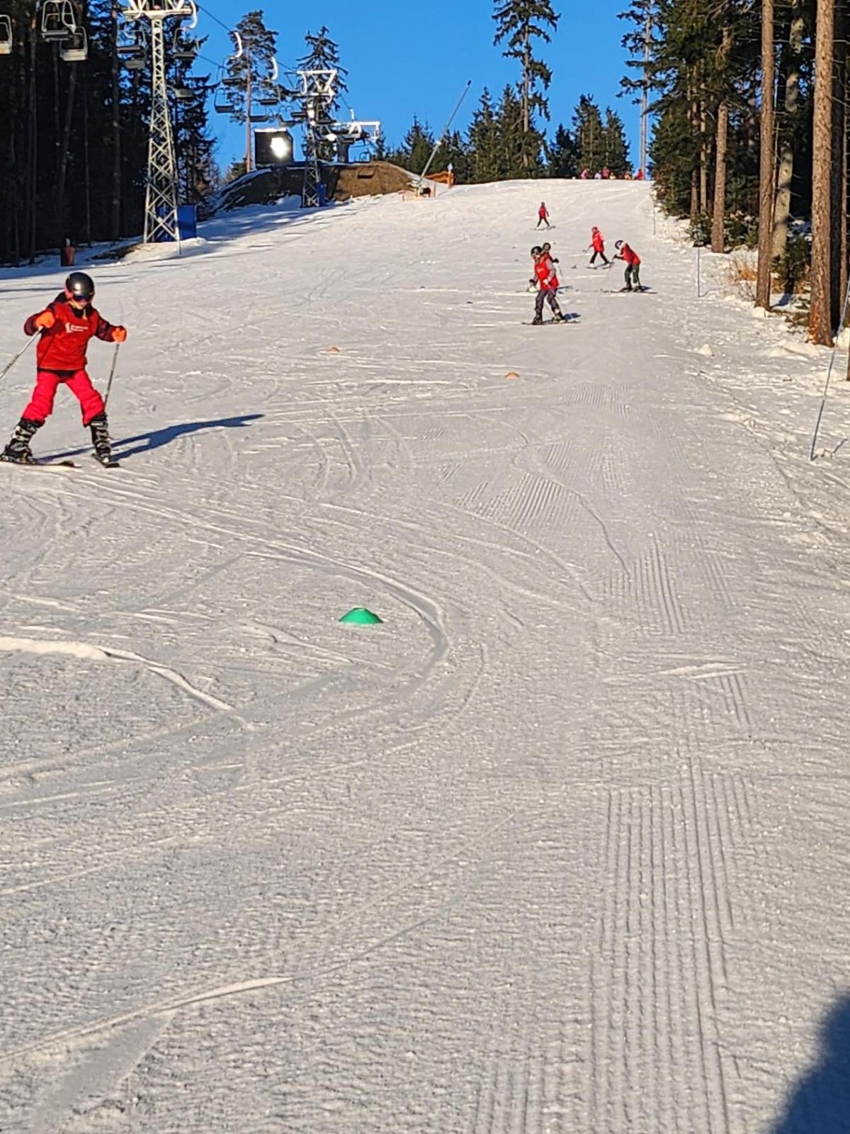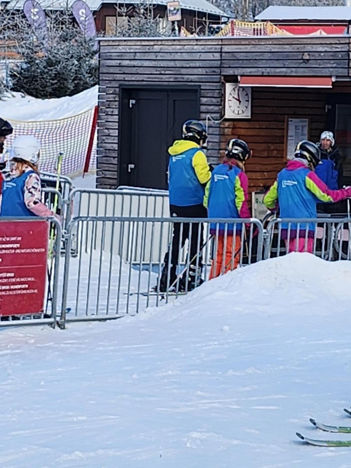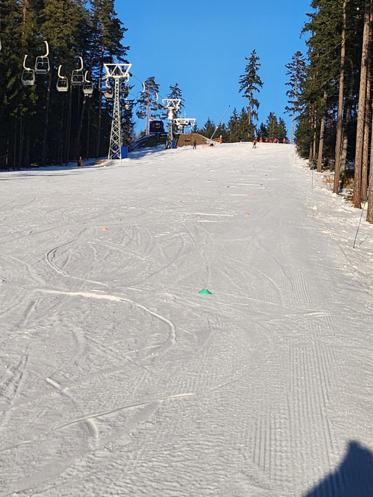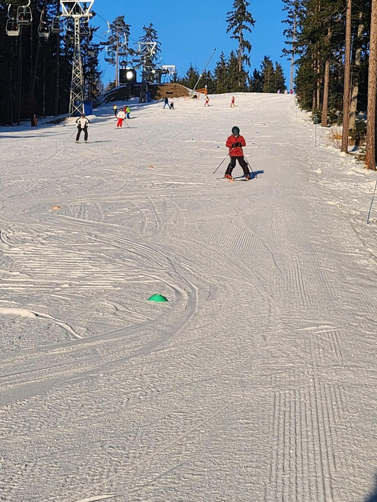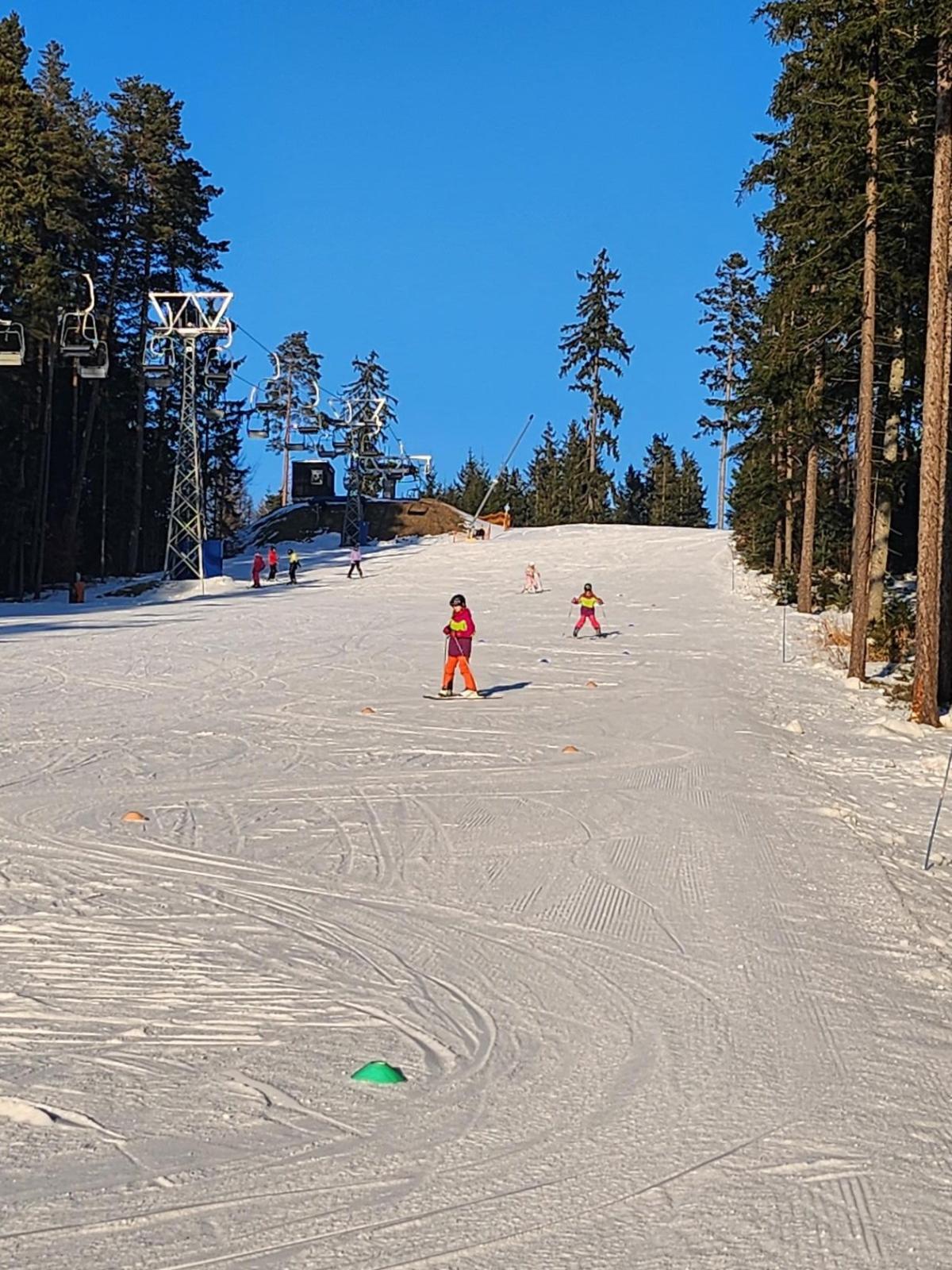 Odpoledne jsme se na chvilku všichni spojili, protože jsme jeli vyzkoušet novou sjezdovku s dvousedačkovou lanovkou. Na této sjezdovce jsme si projeli i slalom.