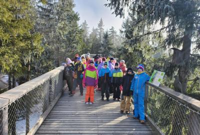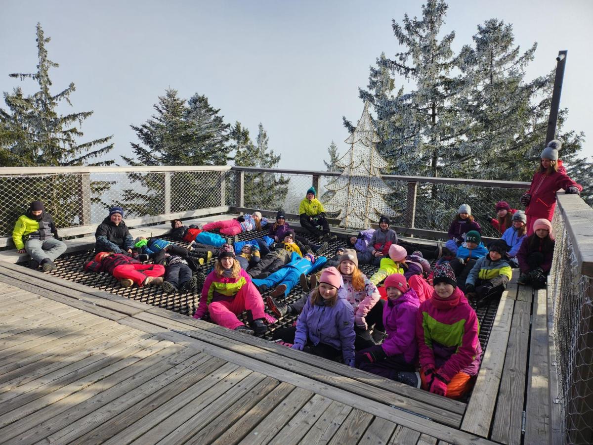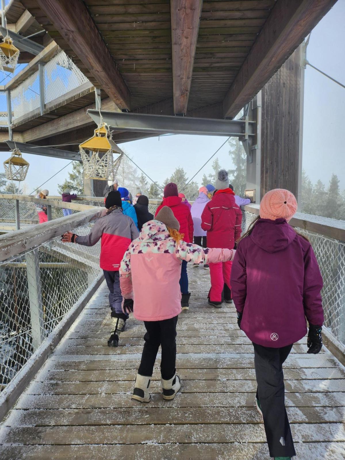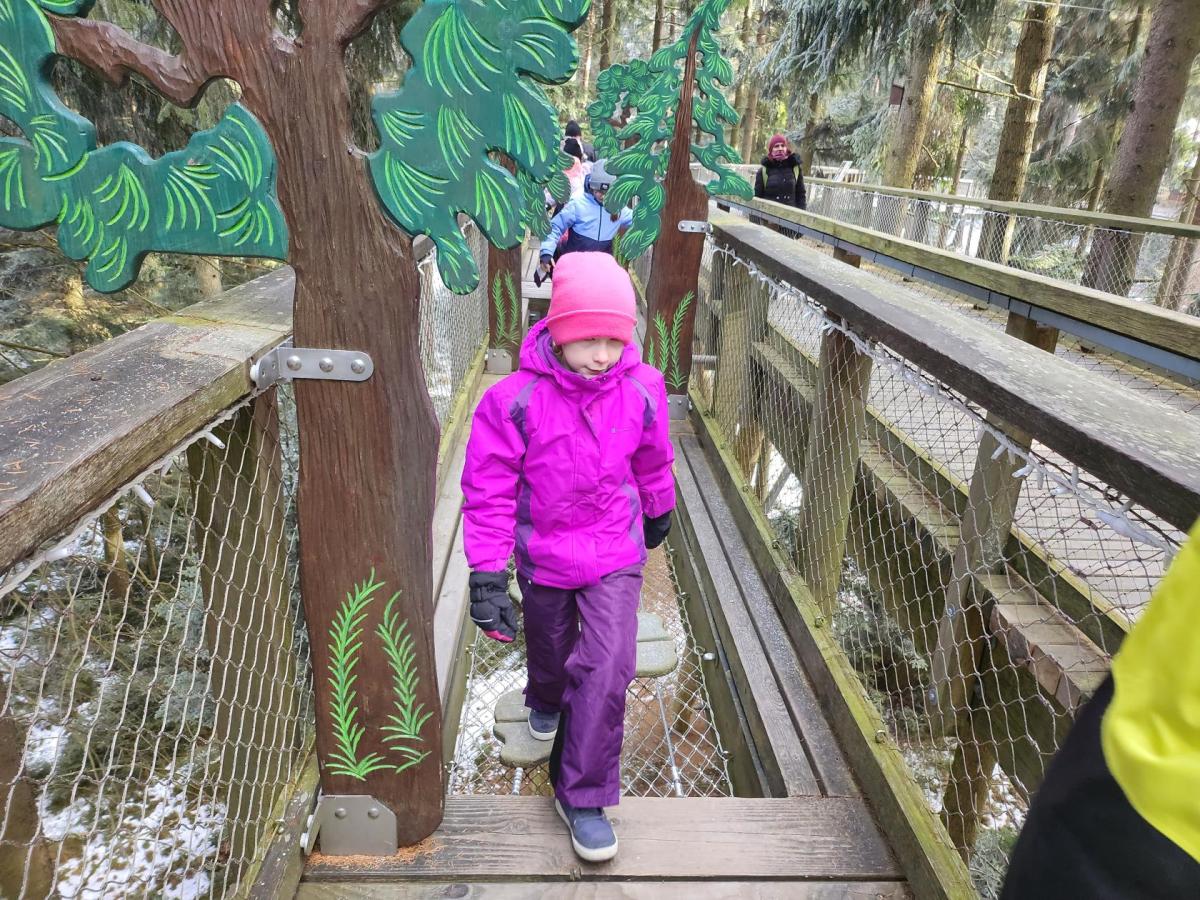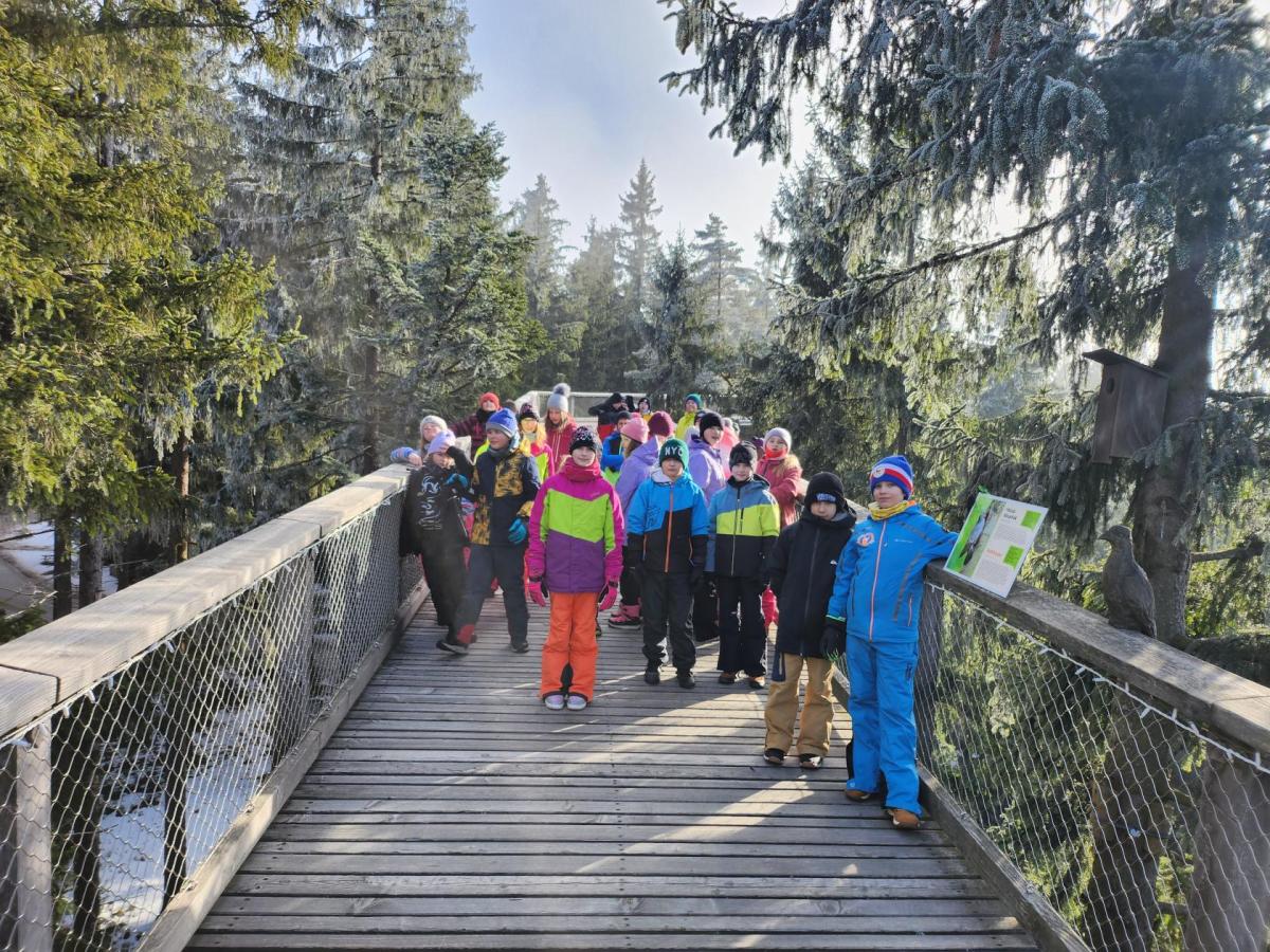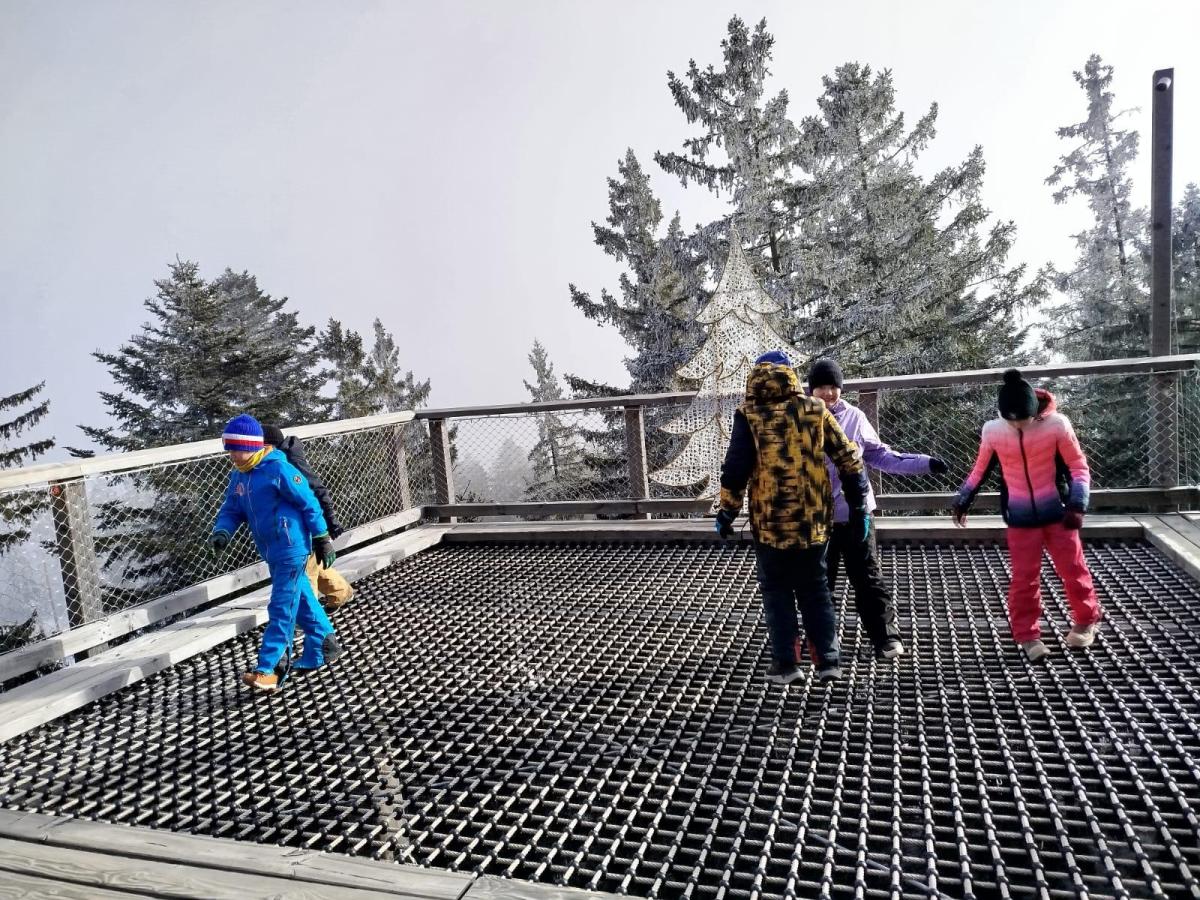 Ráno jsme sice vyrazili na sjezdovku, abychom odstranili poslední nedokonalosti v našem lyžařském umu, ale trošku jsme si to zkrátili. Nebylo to kvůli tomu, že bychom snad neměli energii (té máme na rozdávání), ale jednak na nás čekala paní kuchařka s lívanci se šlehačkou a pak jsme také museli stihnout Stezkabus, který nás vyvezl na Stezku v korunách stromů.