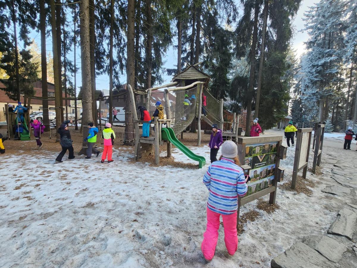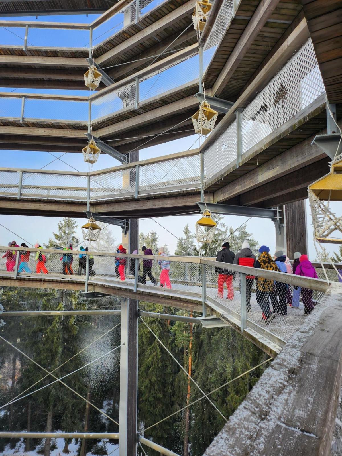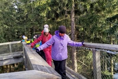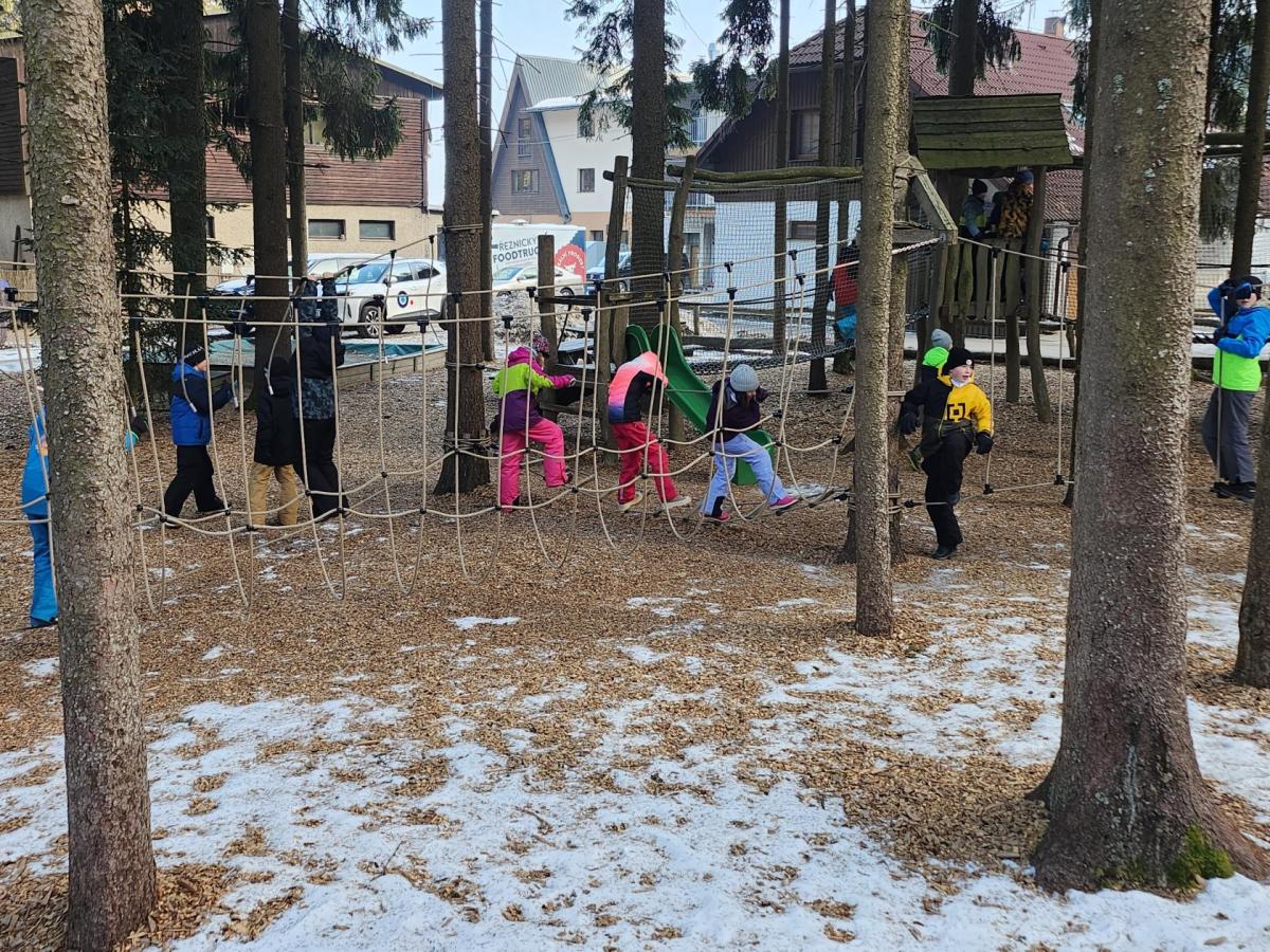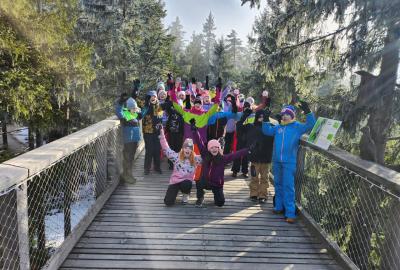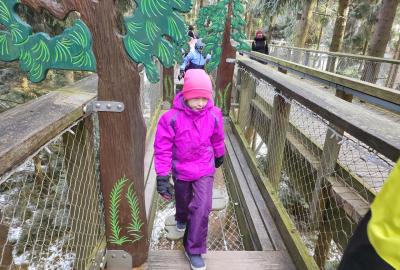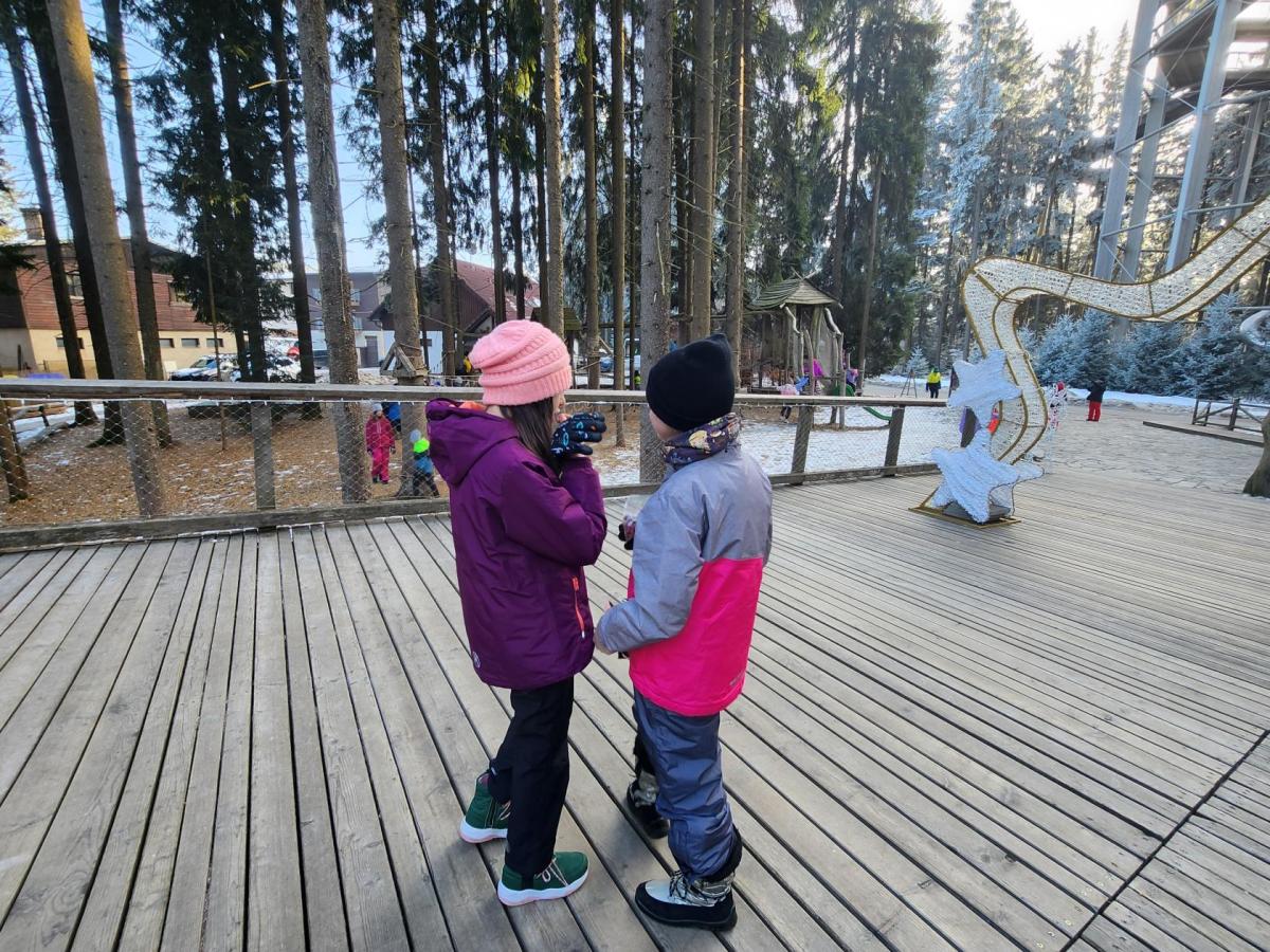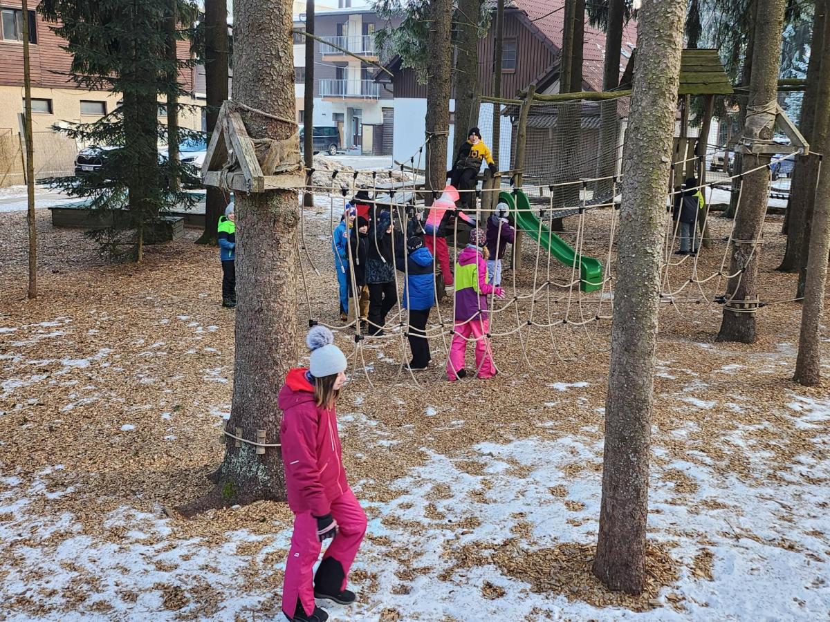 Ráno jsme sice vyrazili na sjezdovku, abychom odstranili poslední nedokonalosti v našem lyžařském umu, ale trošku jsme si to zkrátili. Nebylo to kvůli tomu, že bychom snad neměli energii (té máme na rozdávání), ale jednak na nás čekala paní kuchařka s lívanci se šlehačkou a pak jsme také museli stihnout Stezkabus, který nás vyvezl na Stezku v korunách stromů.