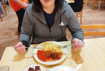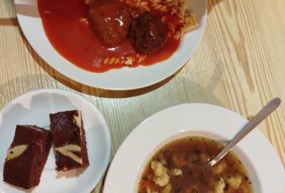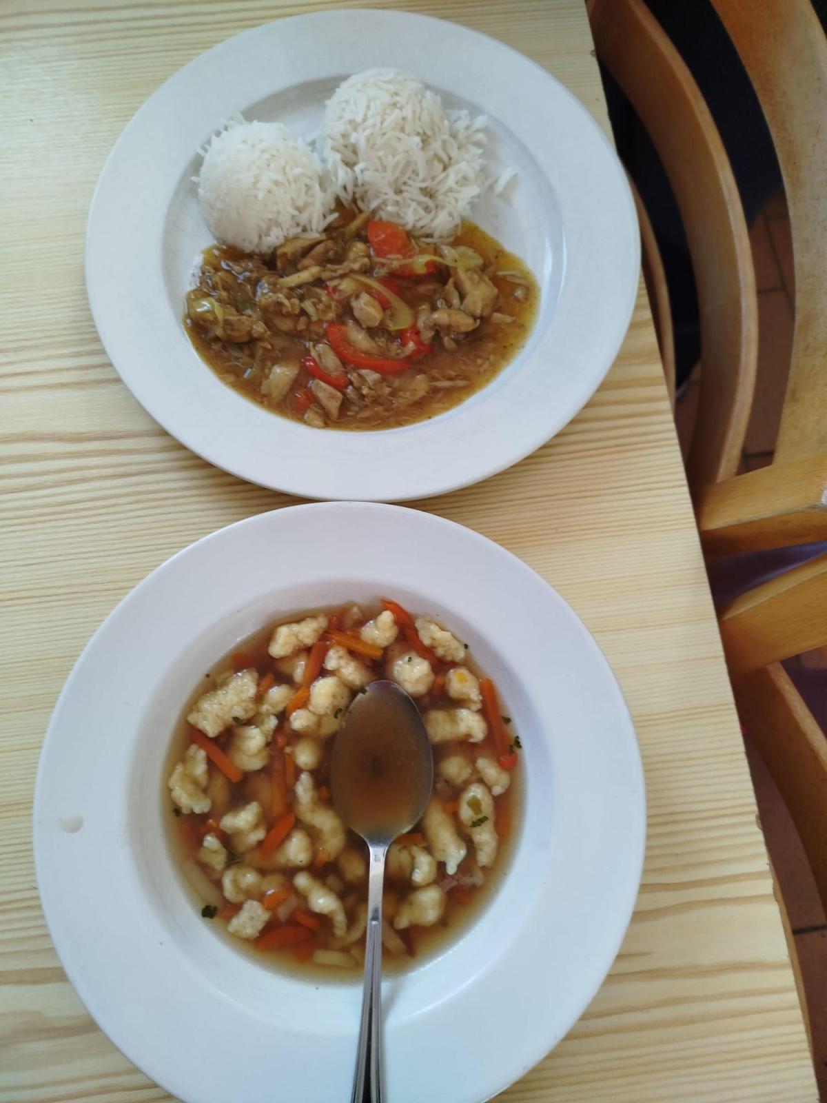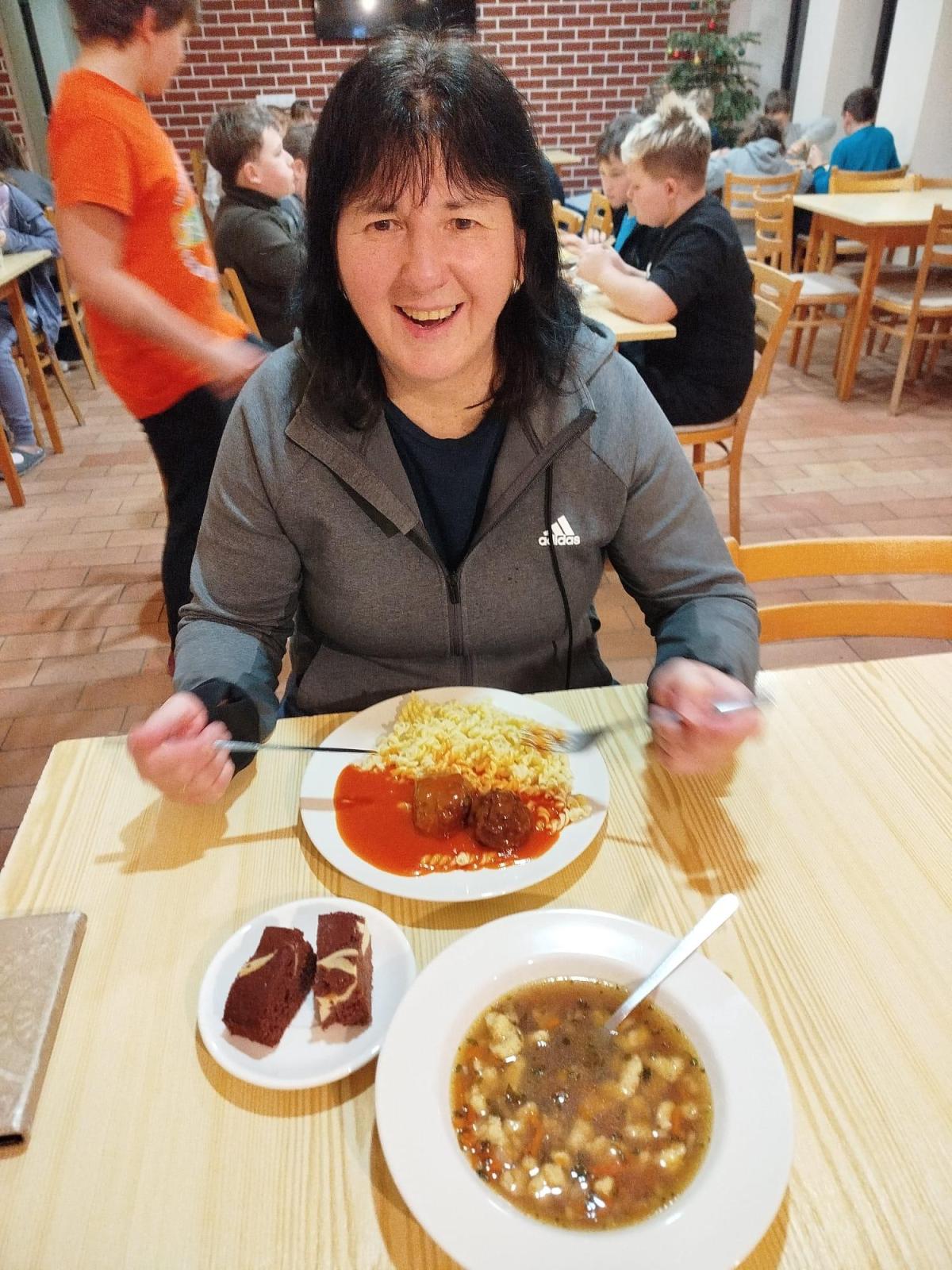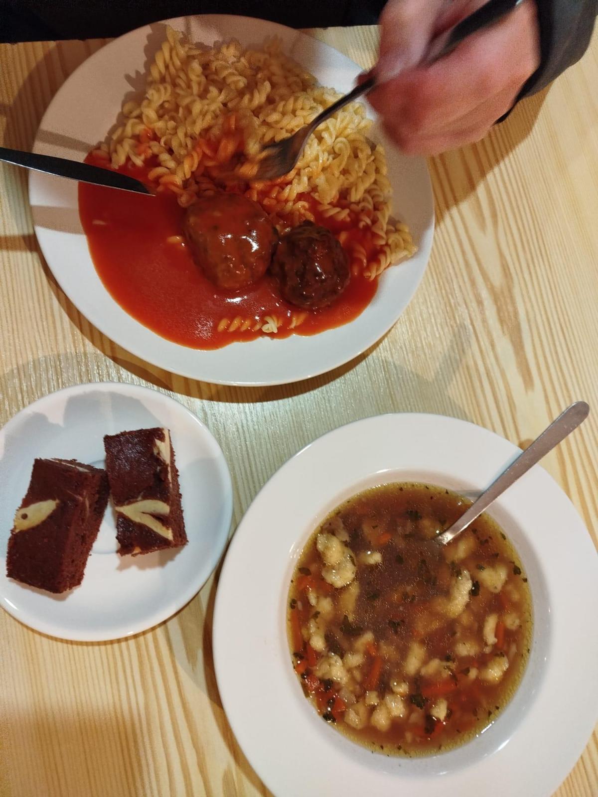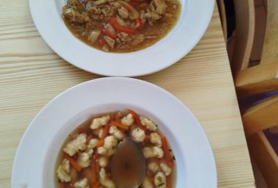 Za odměnu na nás čekaly paní kuchařky s výborným obědem - vývar s játrovou zavářkou a špagety Bolognese.