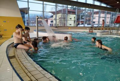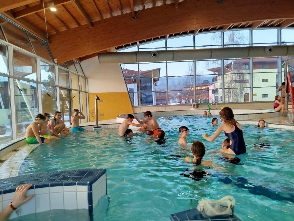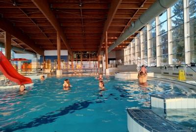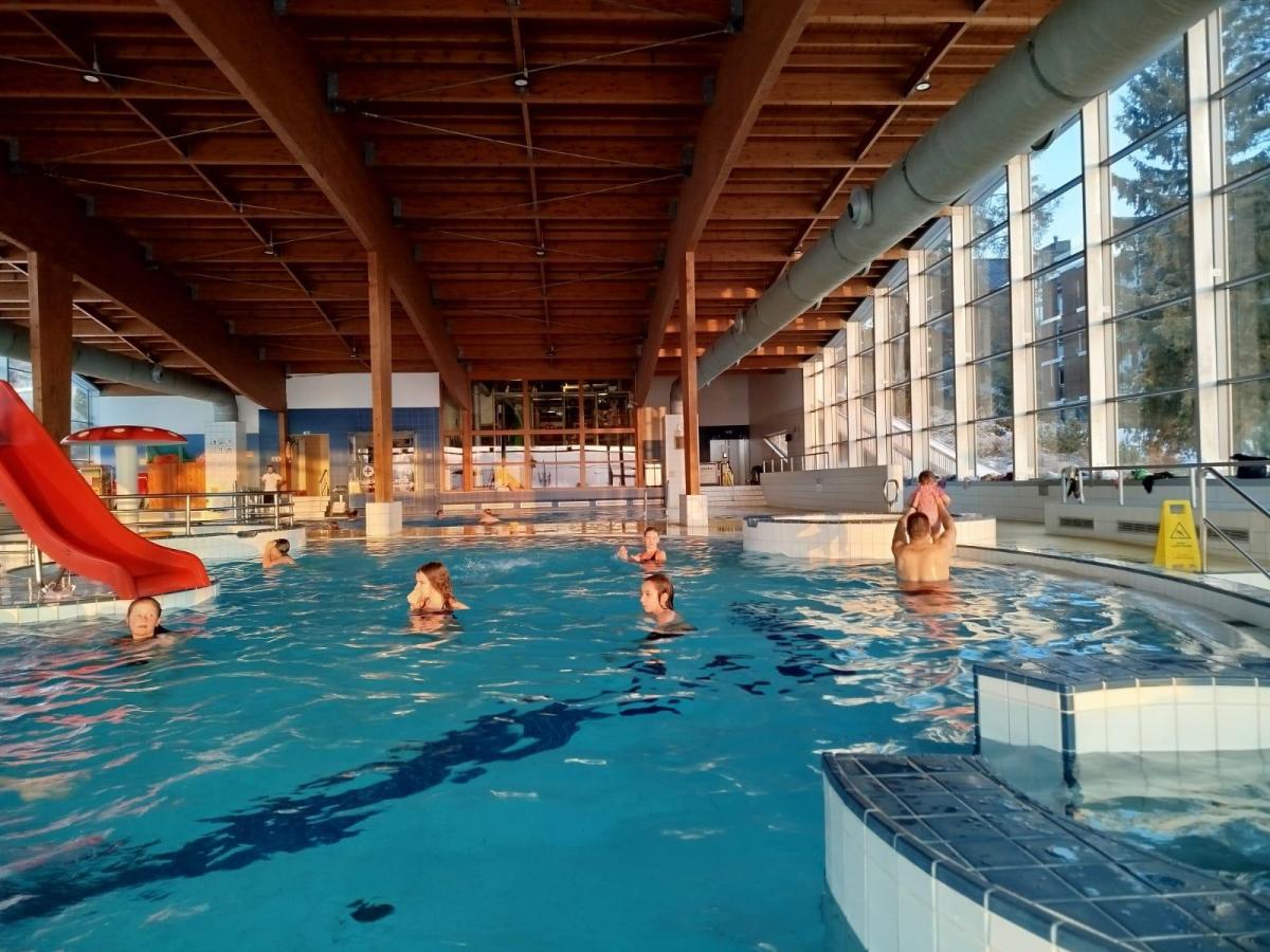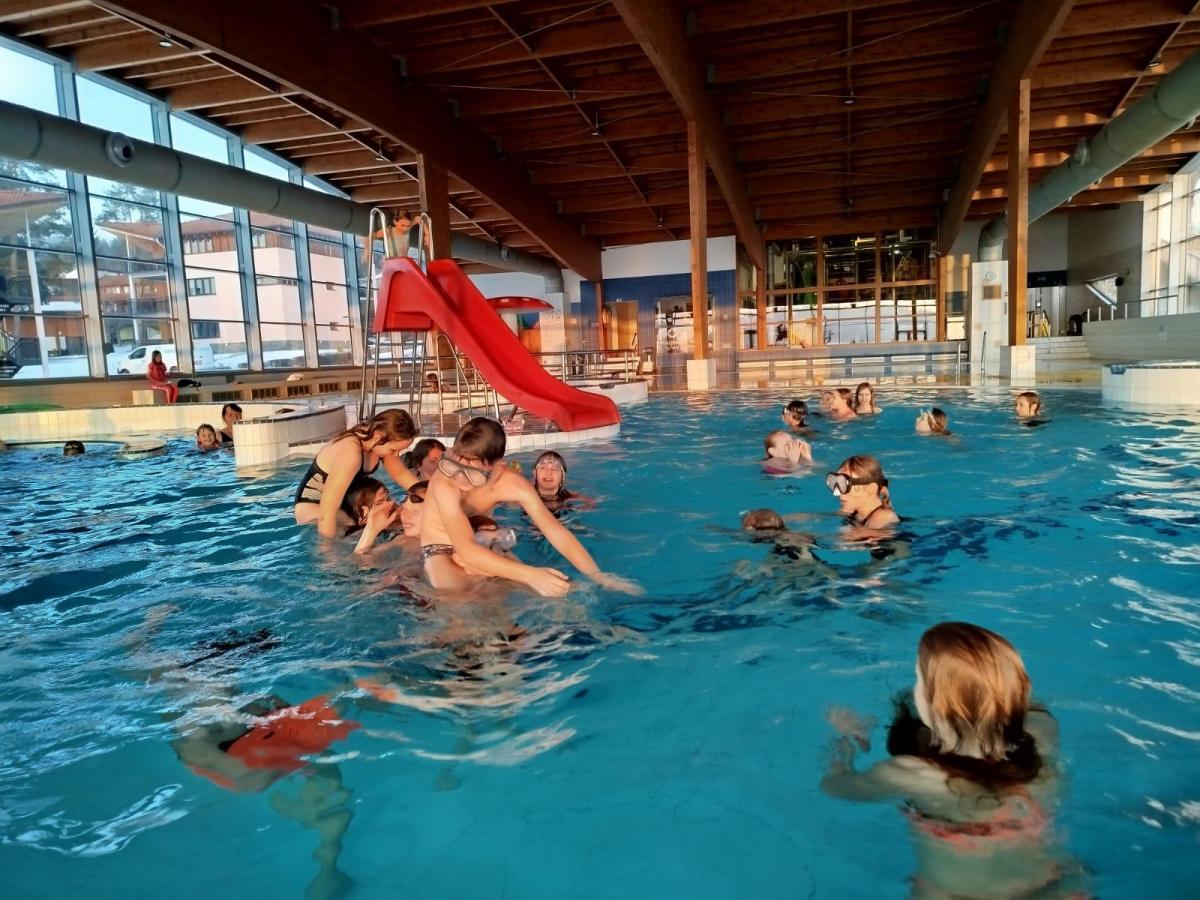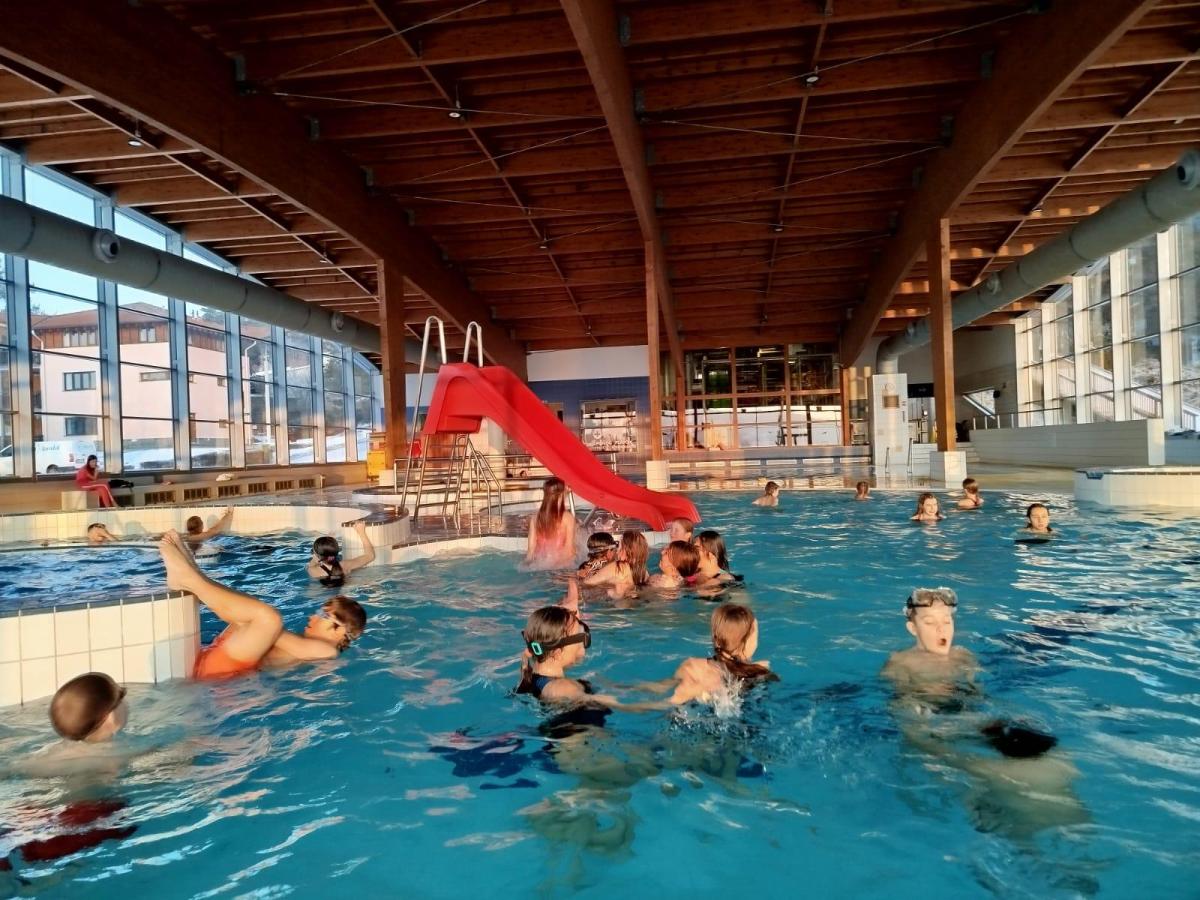 Ze Stezky jsme se vydali pěšky zpět na parkoviště, kde jsme si v autobusu vyzvedli potřebné věci a odebrali se na místní plavecký bazén, kde jsme si zařádili v divoké vodě, na skluzavce a ve vířivce.