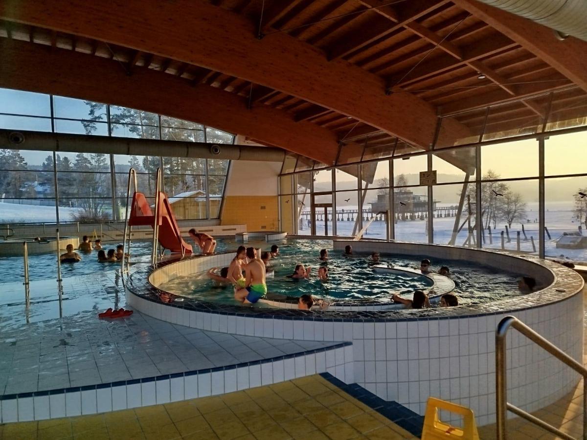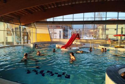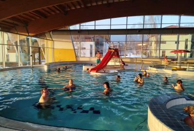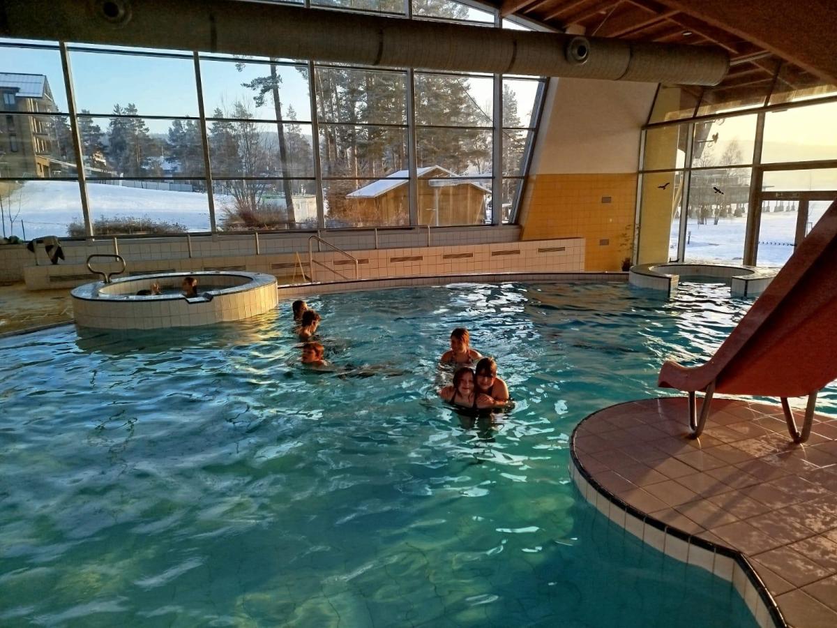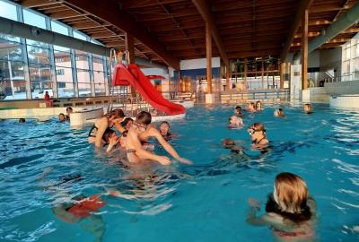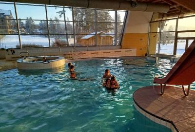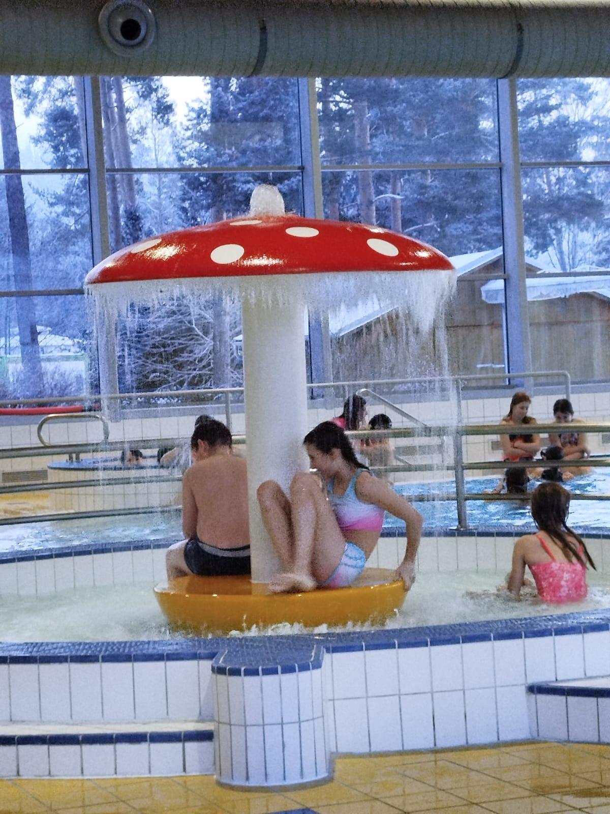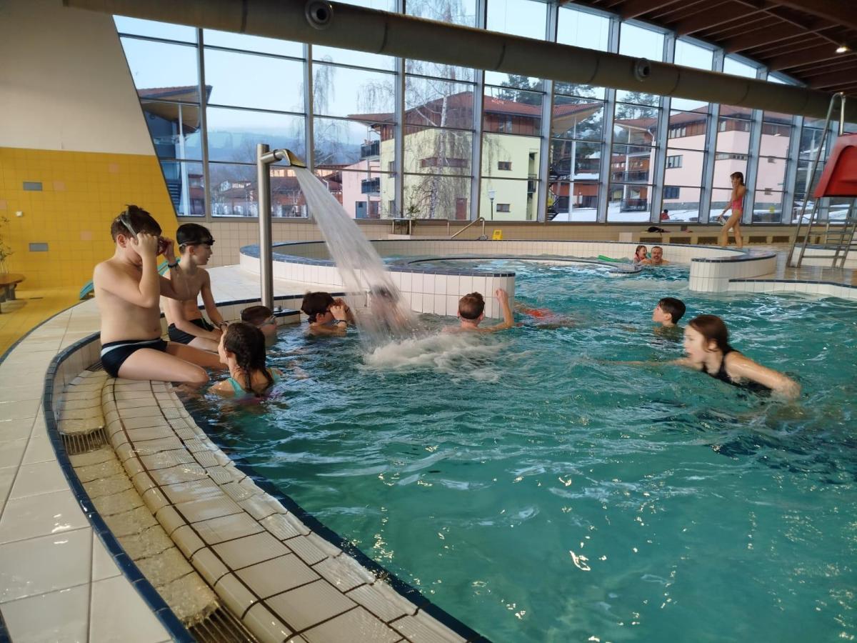 Ze Stezky jsme se vydali pěšky zpět na parkoviště, kde jsme si v autobusu vyzvedli potřebné věci a odebrali se na místní plavecký bazén, kde jsme si zařádili v divoké vodě, na skluzavce a ve vířivce.