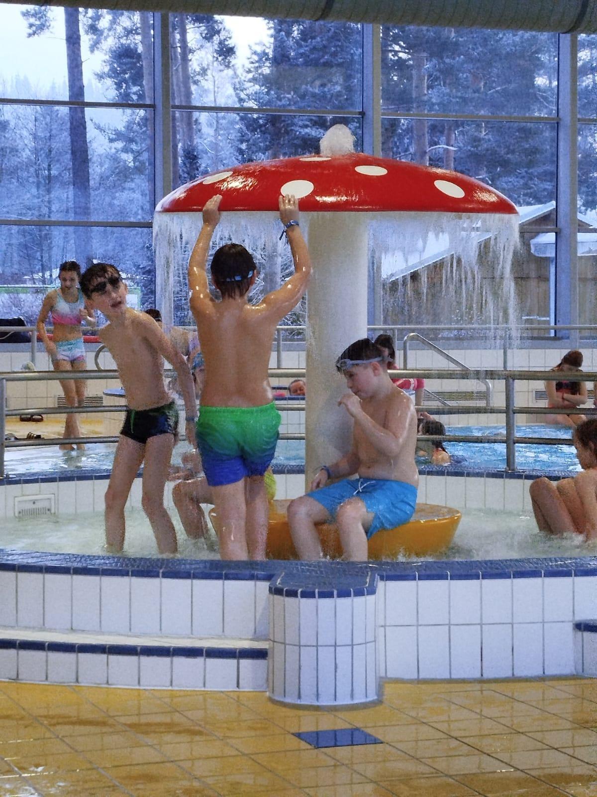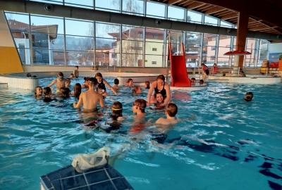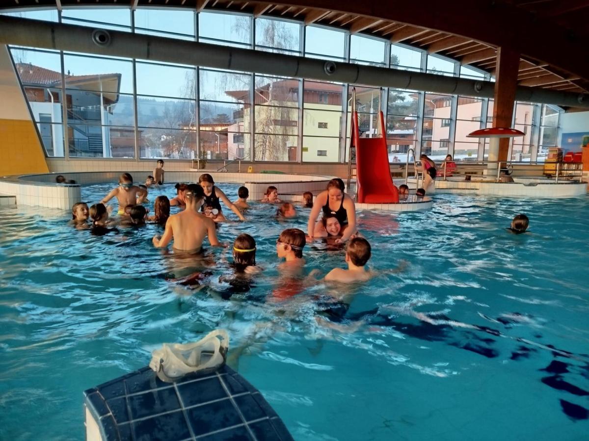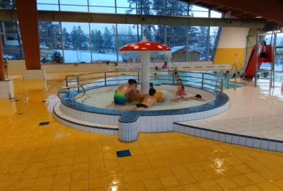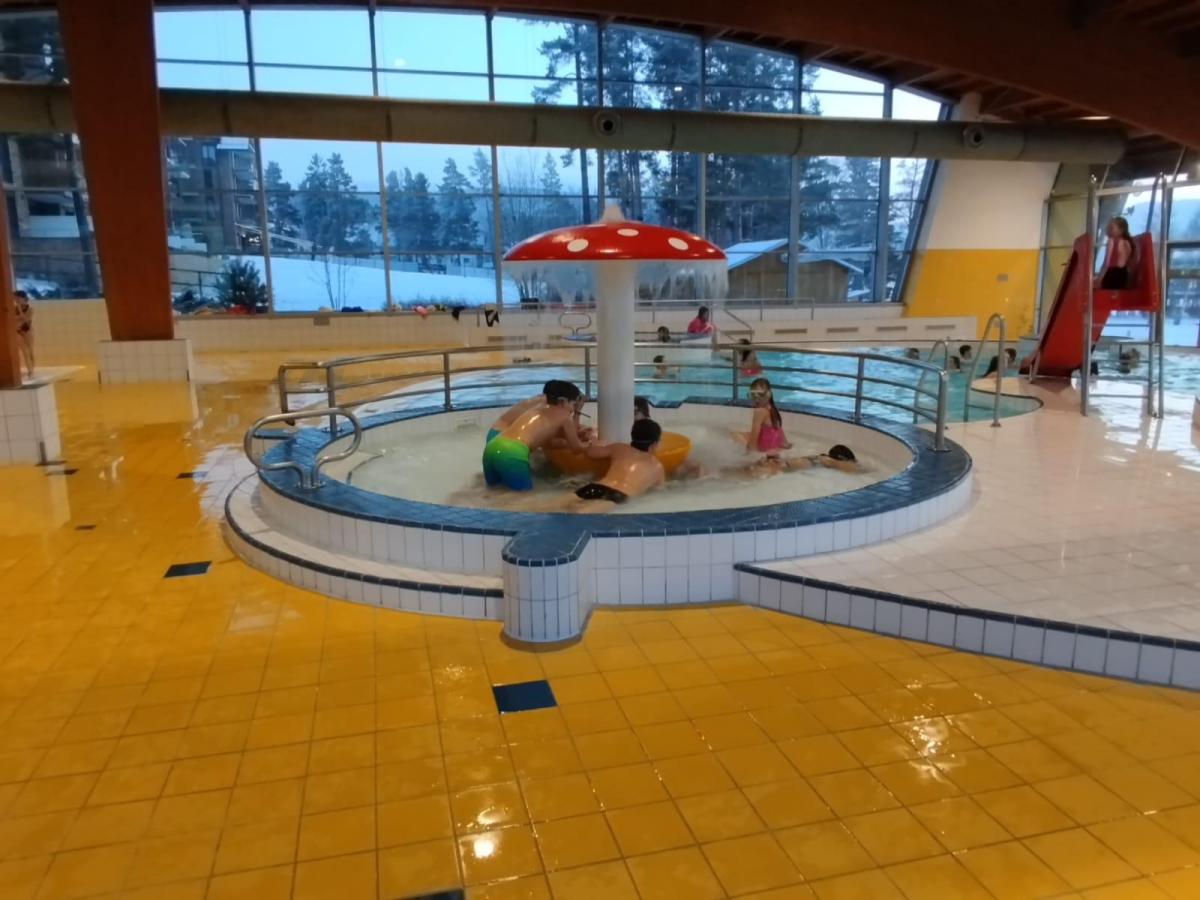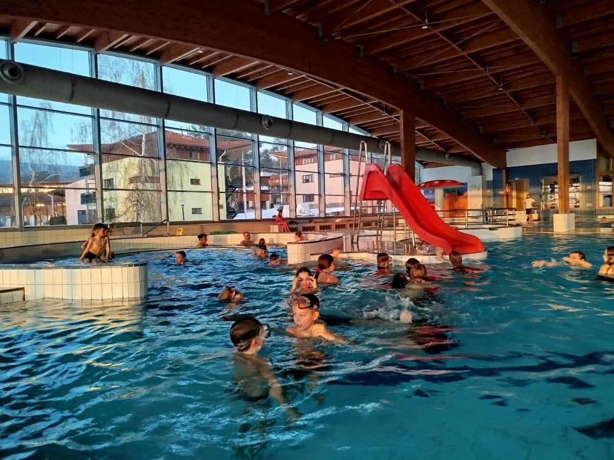 Ze Stezky jsme se vydali pěšky zpět na parkoviště, kde jsme si v autobusu vyzvedli potřebné věci a odebrali se na místní plavecký bazén, kde jsme si zařádili v divoké vodě, na skluzavce a ve vířivce.