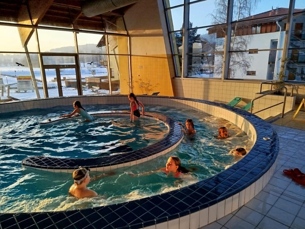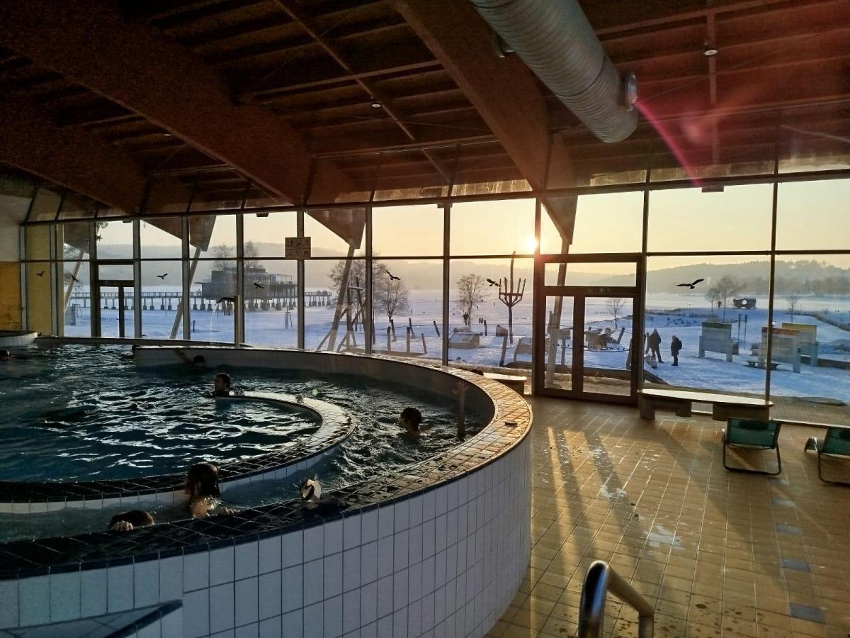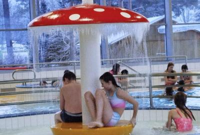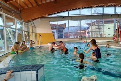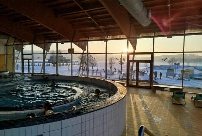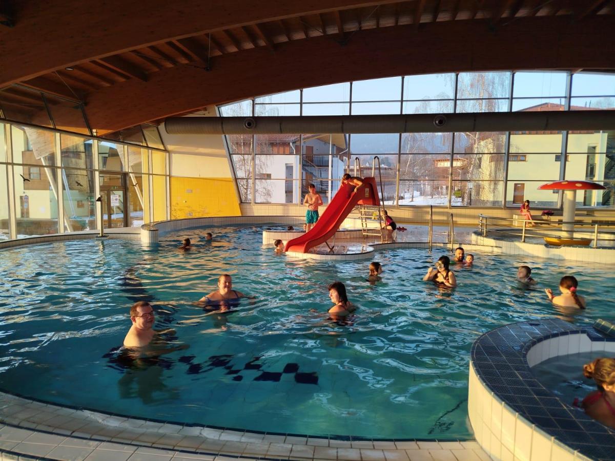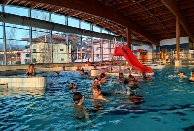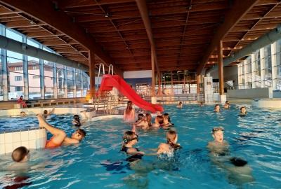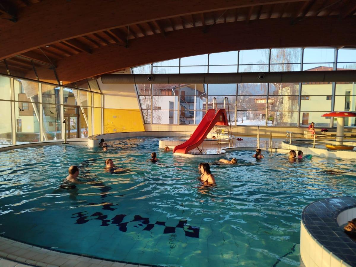 Ze Stezky jsme se vydali pěšky zpět na parkoviště, kde jsme si v autobusu vyzvedli potřebné věci a odebrali se na místní plavecký bazén, kde jsme si zařádili v divoké vodě, na skluzavce a ve vířivce.