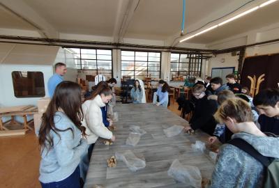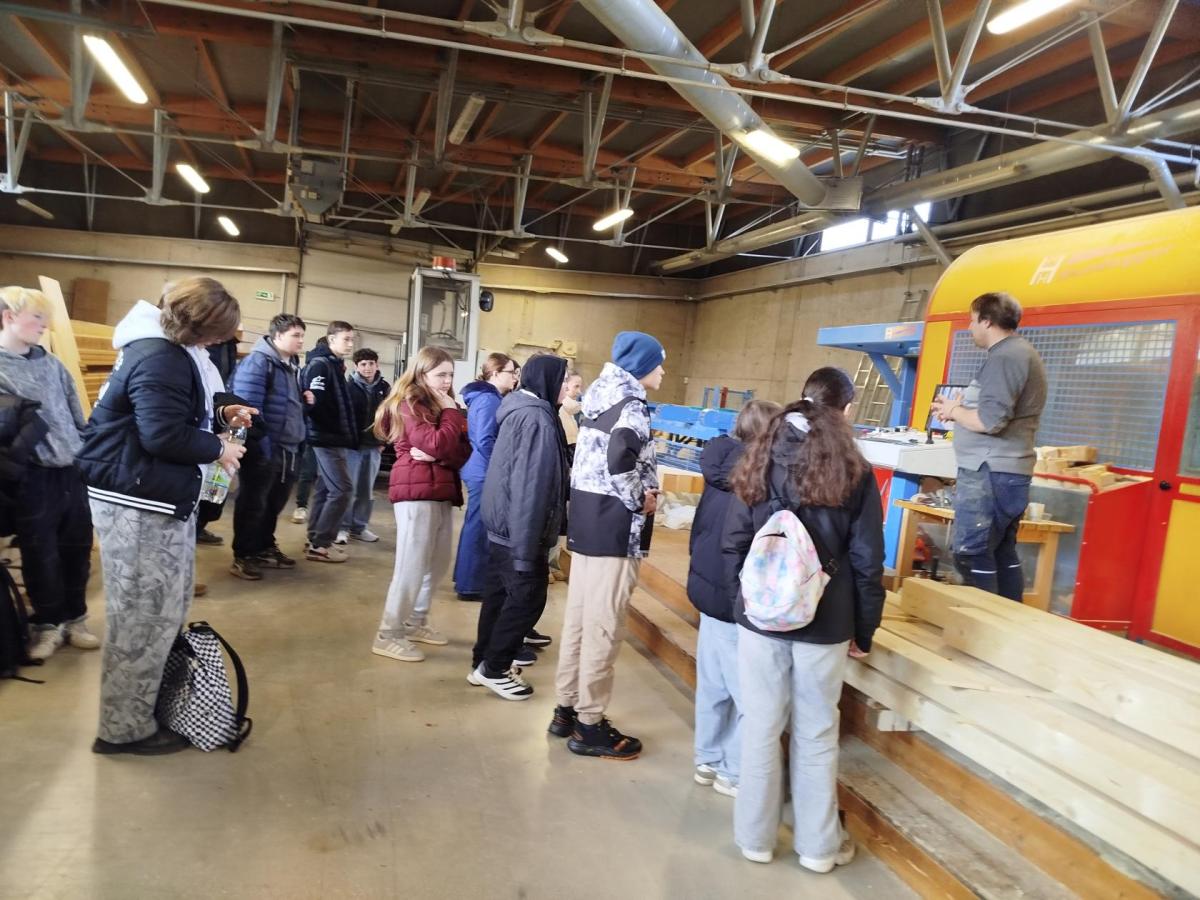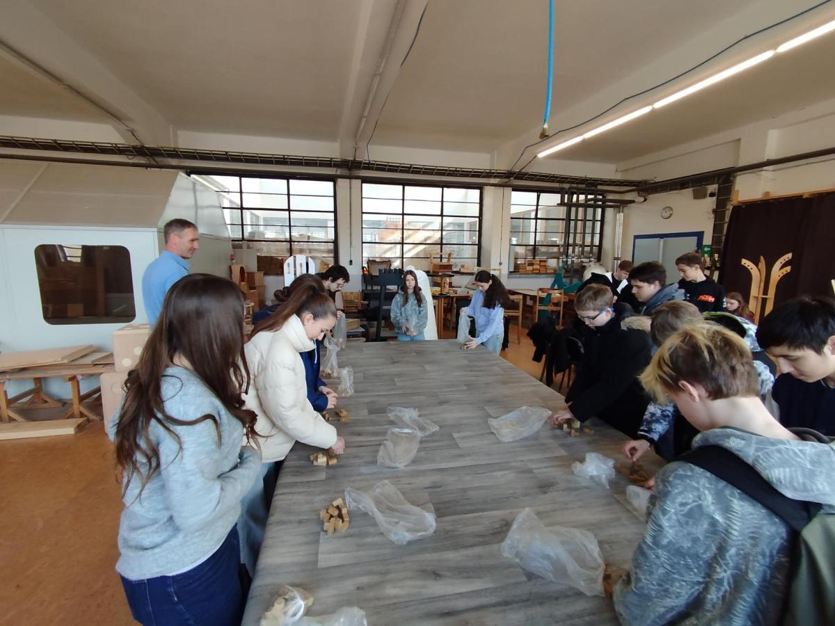 Pak jsme se rozdělili na tři skupiny podle tříd a vyrazili jsme postupně na prohlídku školy. Navštívili jsme místní knihovnu se studovnou. Prohlédli jsme si tělocvičny, které jim bohužel můžeme díky velikosti a vybavenosti jen závidět. Dále jsme si prošli jejich dílny a učebnu informatiky, kde jsme si na počítači zkusili sestavit nábytek. Tři vítězové z každé skupiny obdrželi drobné dárky. Ale ani ostatní nepřišli zkrátka, všichni dostali pravítko, na kterém je vypáleno jejich jméno. Velmi zajímavá byla návštěva jejich haly s CNC strojem, na kterém nám vyrobili malý dárek do třídy. V závěru nám představili studijní obory této školy.