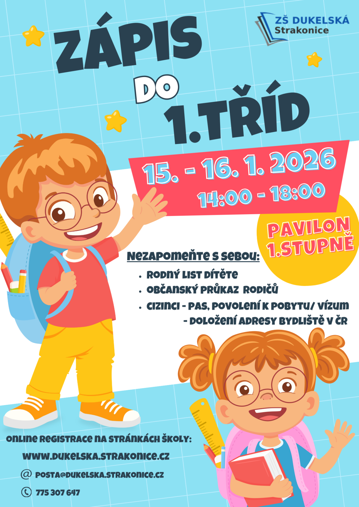 ve dnech 15. a 16. 1. 2026 proběhne zápis do 1. tříd. Prosíme vás, abyste se zaregistrovali na konkrétní datum a čas prostřednictvím aplikace ZapisyOnline. Díky tomu zajistíme, že nebudete muset trávit dlouhou dobu ve frontě a zároveň každému budoucímu prvňáčkovi budeme moci věnovat dostatek času. Registrace bude možná prostřednictvím banneru na konci článku, který bude aktivní od 8. 12. 2025.