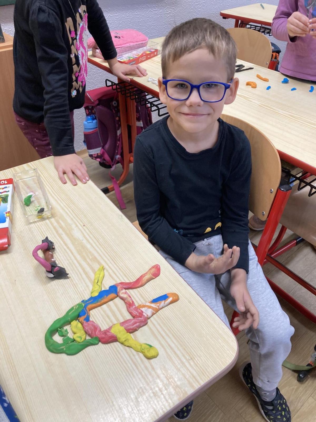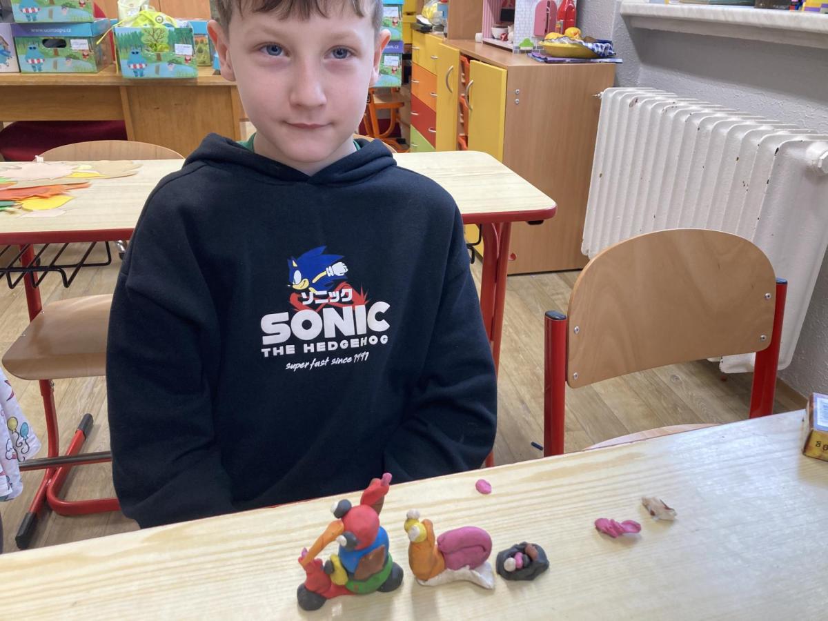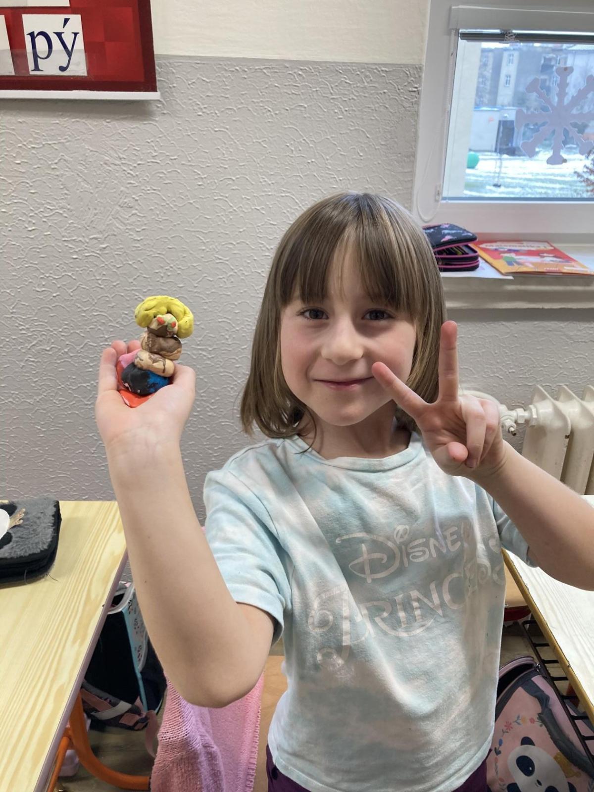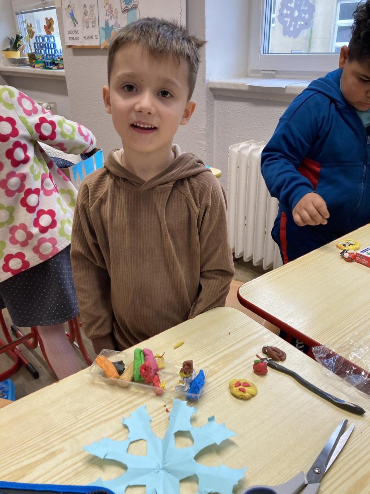 Při pracovních činnostech jsme se pro tentokrát pustili do zimní výzdoby třídy. Nazdobili jsme si okna i pelíšek pro Apu. Nejvíce nás ale bavil závěr hodiny, v kterém jsme si mohli něco modelovat. Zapojili jsme veškerou fantazii i šikovné ručičky.