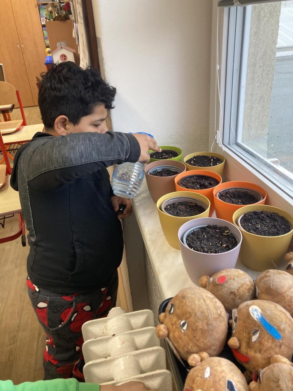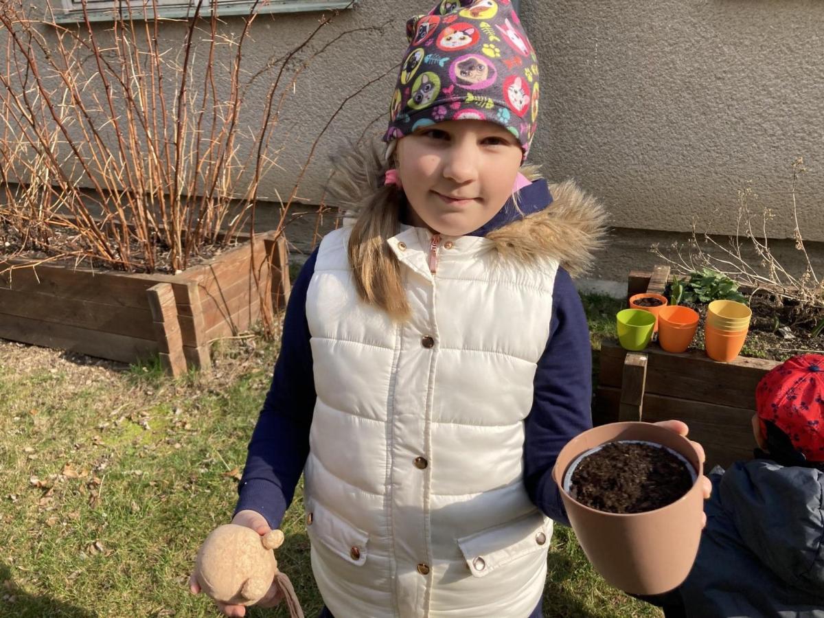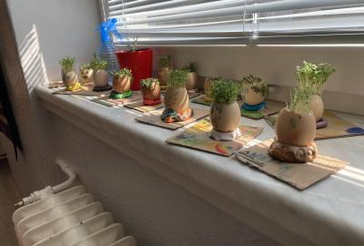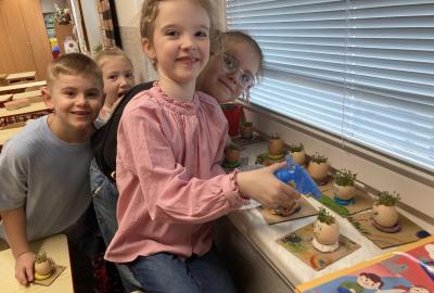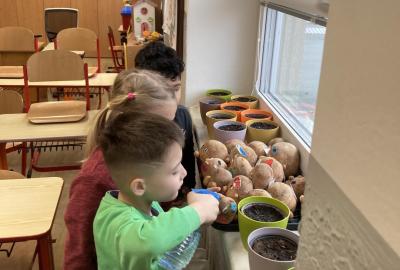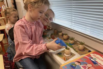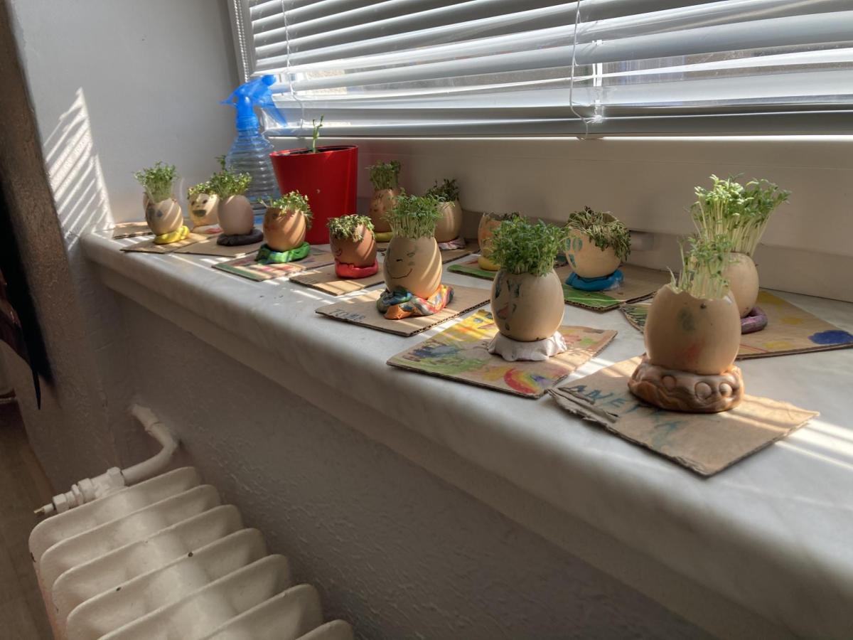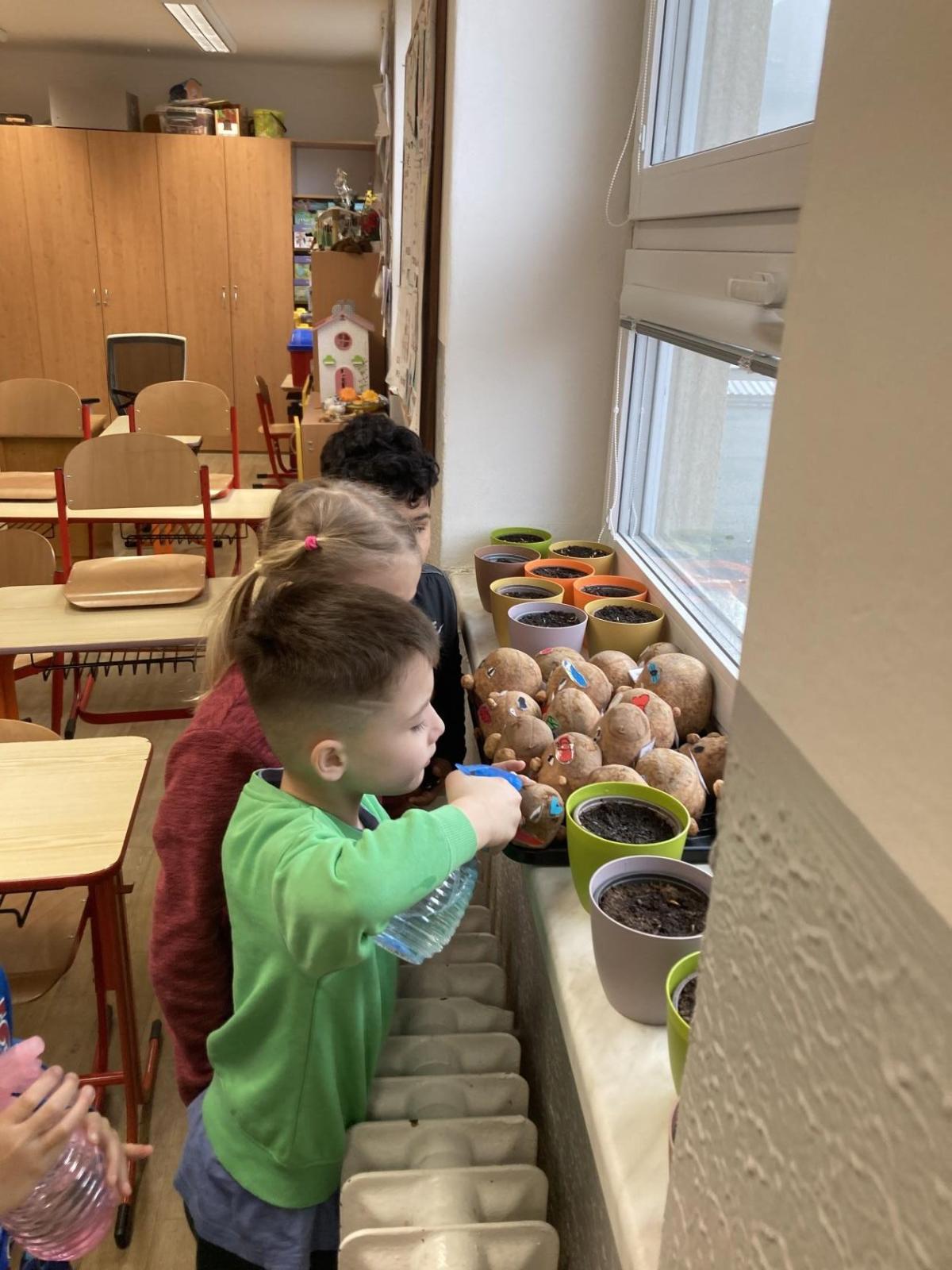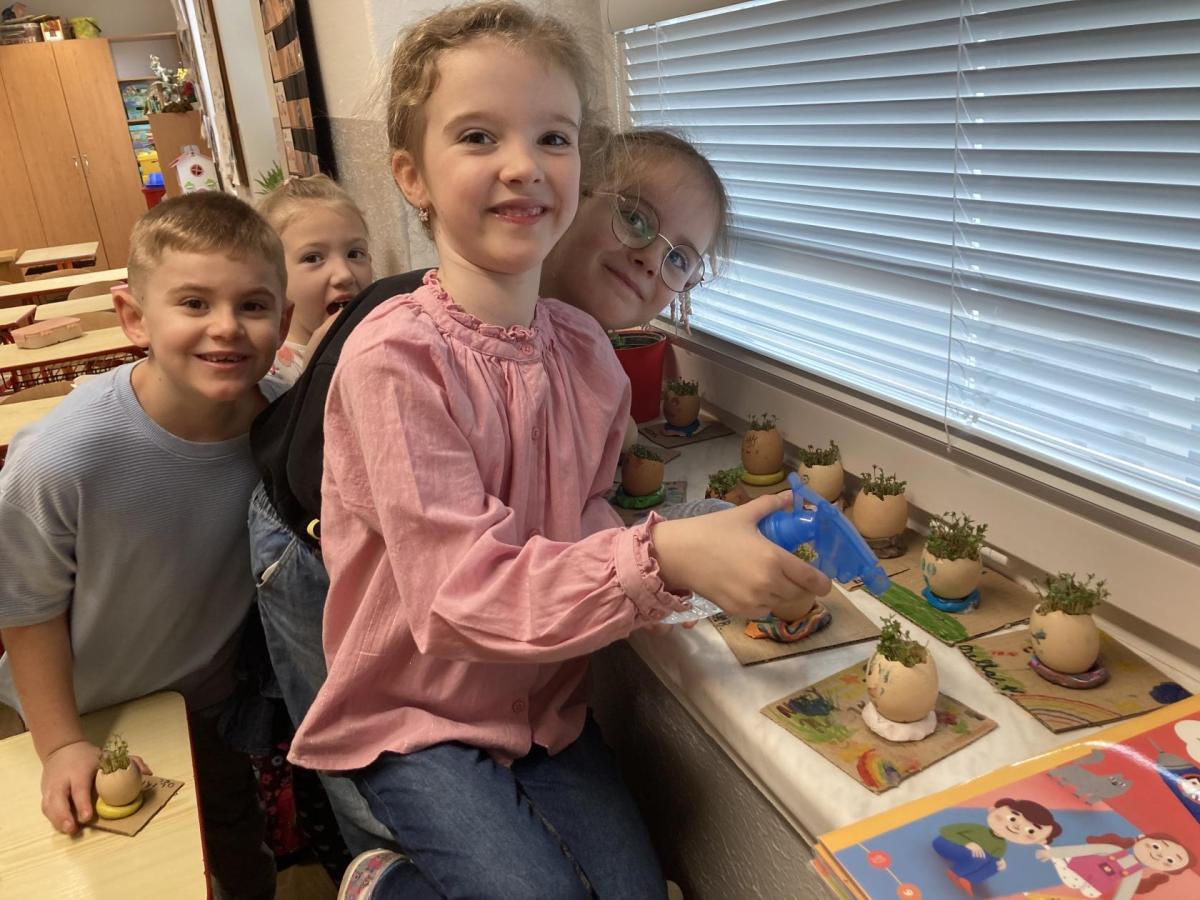 Vyrobili jsme si také veselé „pány Bramboráky“, zaseli jsme osení a učíme se, jak správně pečovat o rostlinky. S velkým zájmem pozorujeme, jak z malého semínka postupně roste hrášek, a radost nám dělají i řeřichové „vlásky“, které jsme zaseli našim pánům vajíčkům.