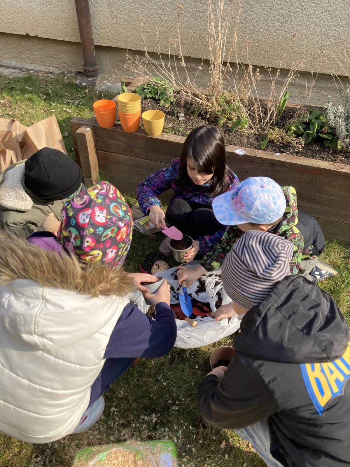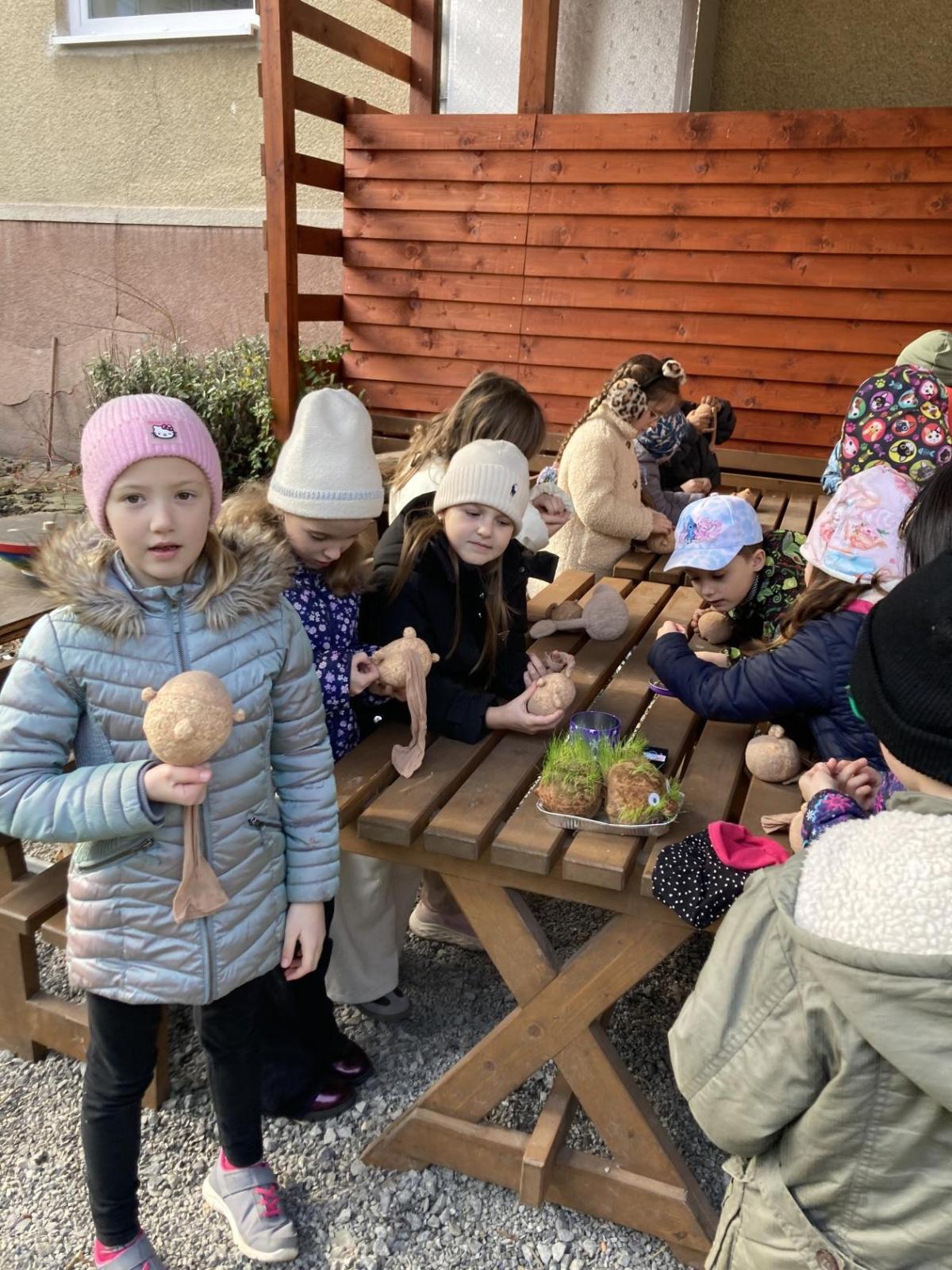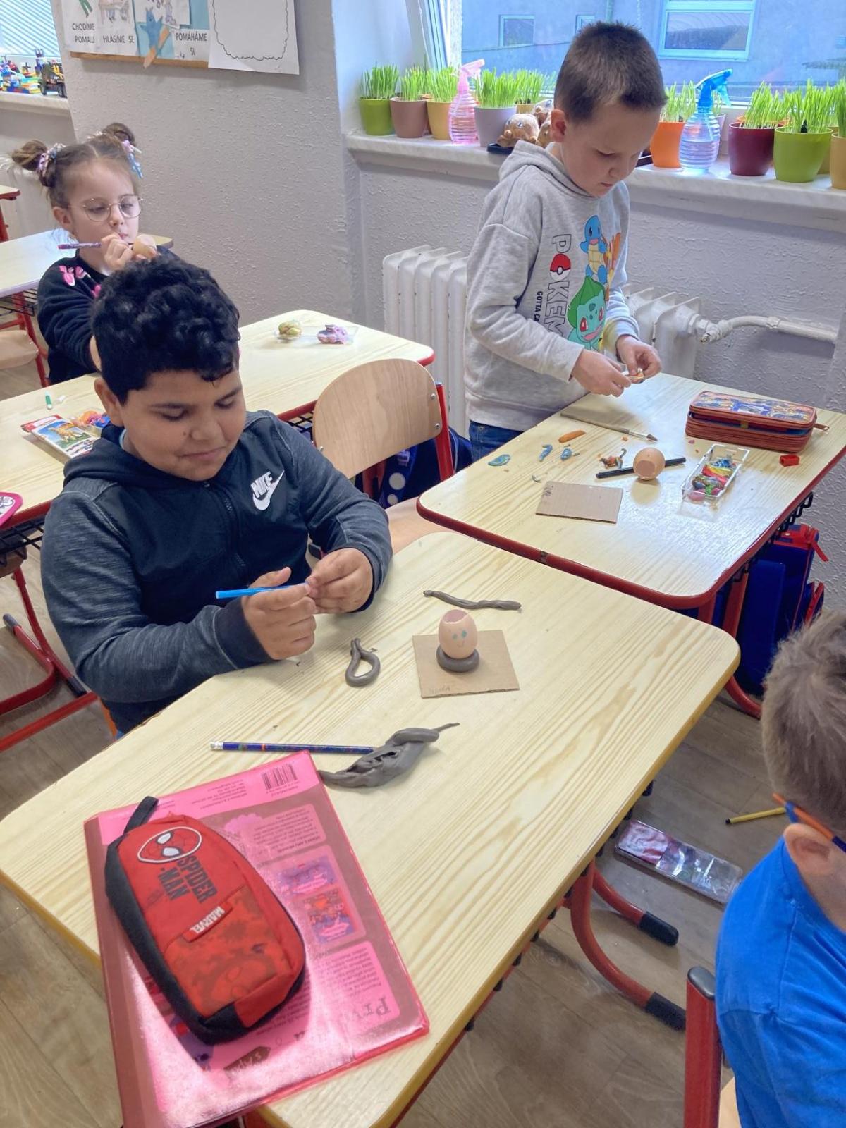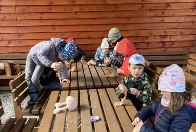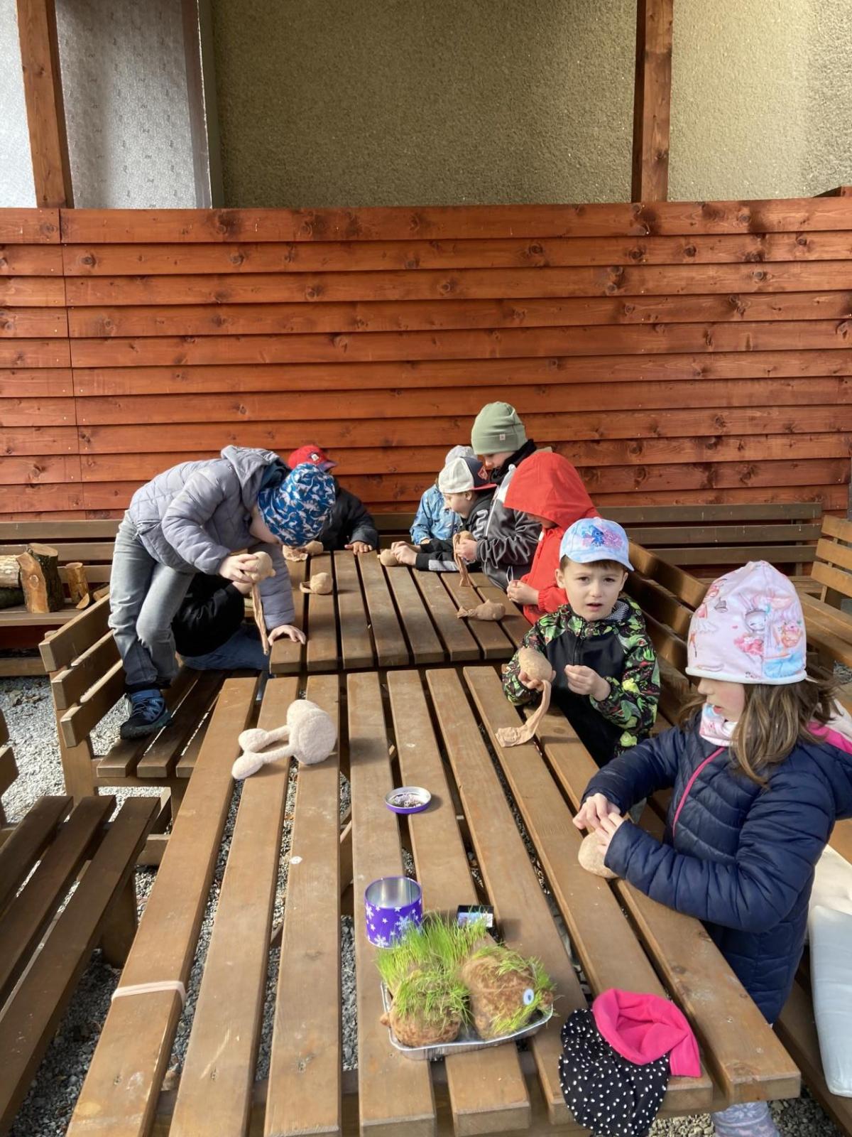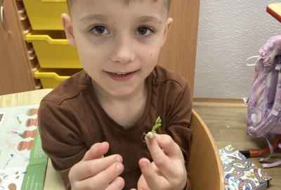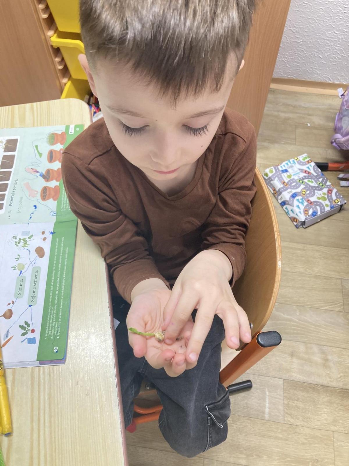 Vyrobili jsme si také veselé „pány Bramboráky“, zaseli jsme osení a učíme se, jak správně pečovat o rostlinky. S velkým zájmem pozorujeme, jak z malého semínka postupně roste hrášek, a radost nám dělají i řeřichové „vlásky“, které jsme zaseli našim pánům vajíčkům.