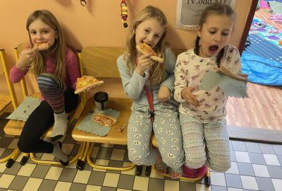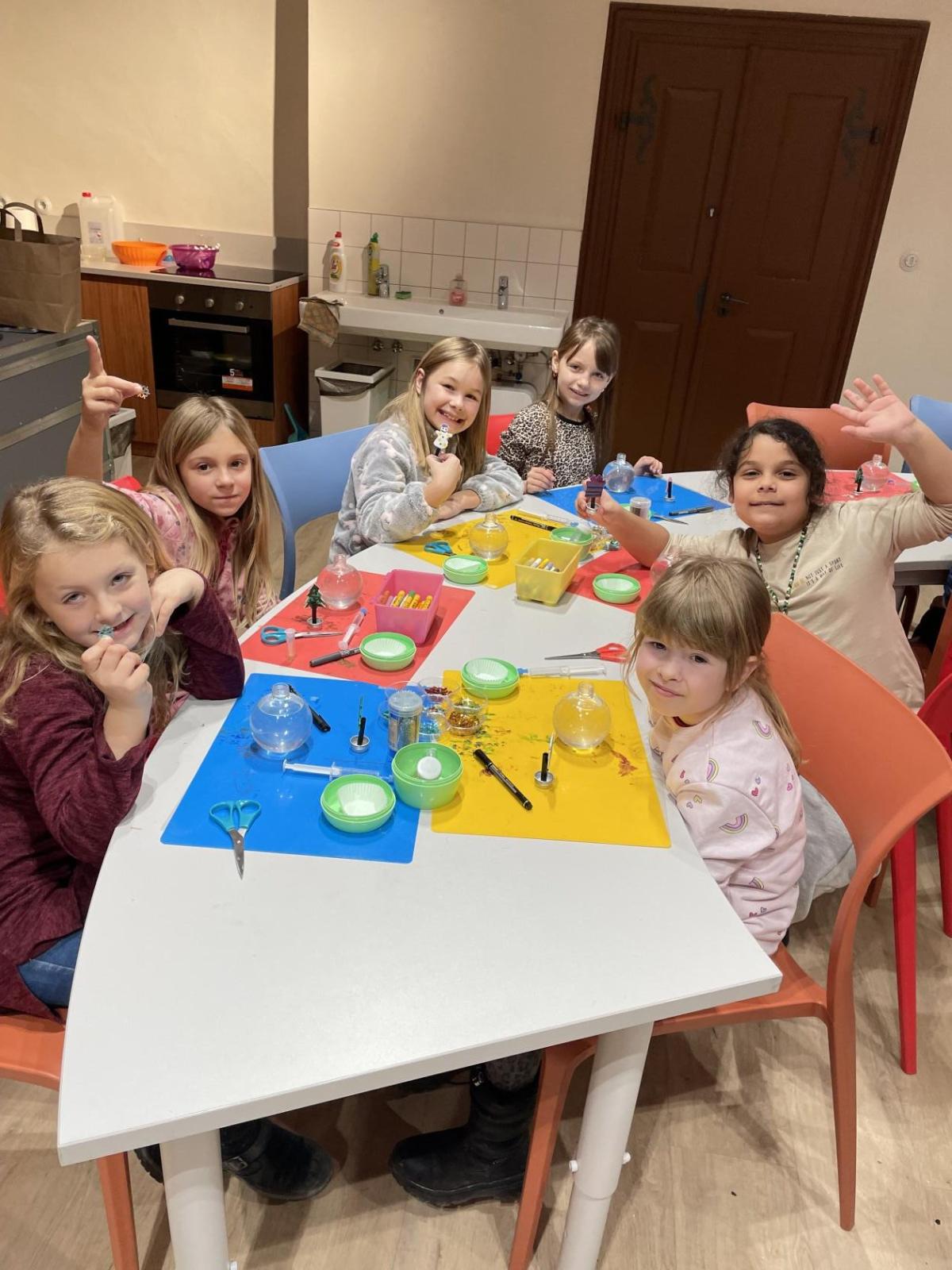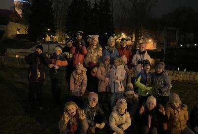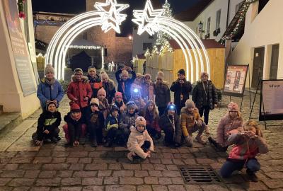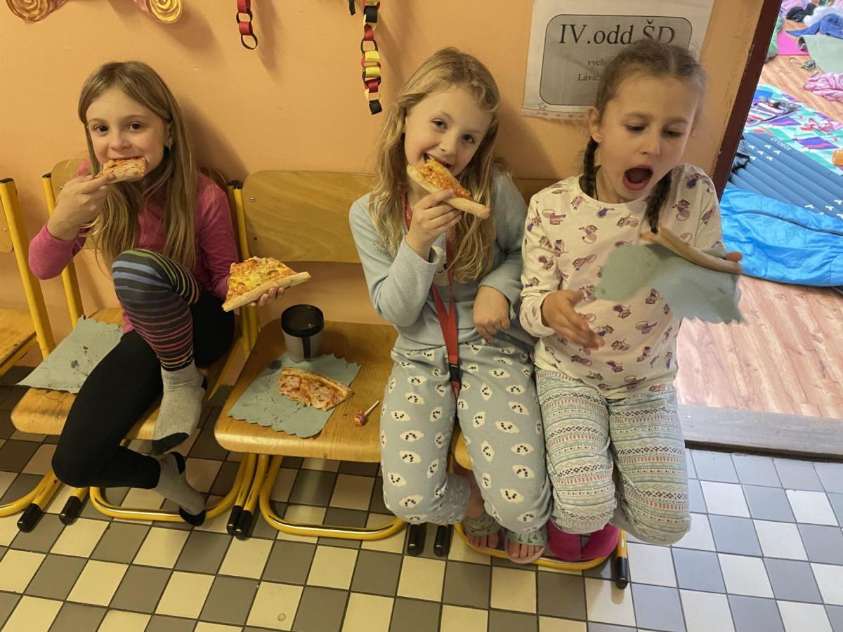 Odpoledne jsme si připravili třídu na spaní, na přední lavice dali naše jídelní all inclusive - mamky jsou opravdu šikovné :) a tvořili dárek pro rodiče. K večeru jsme se šli projít obdivovat vánoční světelnou výzdobu do města i na hrad. Hrad jsme zahnali Boom pizzou dle vlastního výběru. A protože energie bylo pořád dost, šli jsme se vyřádit do gymnastického sálu a někdo na počítače.