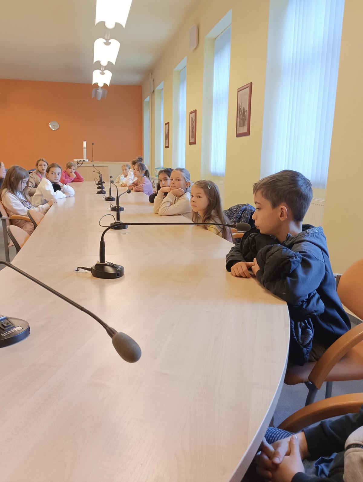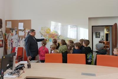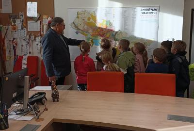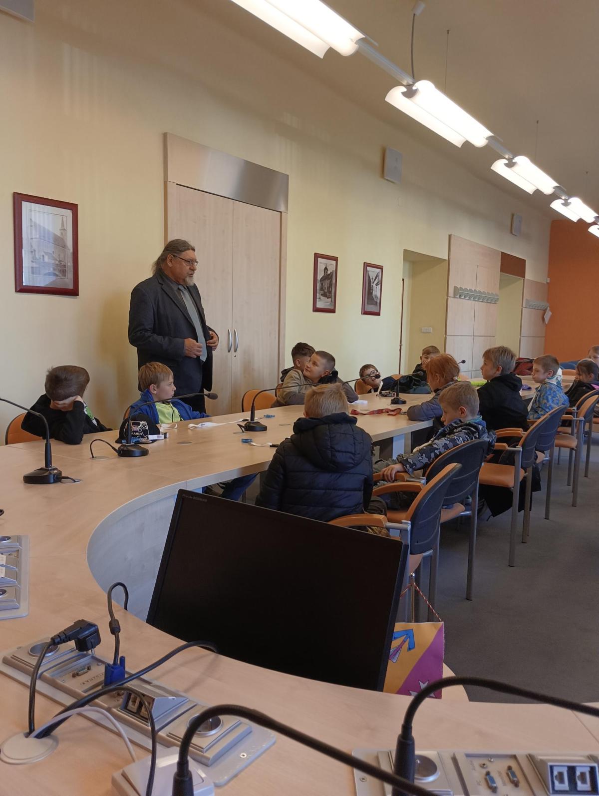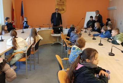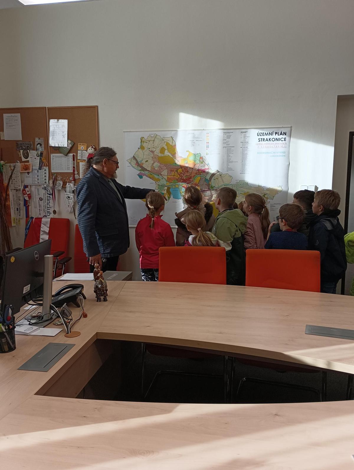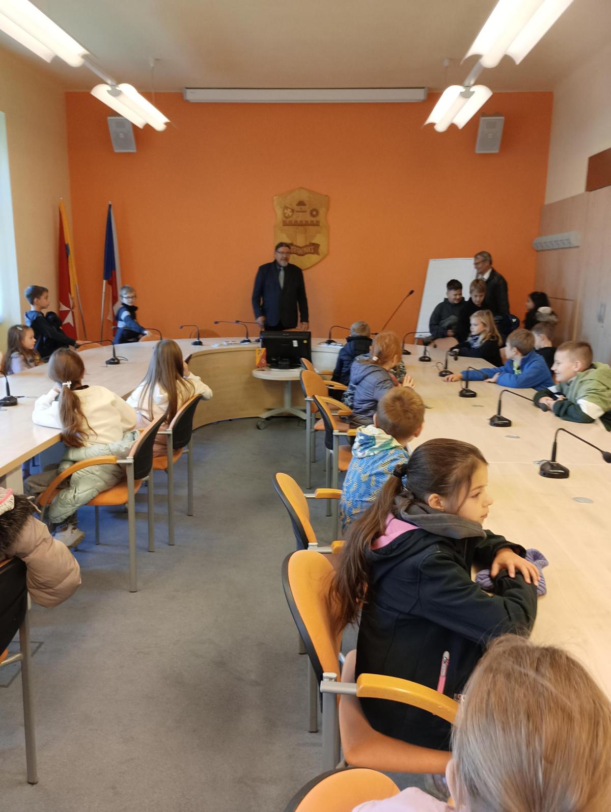 V rámci prvouky jsme šli na besedu s panem starostou na městský úřad. Zjistili jsme, co dělá pan starosta, paní tajemnice a místostarostové. V malé i velké zasedací místnosti jsme si vyzkoušeli, jaké je to sedět u stolu, kde se rozhoduje... Zahráli jsme si kvíz o městě a uspěli jsme na jedničku. Za odměnu jsme si odnesli drobné dárečky. Panu starostovi jsme nakreslili jeho portrét, který se mu moc líbil.