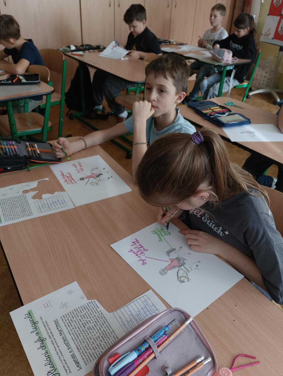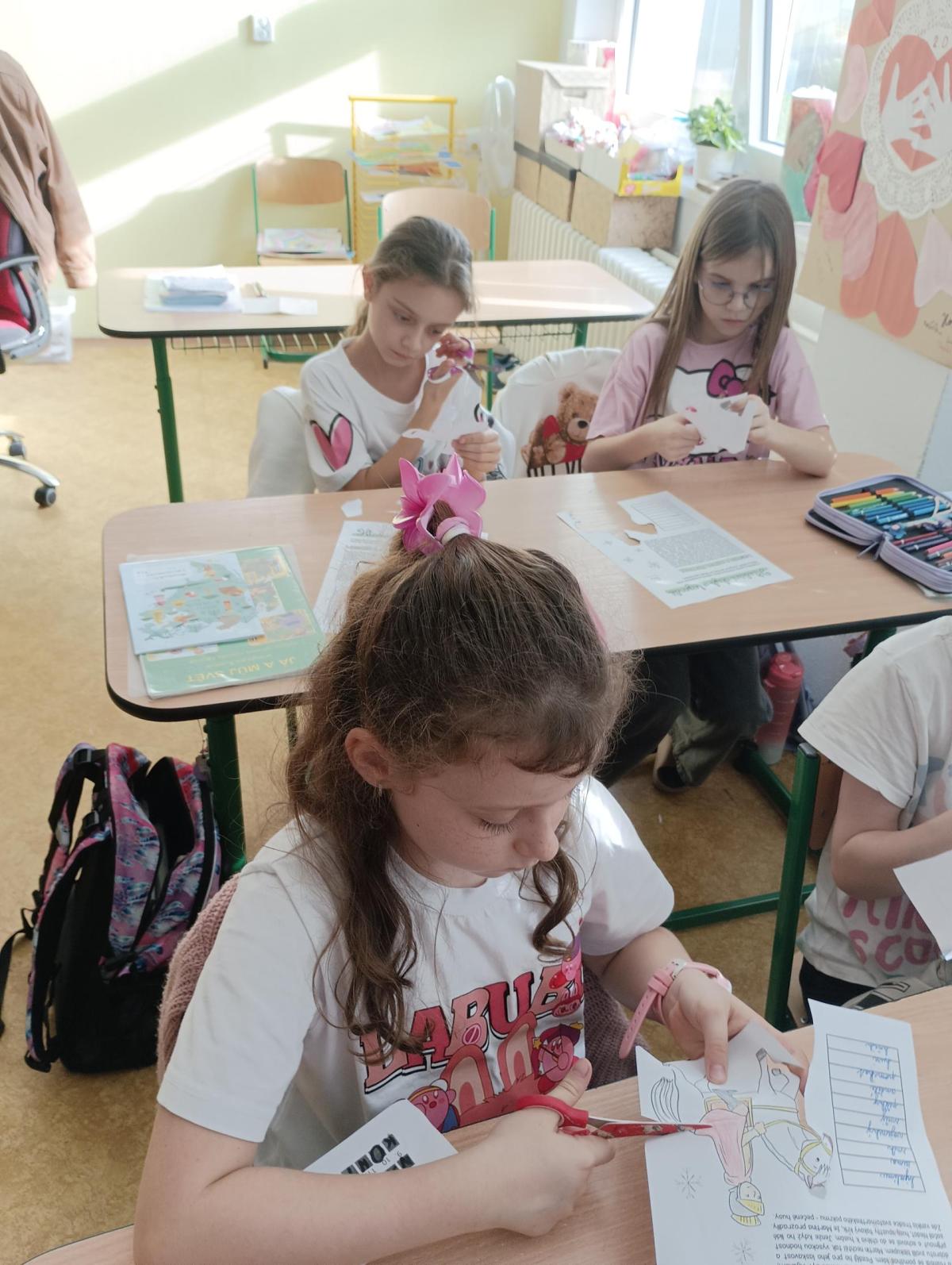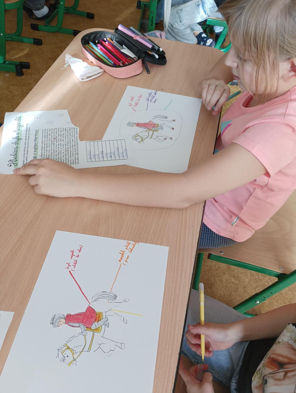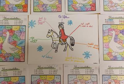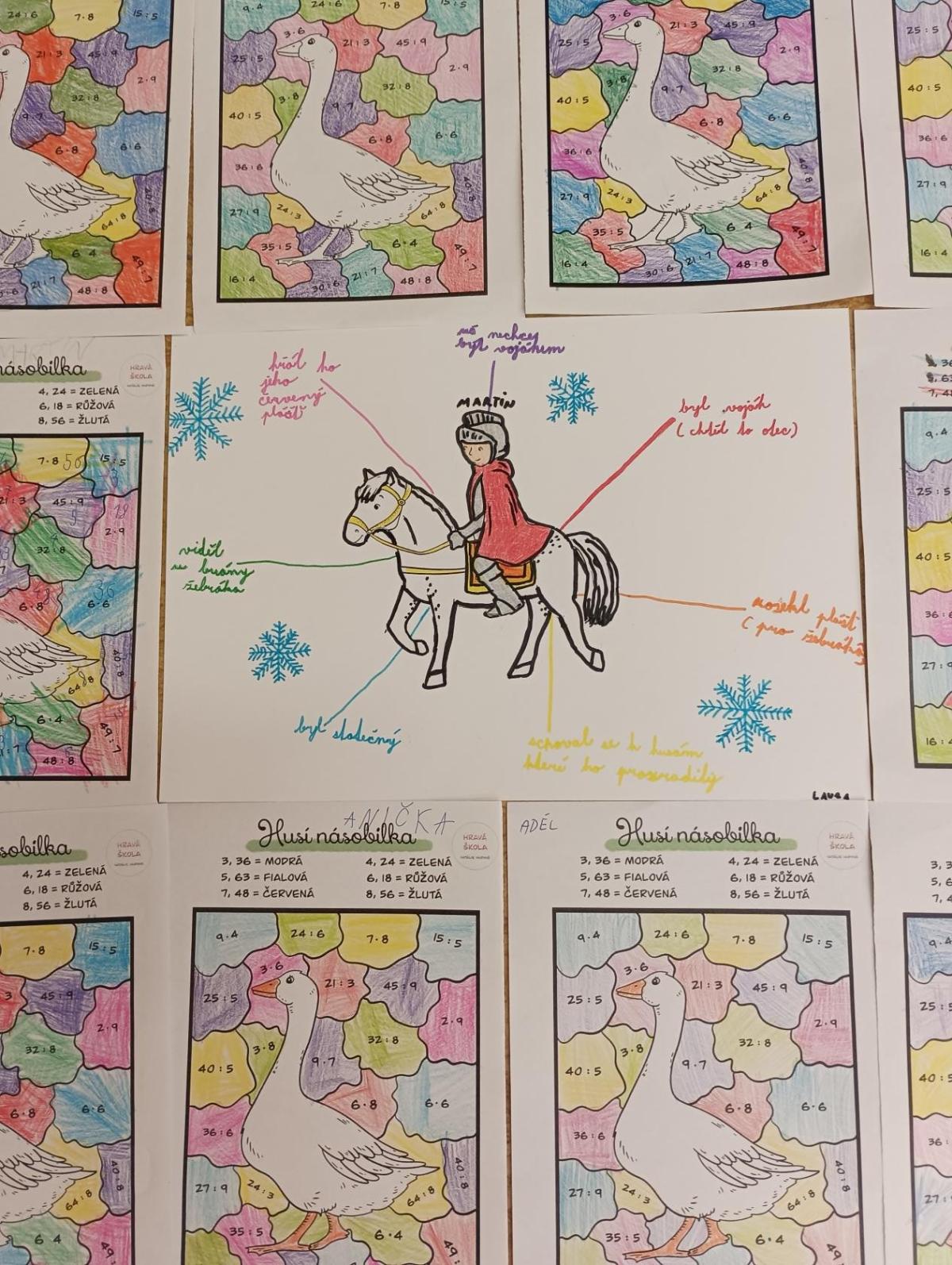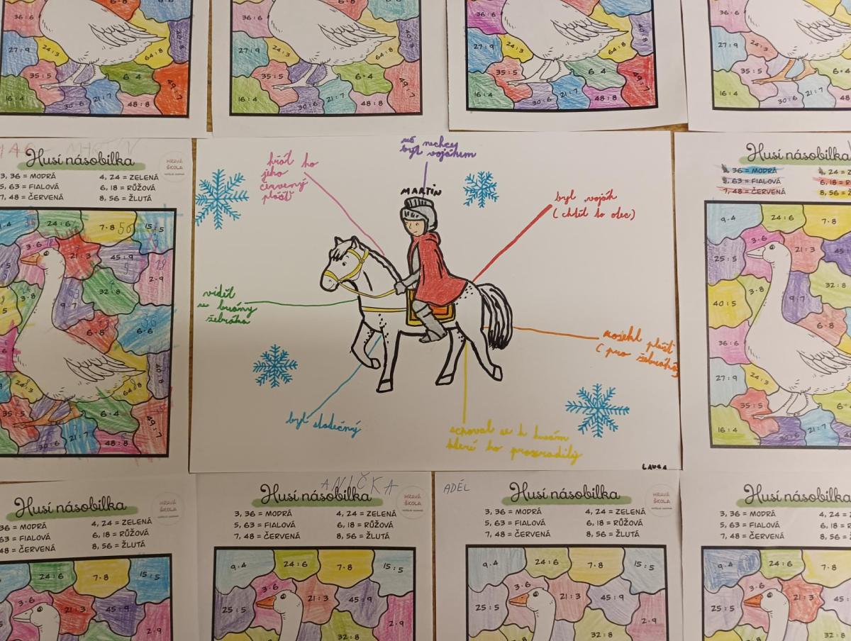 Dnes jsme čekali, zda svatý Martin přijede na bílém koni. Čas čekání jsme si krátili plněním zábavných úkolů k tomuto svátku. Pracovali jsme s textem o legendě sv. Martina, hledali jsme chyby v textu a přepisovali jsme je správně. Vytvořili jsme myšlenkovou mapu, čtyřlístek a také jsme nezapomněli procvičovat násobilku. Dnešní den nás obohatil a inspiroval k dobrým skutkům mezi kamarády.