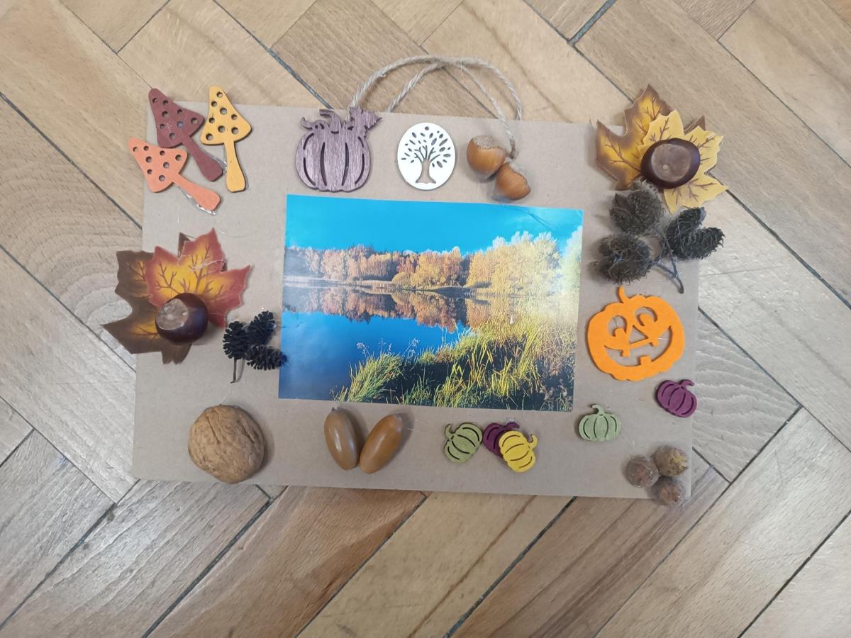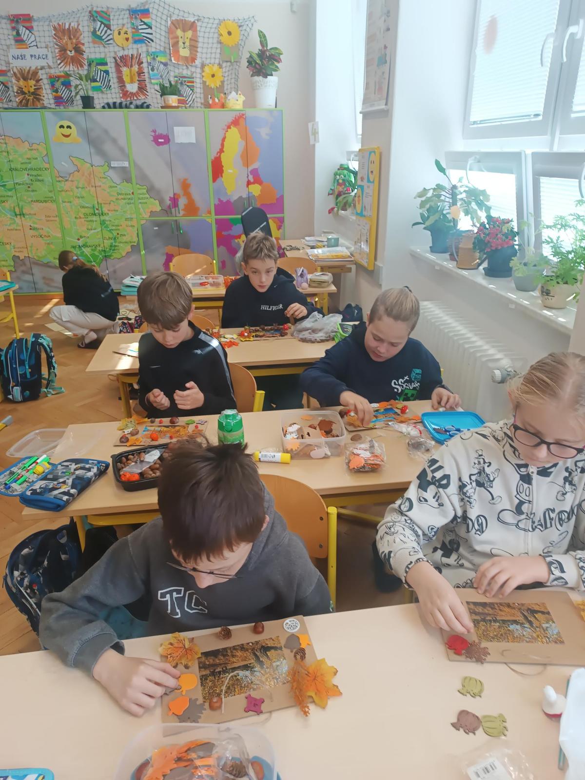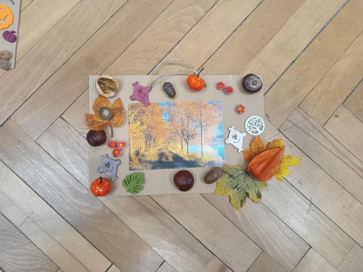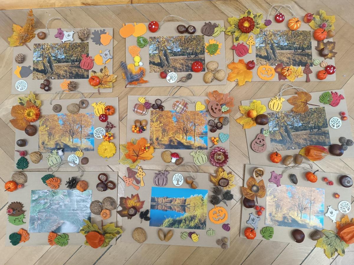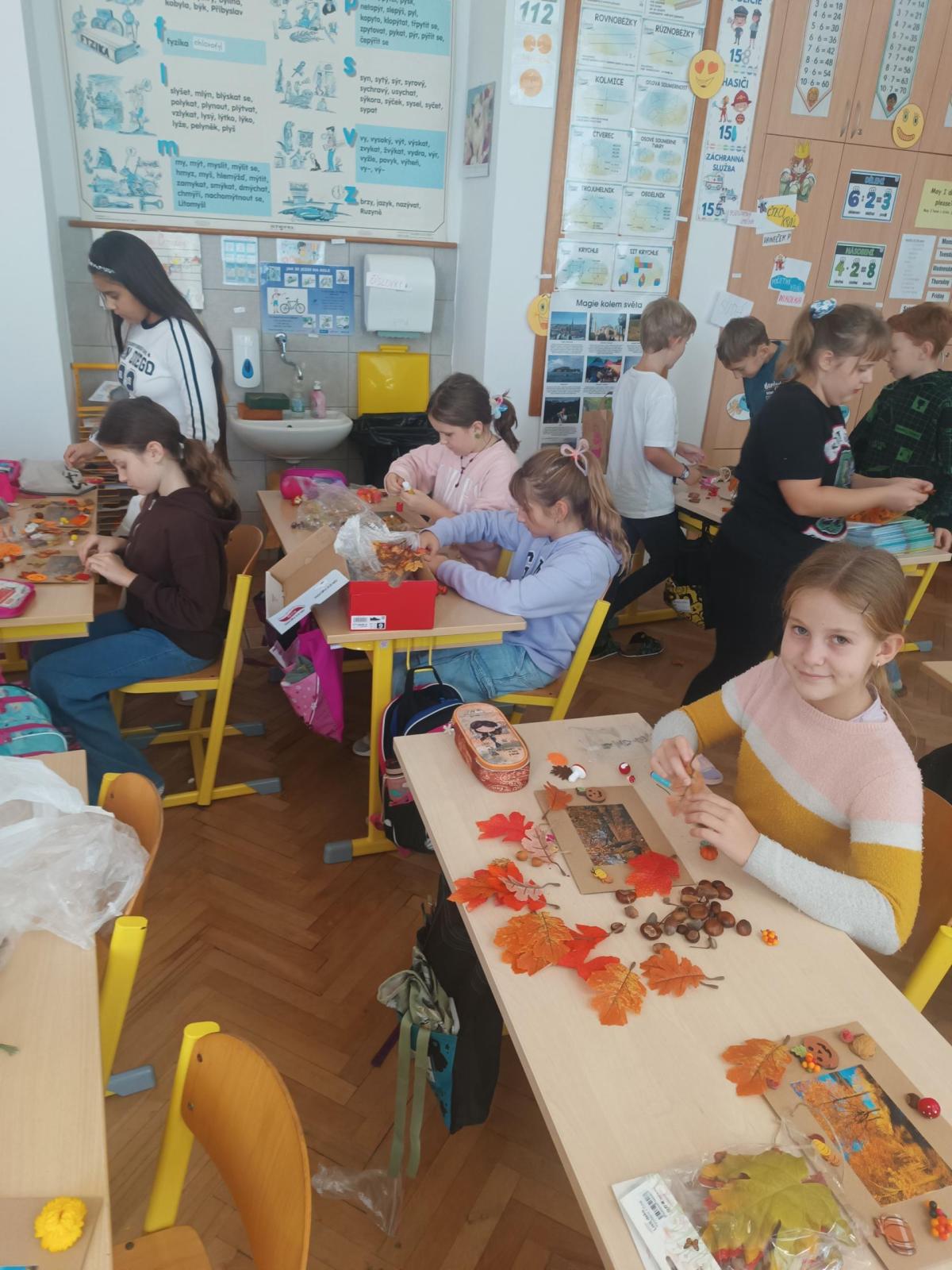 V rámci PČ a VV jsme si vyrobili krásný podzimní obrázek. Potřebovali jsme k tomu kousek kartonu, fotografii s podzimní tematikou a přírodniny na dozdobení (kaštany, žaludy, skořápky ořechů, bukvice. . . .). Využili jsme i dřevěné dýničky, umělé lístečky, malé muchomůrky. Každý obrázek byl originální.