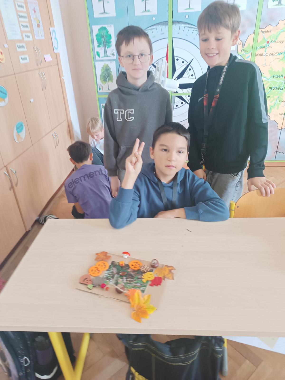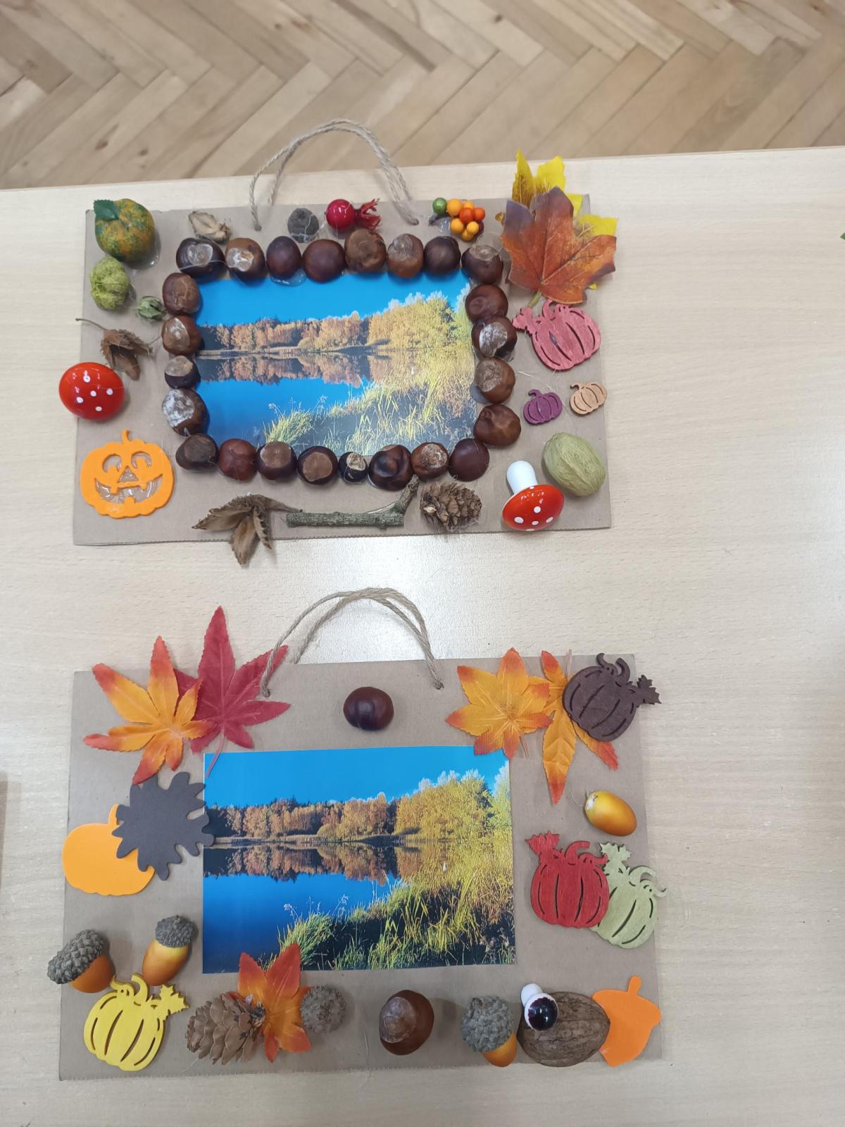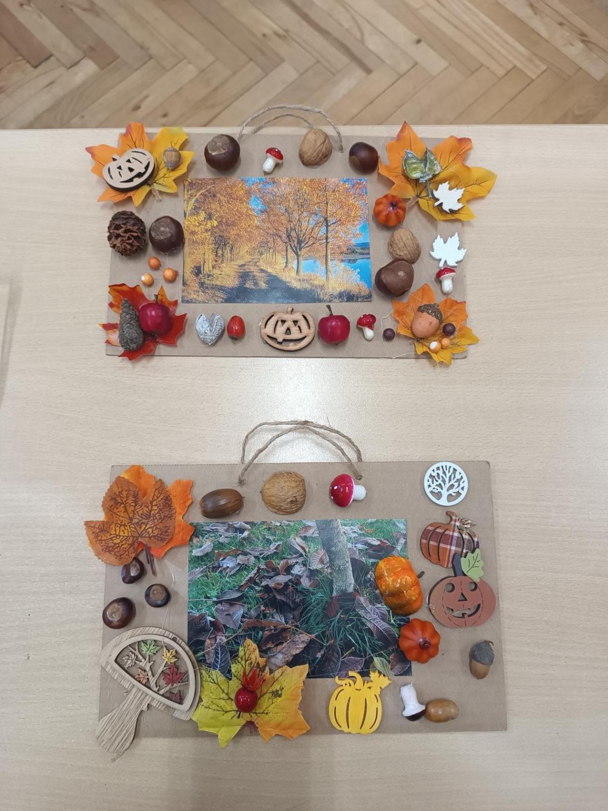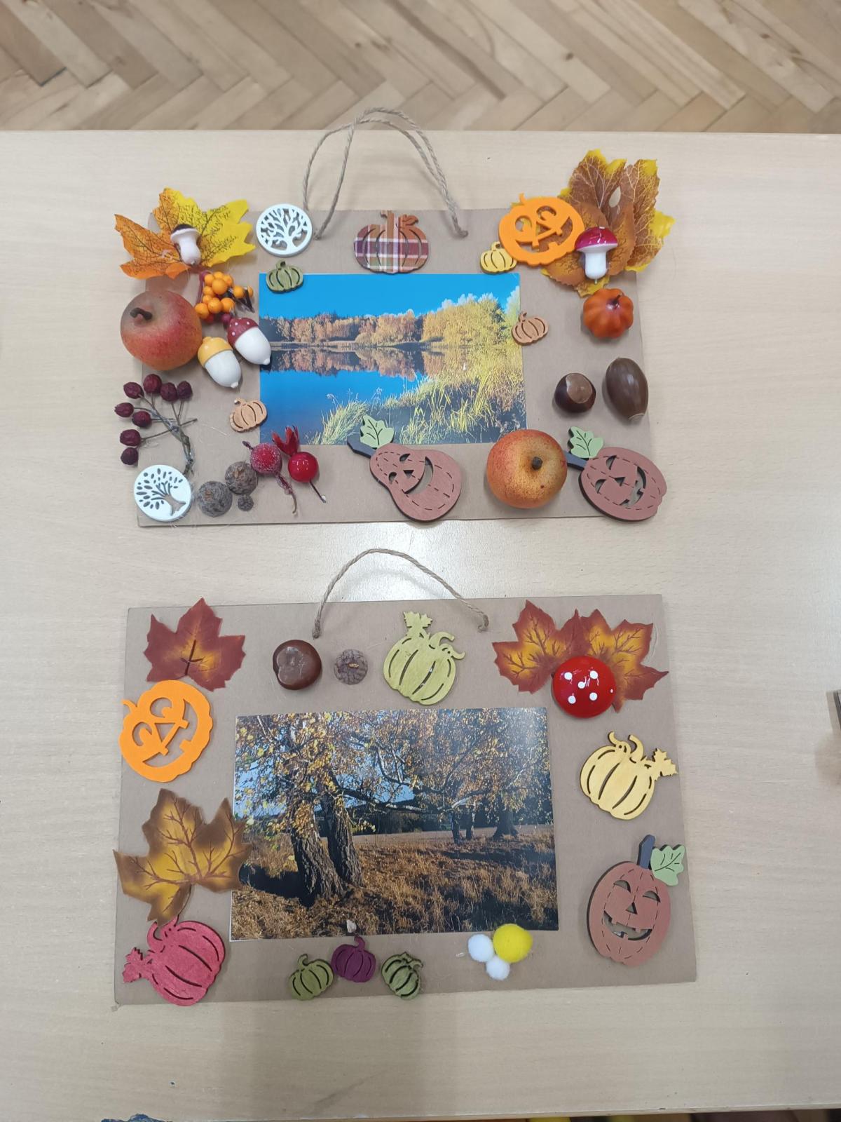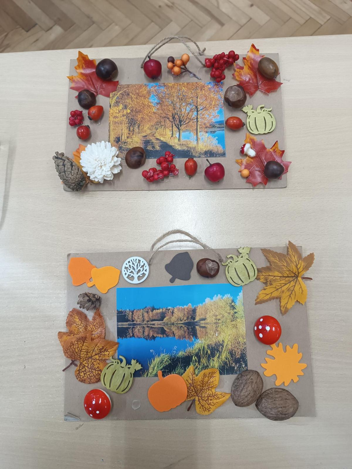V rámci PČ a VV jsme si vyrobili krásný podzimní obrázek. Potřebovali jsme k tomu kousek kartonu, fotografii s podzimní tematikou a přírodniny na dozdobení (kaštany, žaludy, skořápky ořechů, bukvice. . . .). Využili jsme i dřevěné dýničky, umělé lístečky, malé muchomůrky. Každý obrázek byl originální.
