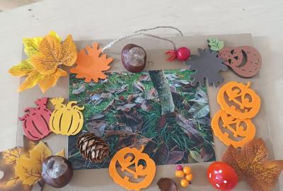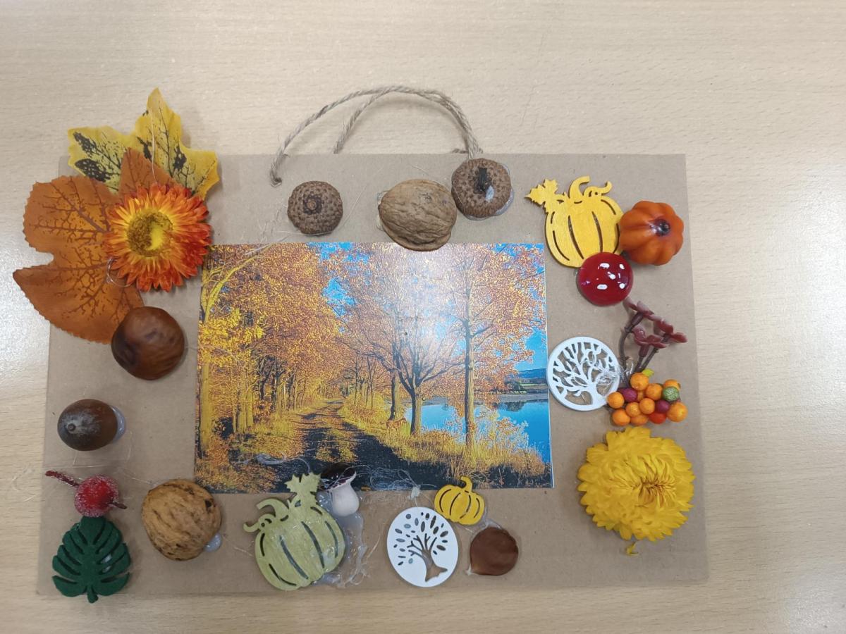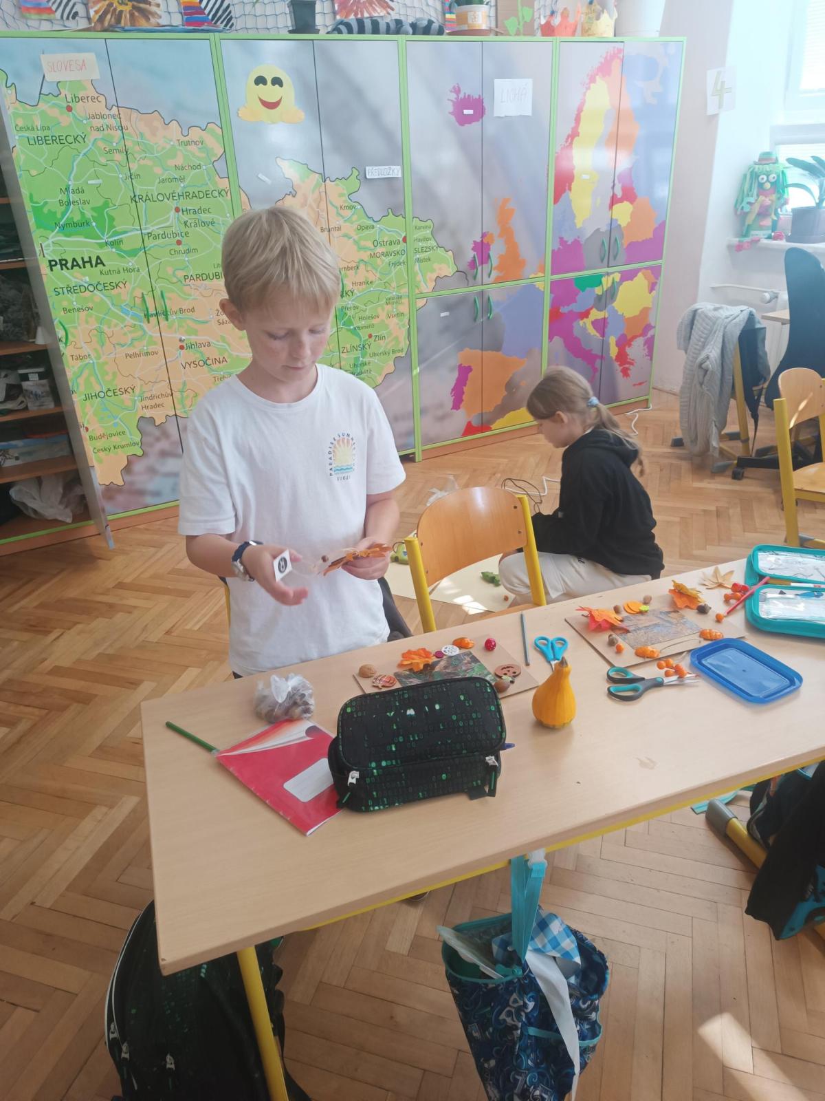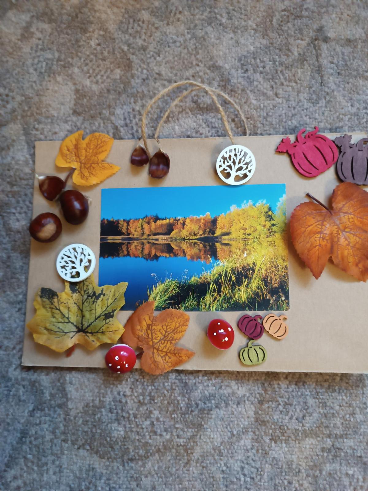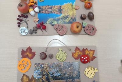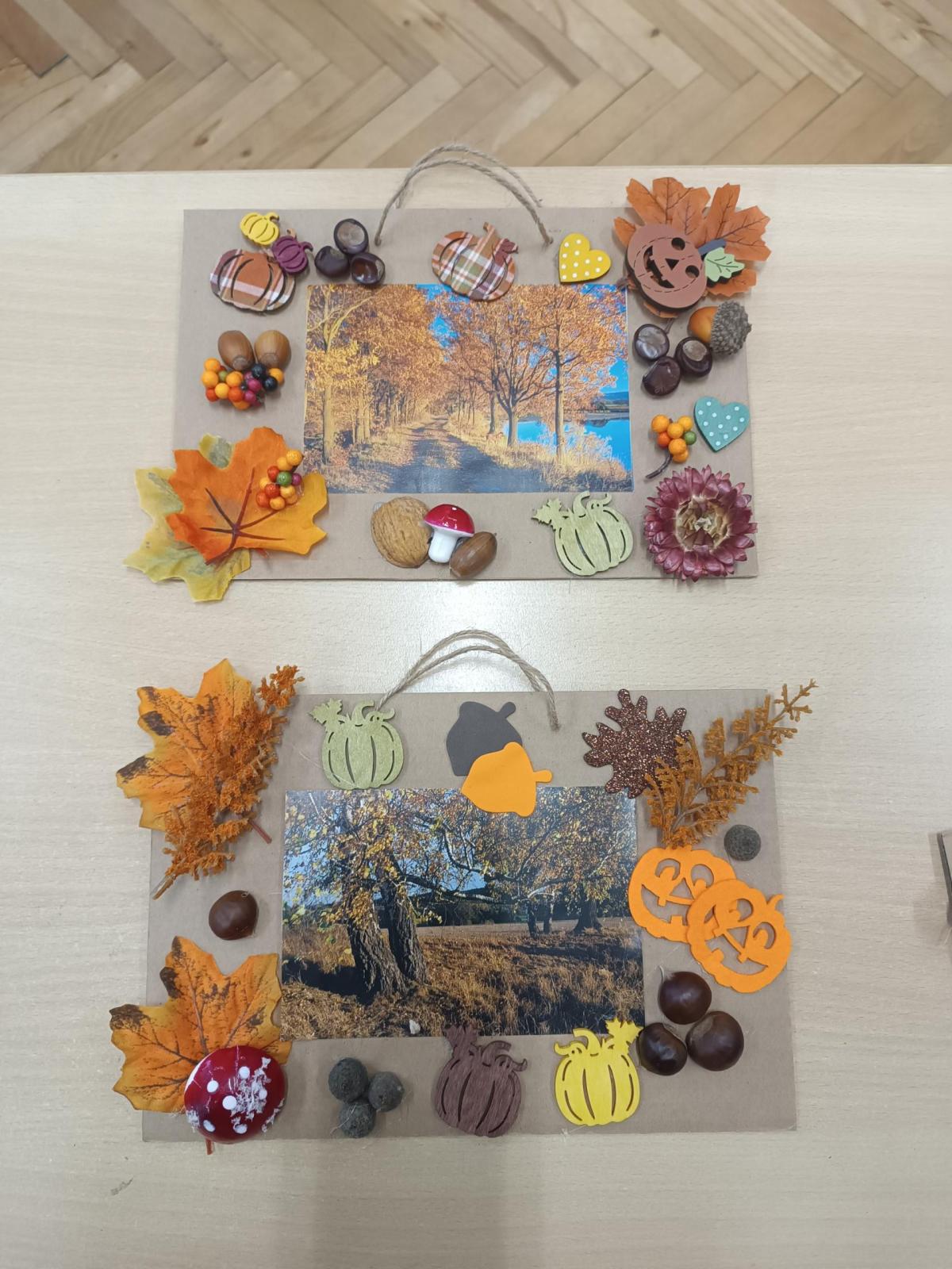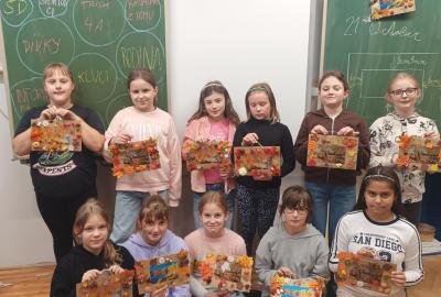 V rámci PČ a VV jsme si vyrobili krásný podzimní obrázek. Potřebovali jsme k tomu kousek kartonu, fotografii s podzimní tematikou a přírodniny na dozdobení (kaštany, žaludy, skořápky ořechů, bukvice. . . .). Využili jsme i dřevěné dýničky, umělé lístečky, malé muchomůrky. Každý obrázek byl originální.