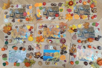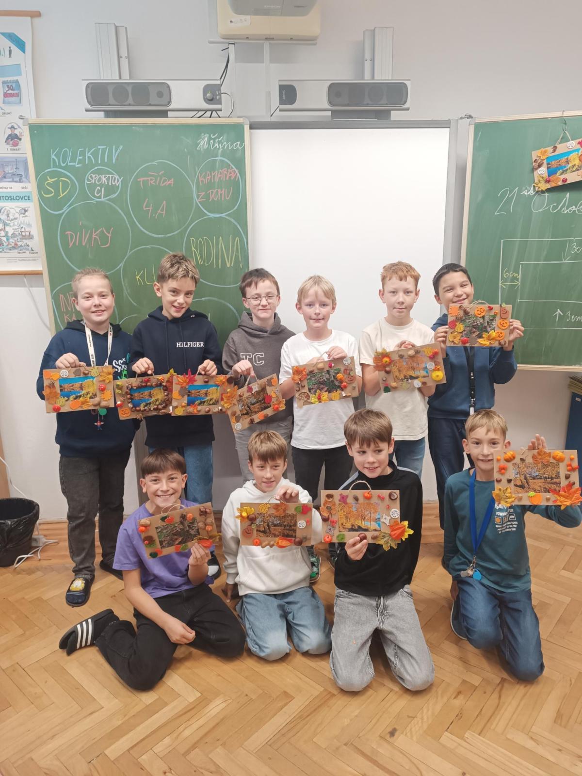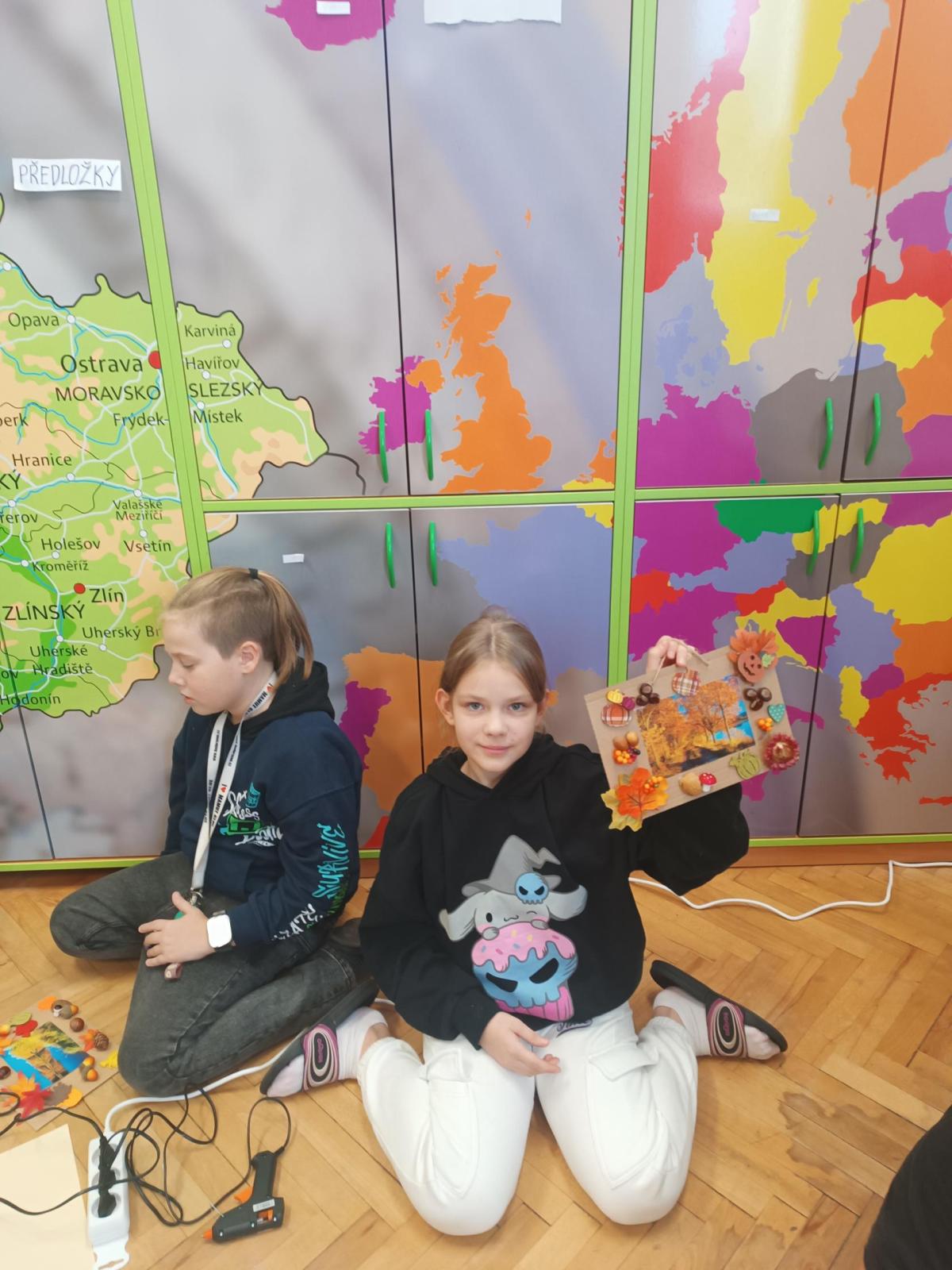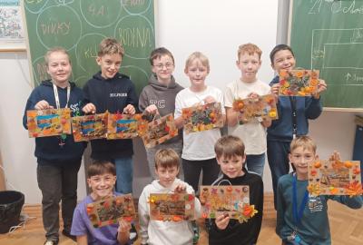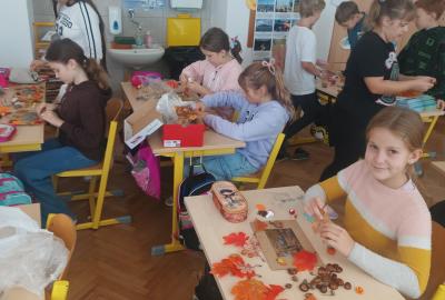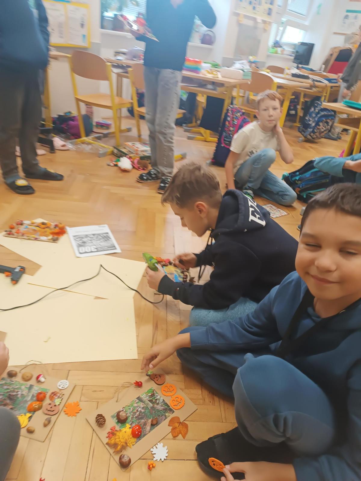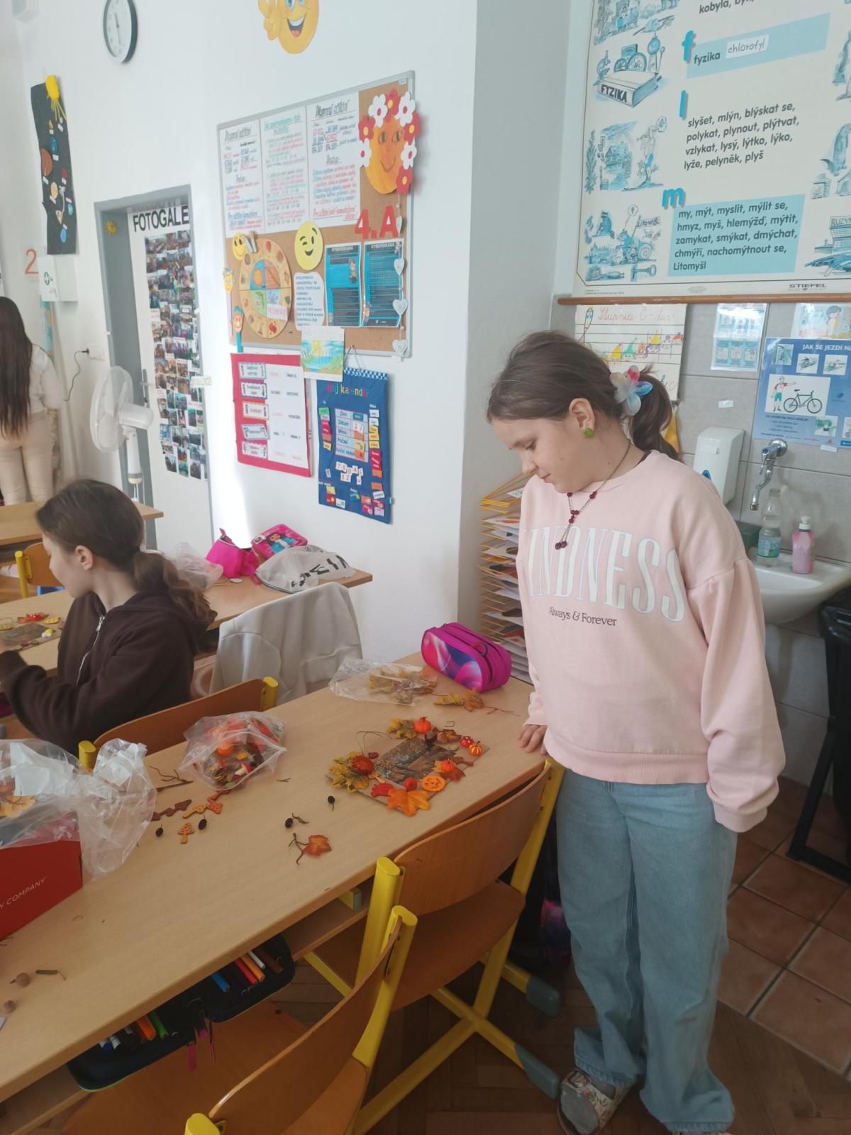 V rámci PČ a VV jsme si vyrobili krásný podzimní obrázek. Potřebovali jsme k tomu kousek kartonu, fotografii s podzimní tematikou a přírodniny na dozdobení (kaštany, žaludy, skořápky ořechů, bukvice. . . .). Využili jsme i dřevěné dýničky, umělé lístečky, malé muchomůrky. Každý obrázek byl originální.