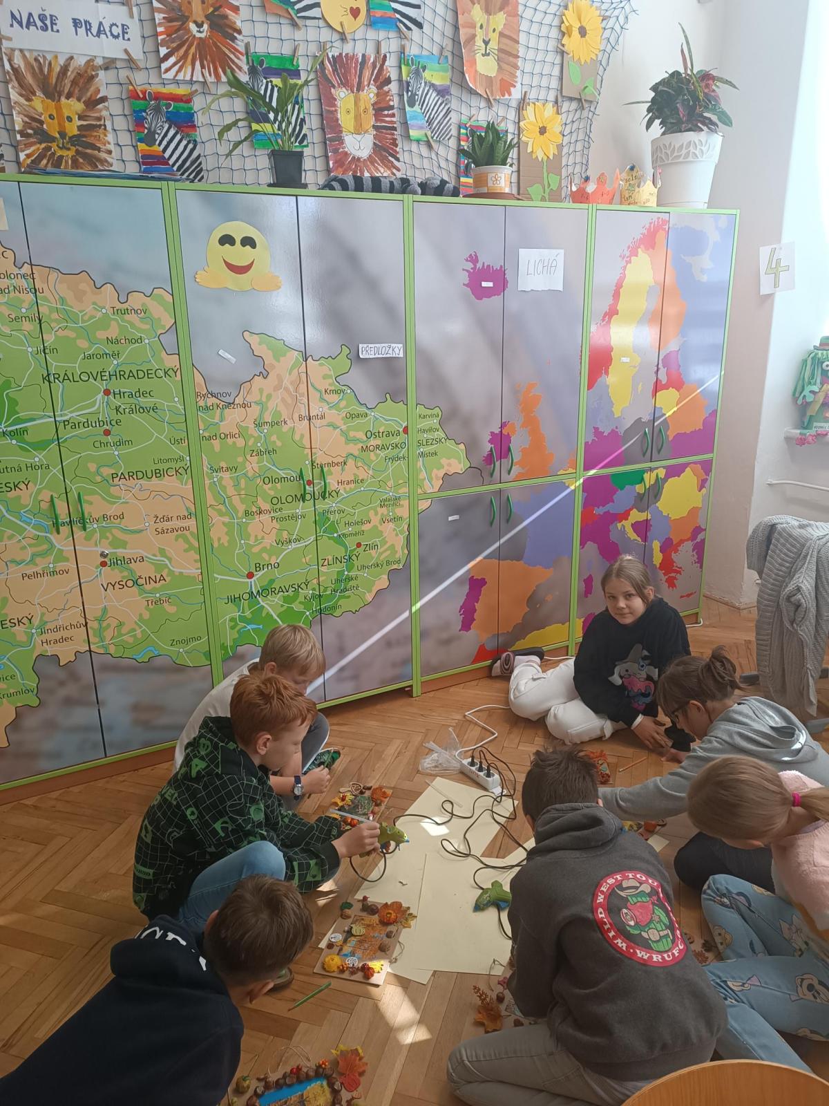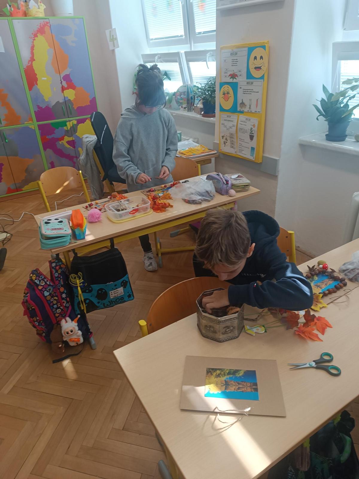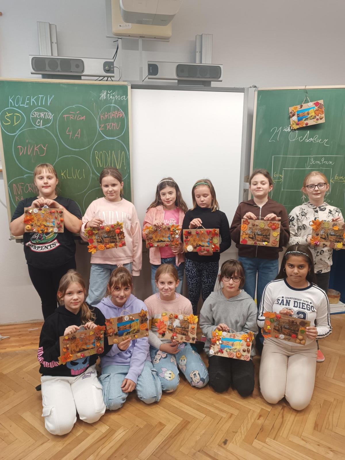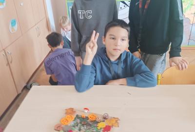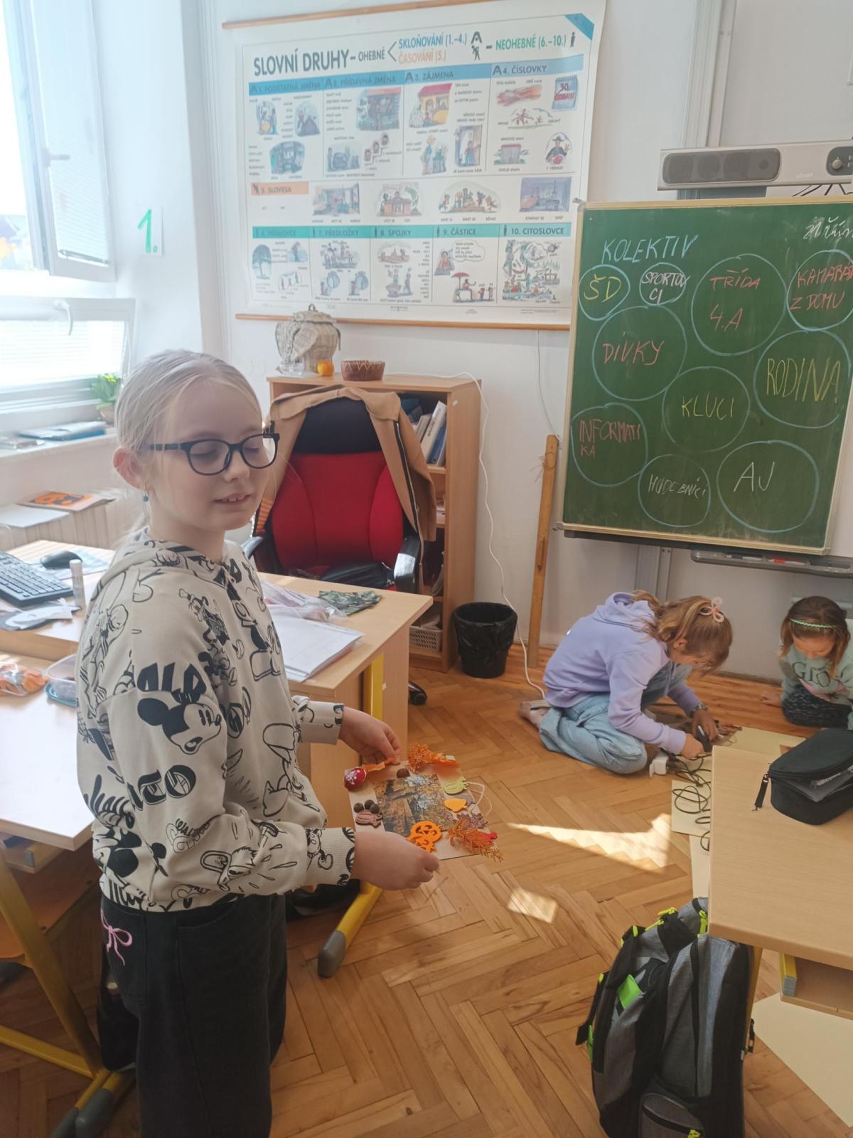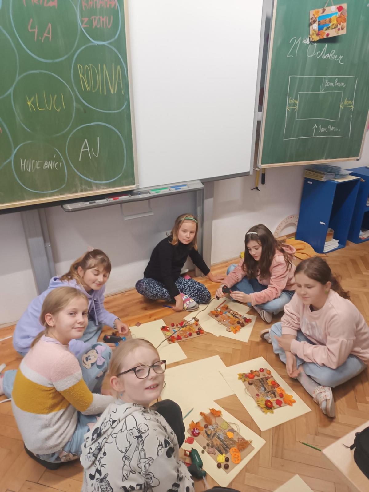 V rámci PČ a VV jsme si vyrobili krásný podzimní obrázek. Potřebovali jsme k tomu kousek kartonu, fotografii s podzimní tematikou a přírodniny na dozdobení (kaštany, žaludy, skořápky ořechů, bukvice. . . .). Využili jsme i dřevěné dýničky, umělé lístečky, malé muchomůrky. Každý obrázek byl originální.