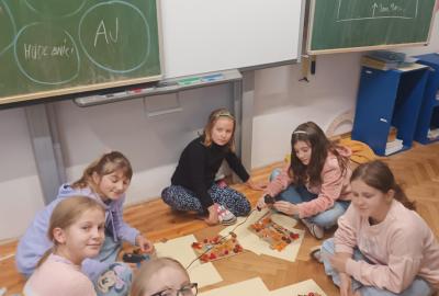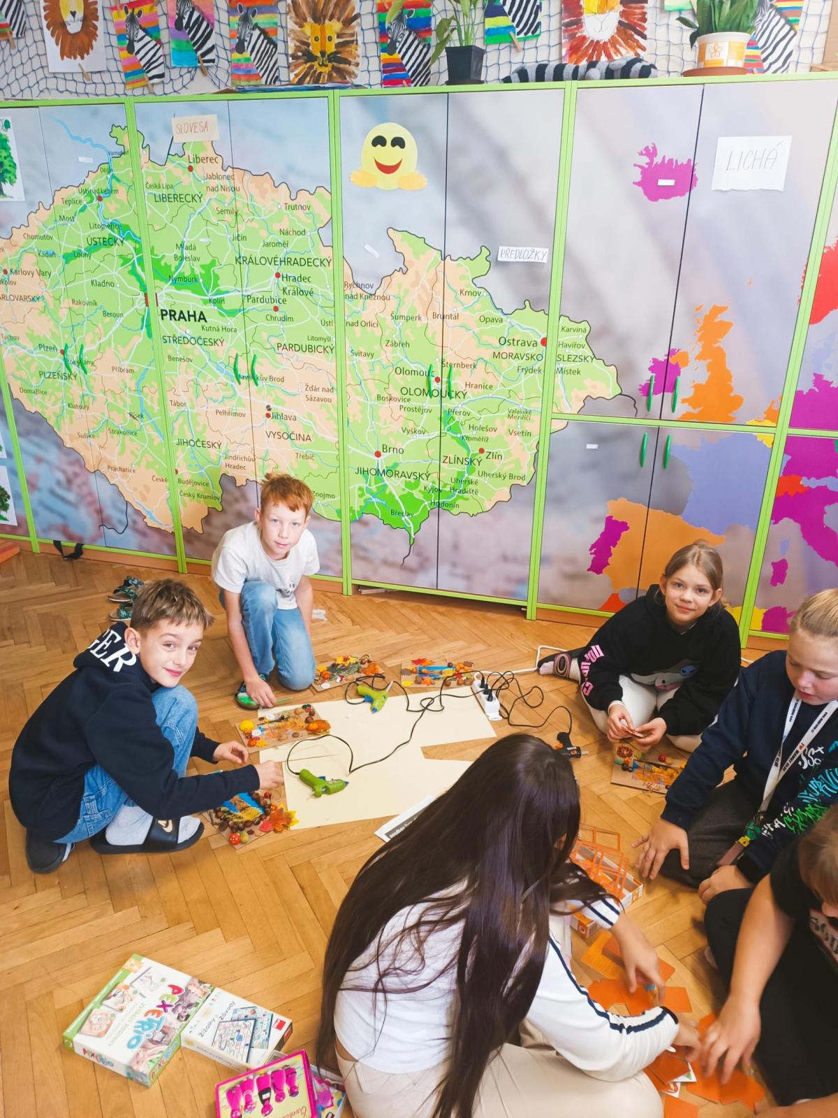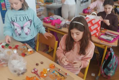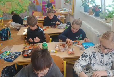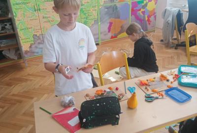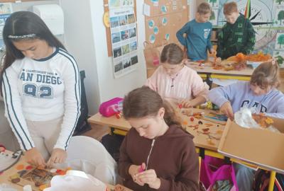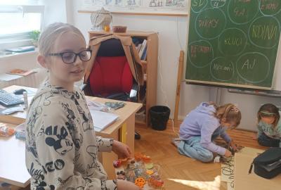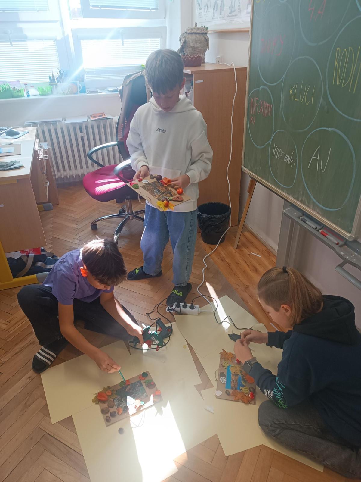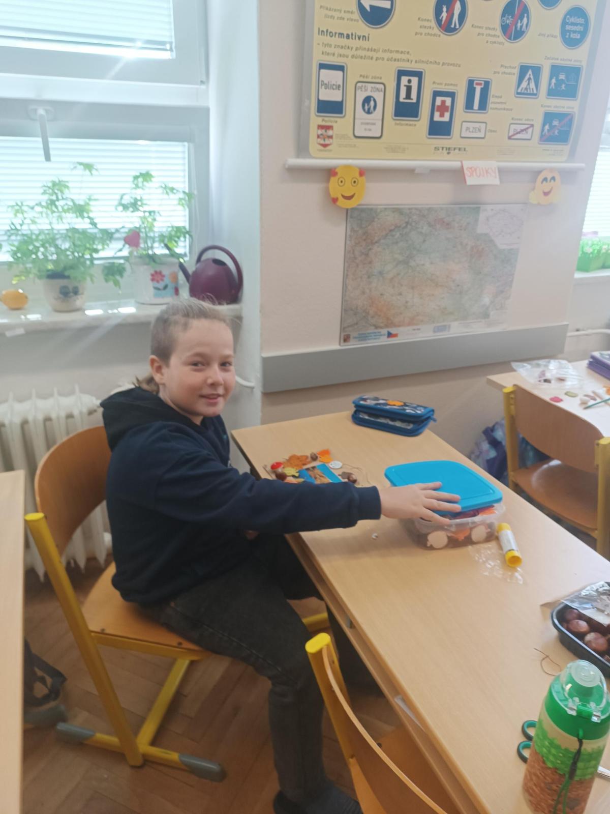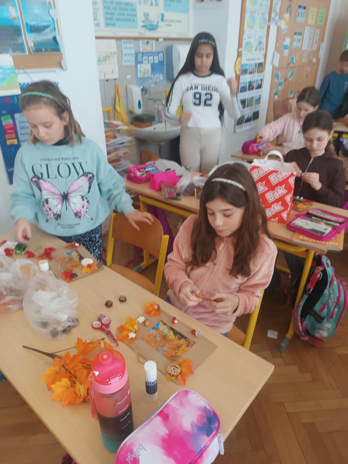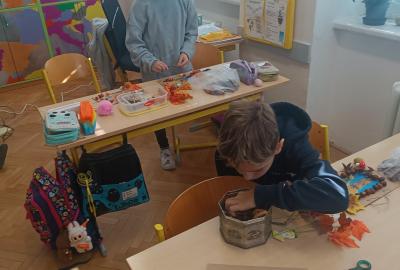 V rámci PČ a VV jsme si vyrobili krásný podzimní obrázek. Potřebovali jsme k tomu kousek kartonu, fotografii s podzimní tematikou a přírodniny na dozdobení (kaštany, žaludy, skořápky ořechů, bukvice. . . .). Využili jsme i dřevěné dýničky, umělé lístečky, malé muchomůrky. Každý obrázek byl originální.