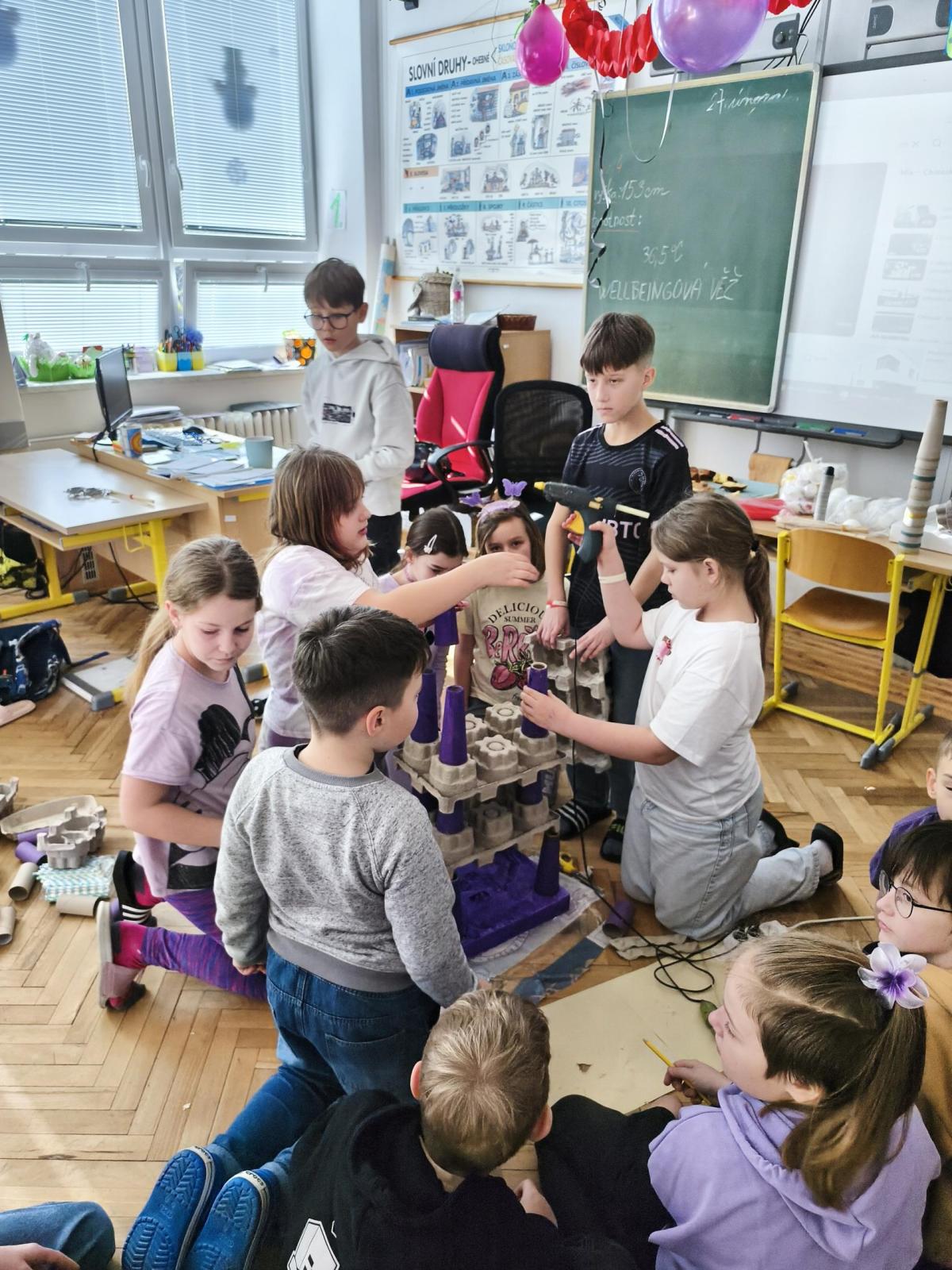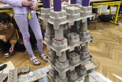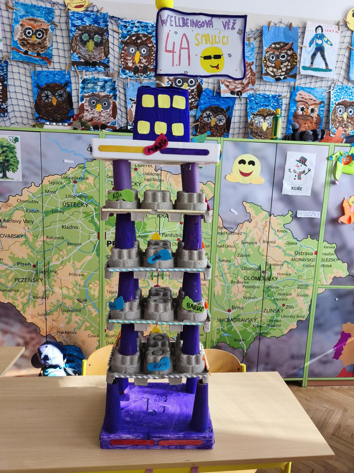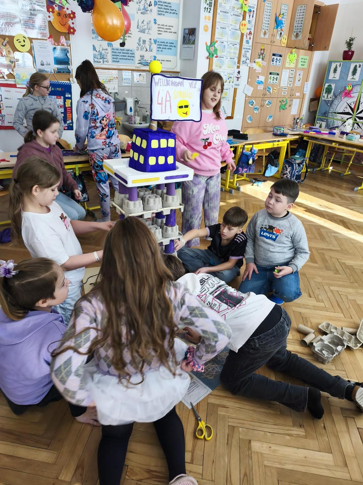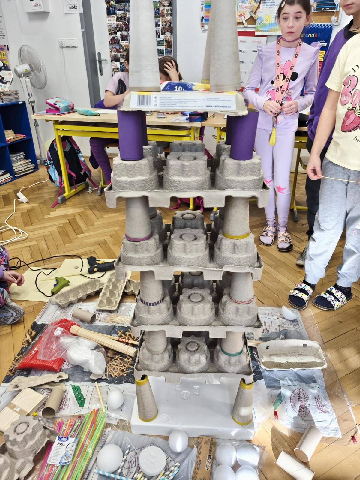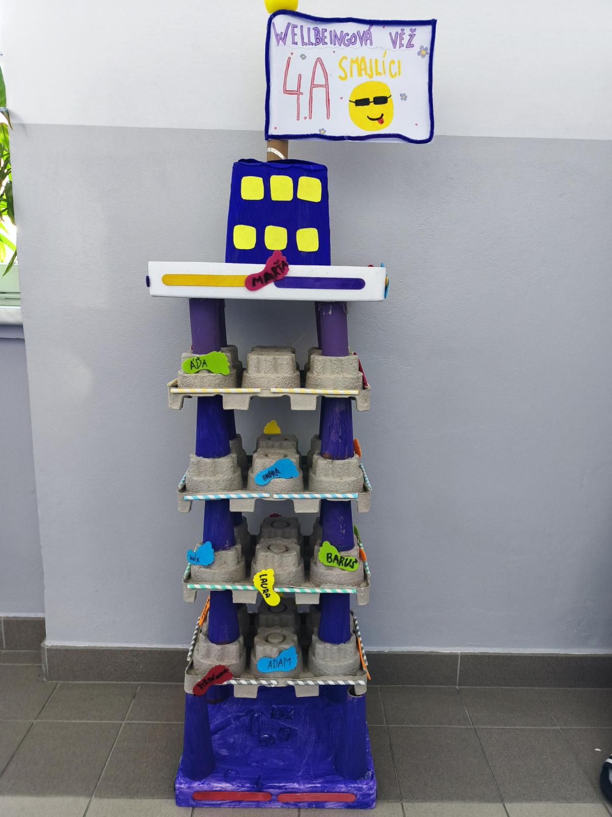 V rámci "Týdne pro wellbeing" jsme měli za úkol sestavit co nejvyšší věž z jakéhokoliv materiálu. Tato aktivita vyžadovala sounáležitost, spolupráci a domluvu. Ze začátku jsme se nemohli dohodnout, z čeho věž uděláme - měli jsme k dispozici hodně materiálů. . . Ale nakonec jsme se domluvili a stavění bylo velmi příjemné, zajímavé a posílilo to naše vztahy ve třídě. Všichni jsme měli z výsledku naší práce radost.