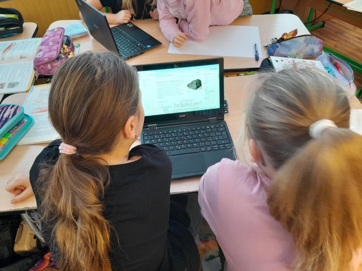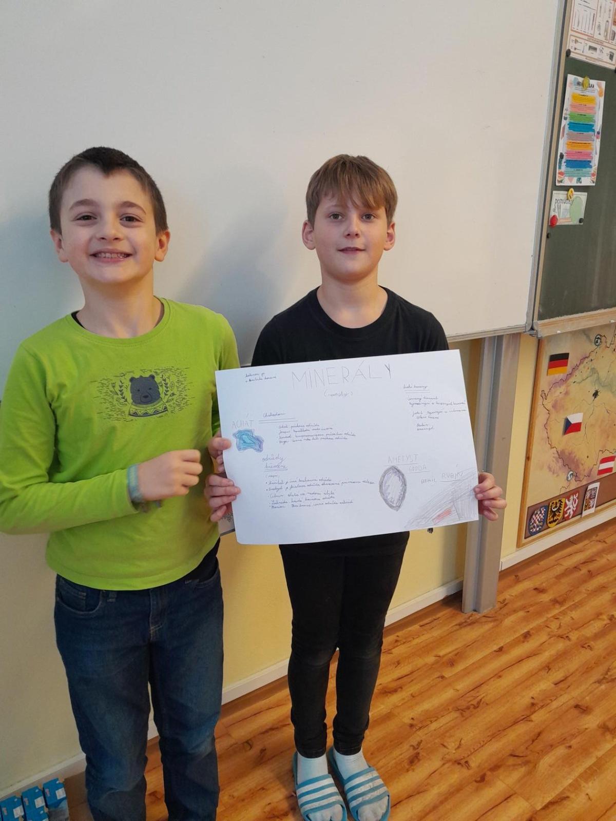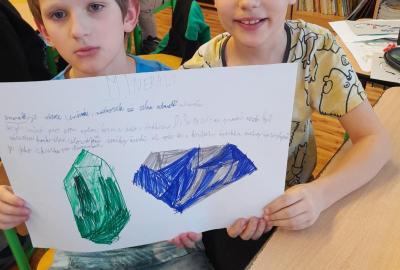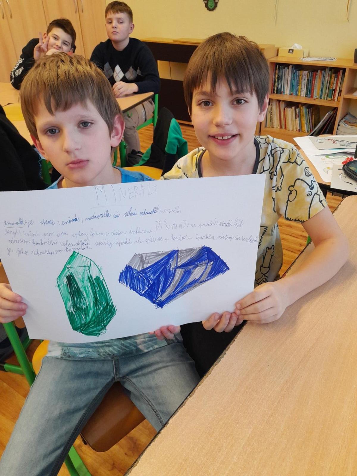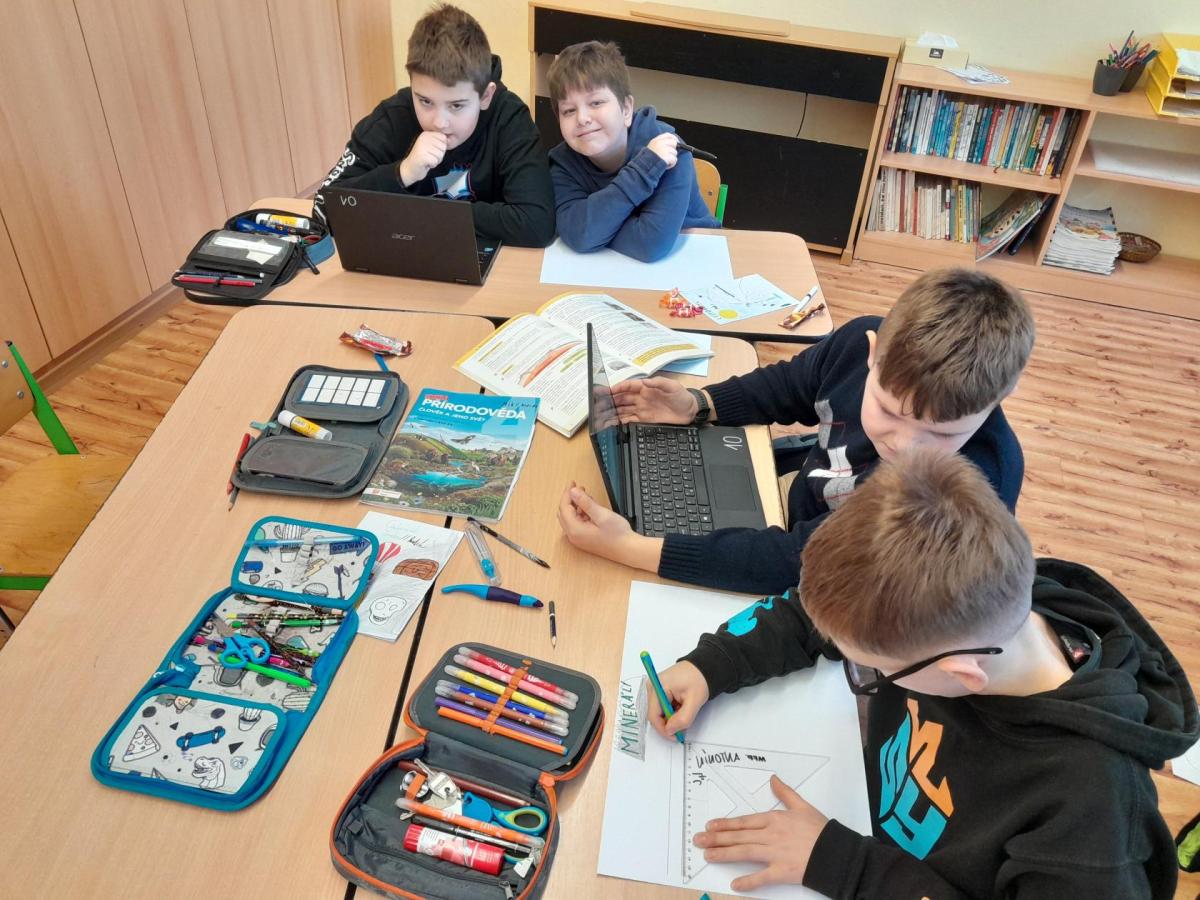Tentokrát jsme k učení využili i techniku a děti ve dvojicích tvořily projekt na téma minerály a horniny. Různé informace a obrázky si vyhledávaly na počítači a vše měly za úkol zpracovat na papír. Svoji práci nakonec prezentovaly ostatním spolužákům.