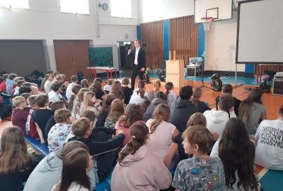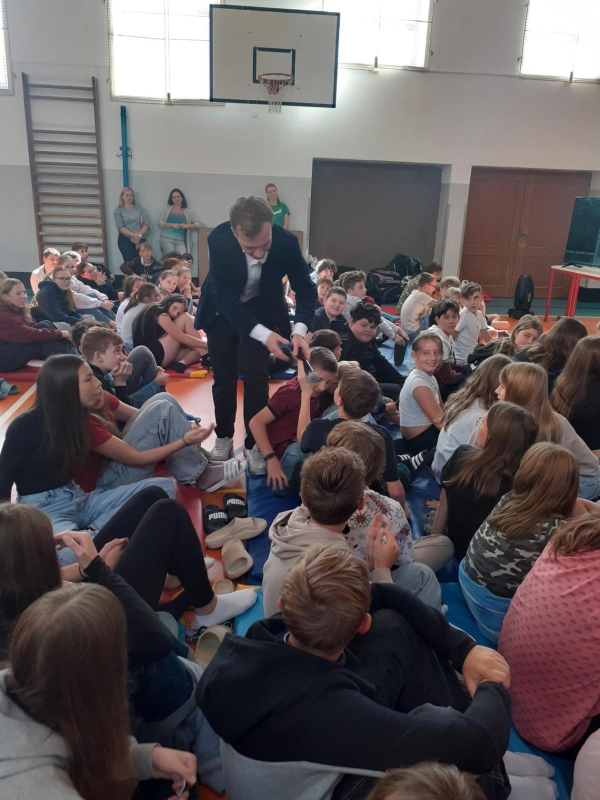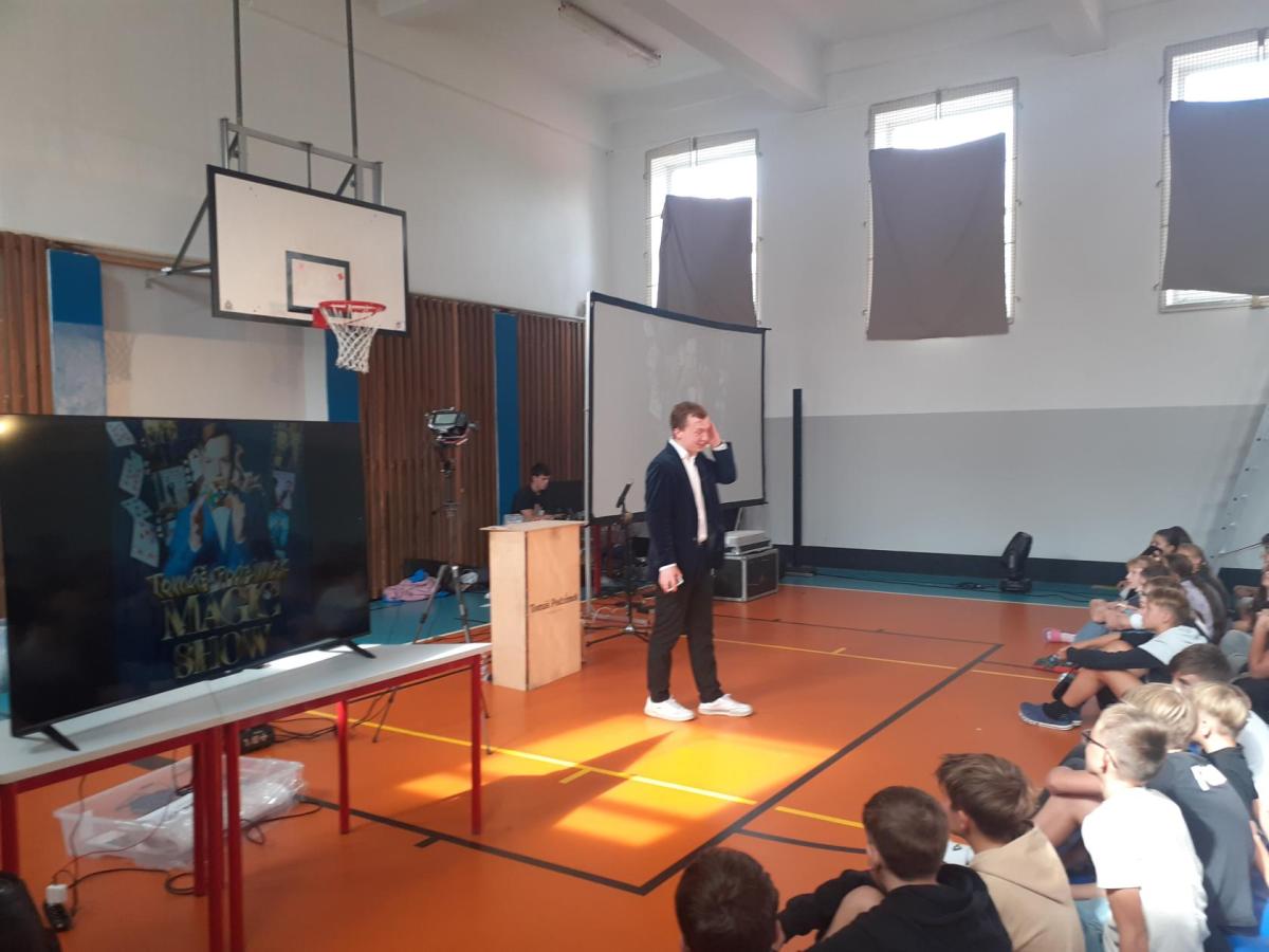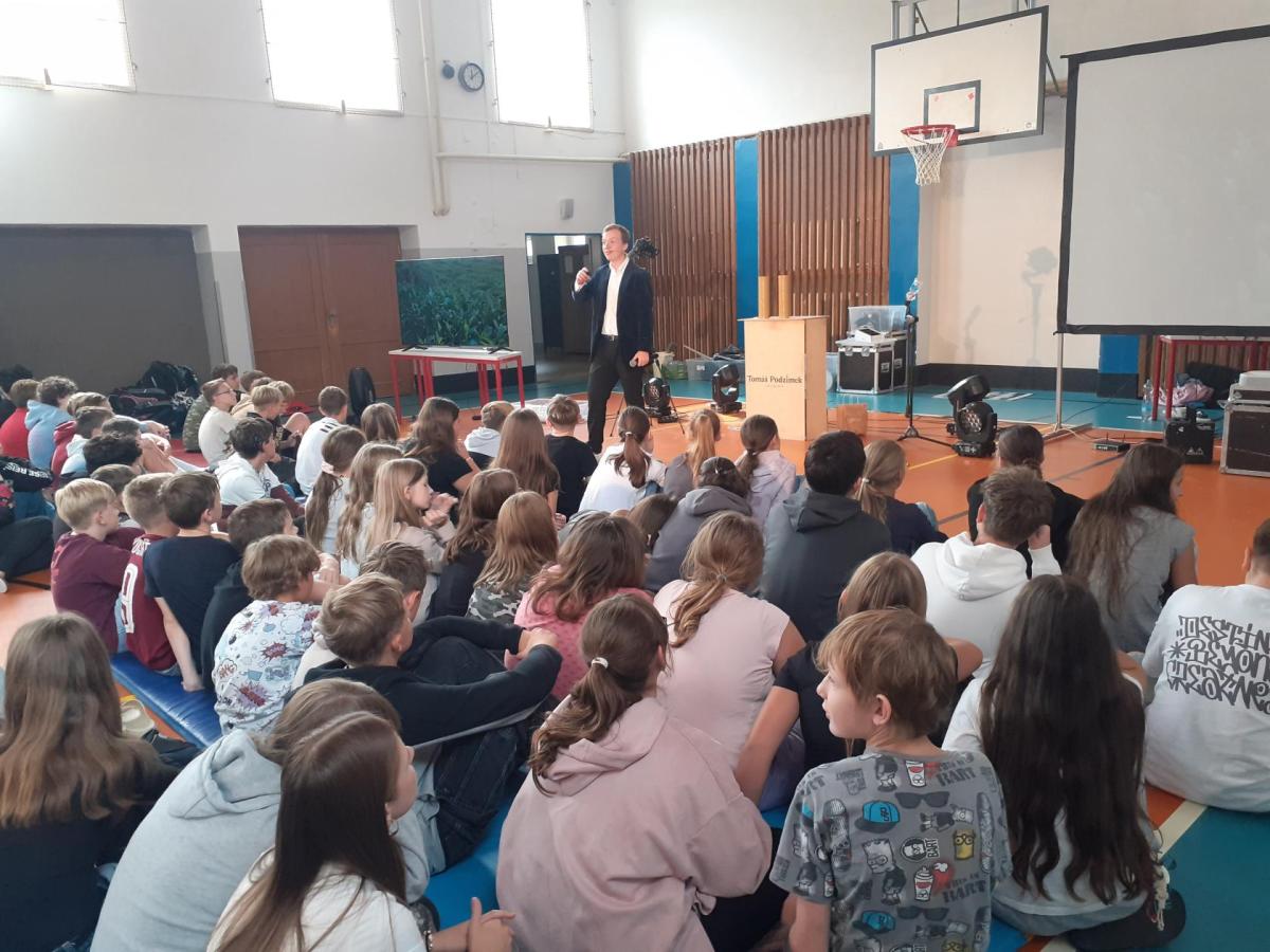 ...a on opravdu přišel, Tomáš Podzimek - kouzelník dorazil do naší školy a my jsme tak mohli na vlastní oči vidět celou řadu kouzelnických triků, povídání bylo proloženo poutavým videem z cestování a my jsme se dozvěděli mnoho zajímavostí z různých koutů světa.