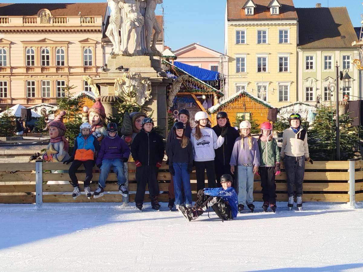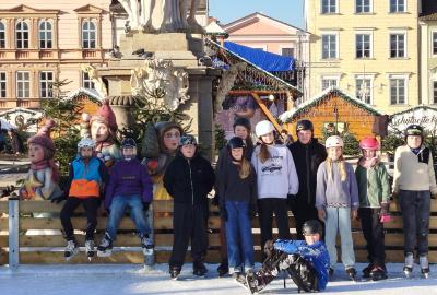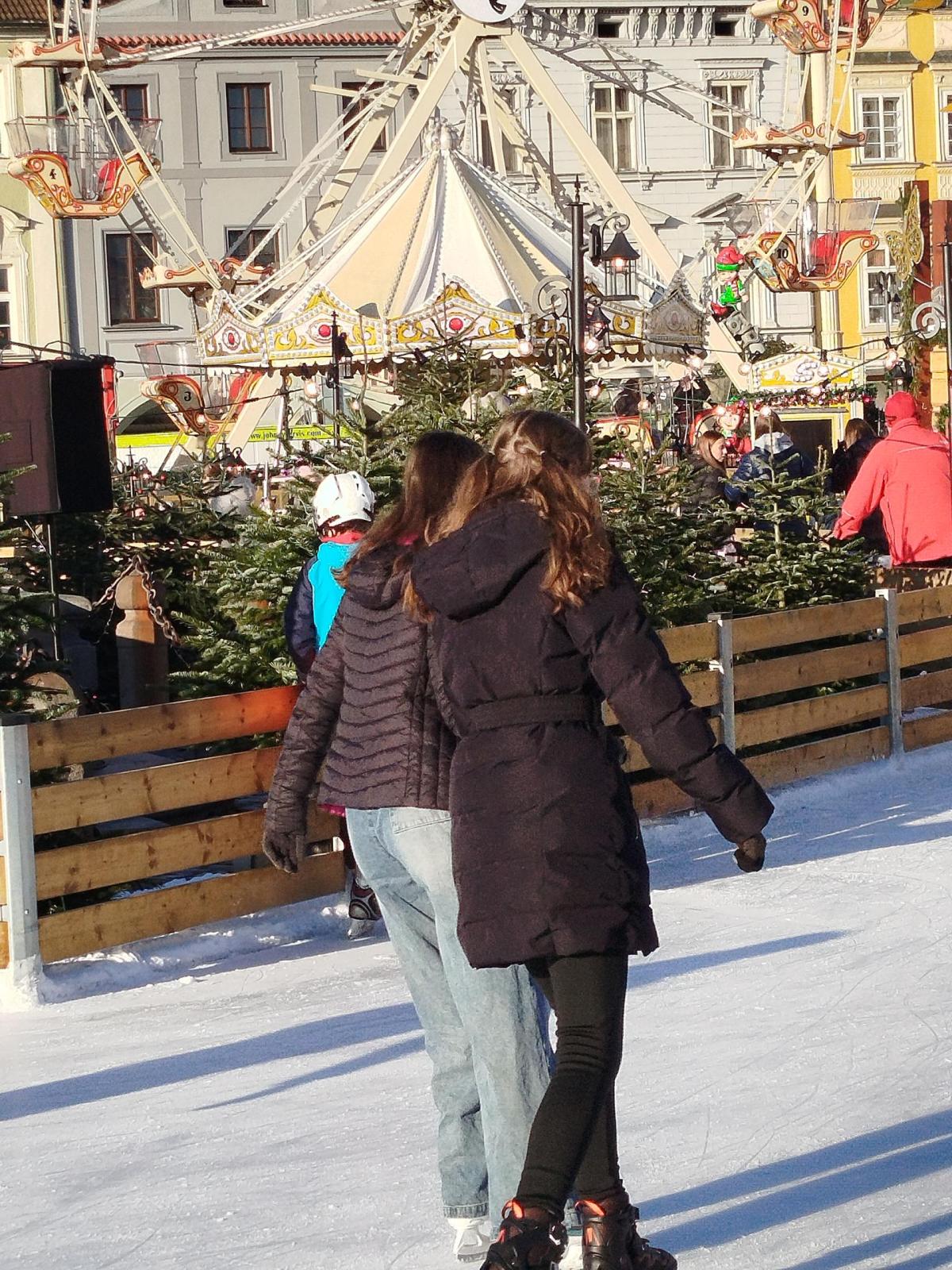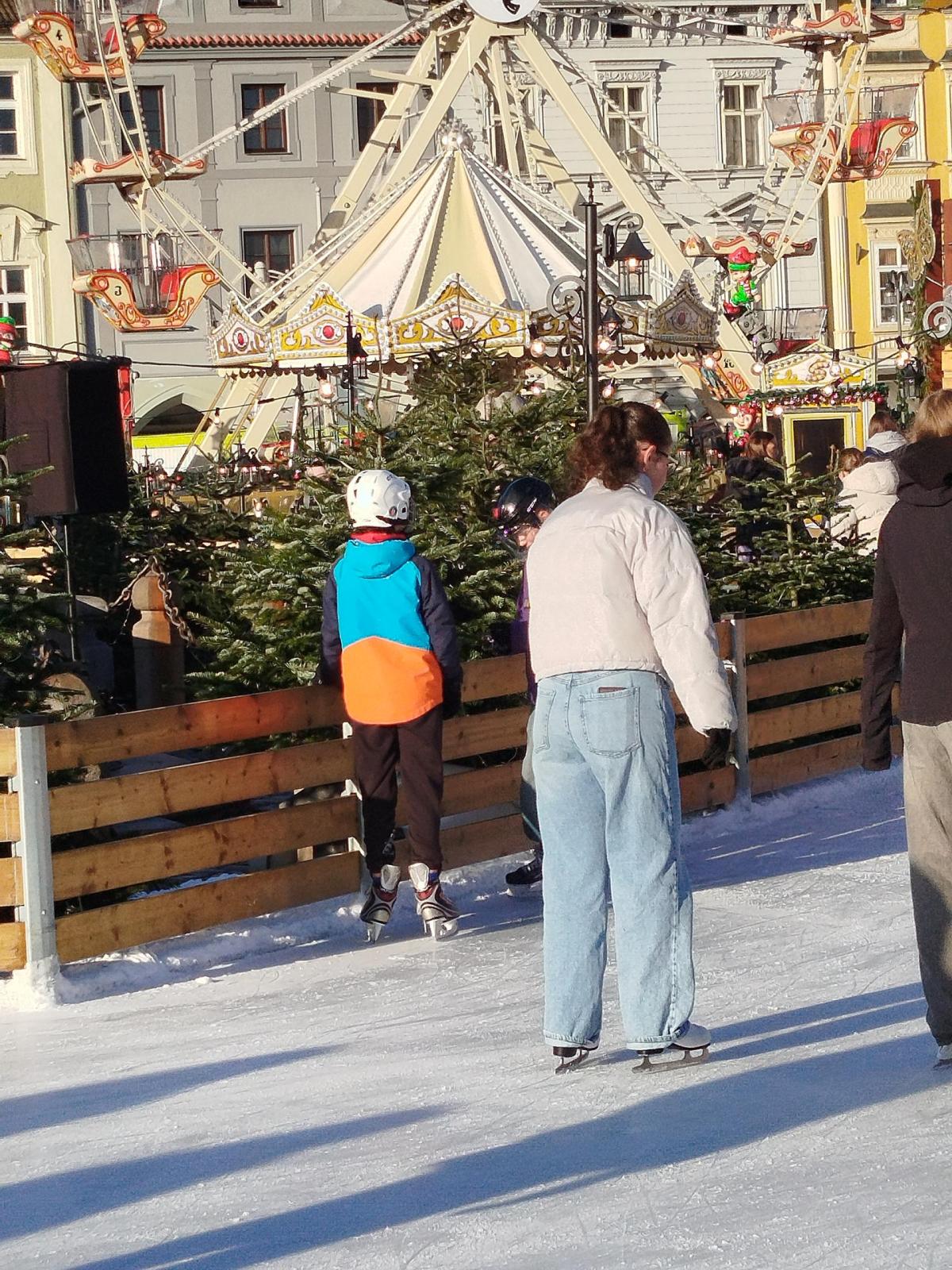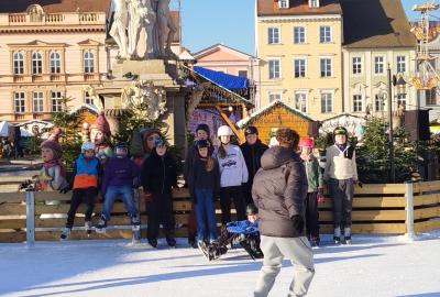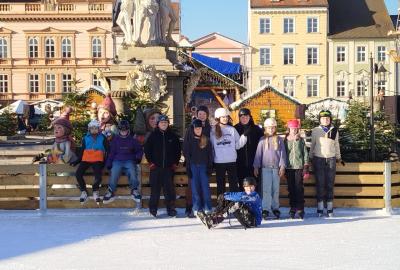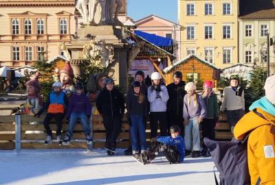 V Č. Budějovicích jsme na Lannově třídě narazili na Humanoidy a hned jsme začali tvořit fotodokumentaci naší výpravy. Po krátké procházce parkem byla naší další zastávkou perníková chaloupka. Naštěstí bez obyvatelky, takže jsme mohli ve stejném počtu pokračovat směr náměstí Přemysla Otakara II. U Černé věže jsme navštívili katedrálu sv. Mikuláše a poté spěchali za cílem naší cesty. Tím bylo kluziště, které obklopovalo celou Samsonovu kašnu. Sluníčko stále svítilo, modrá obloha - takže už jen zbývalo obout brusle a vyrazit. Všechny děti vybaveny vlastními nebo půjčenými bruslemi si celou hodinku super užily.